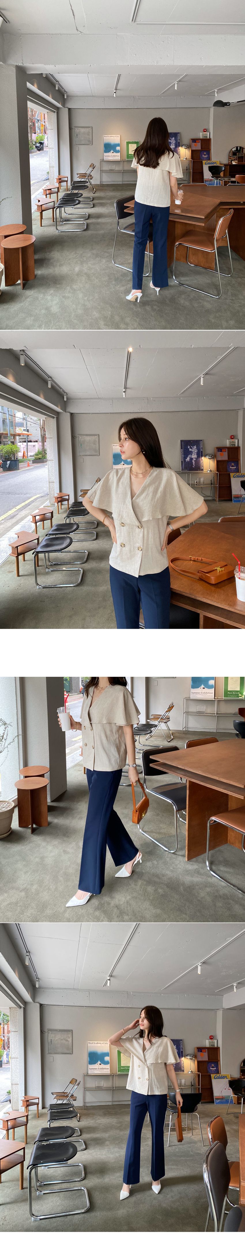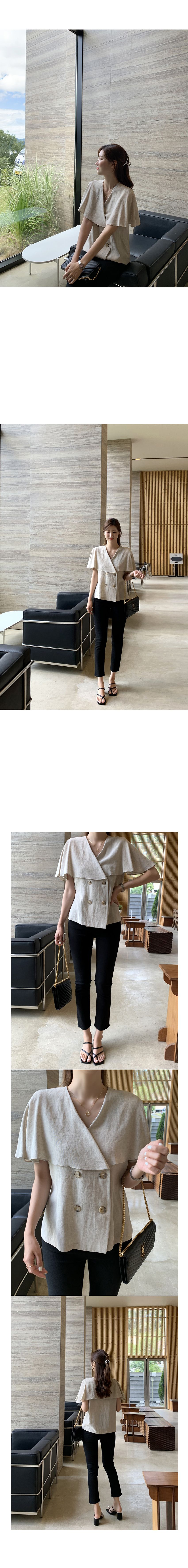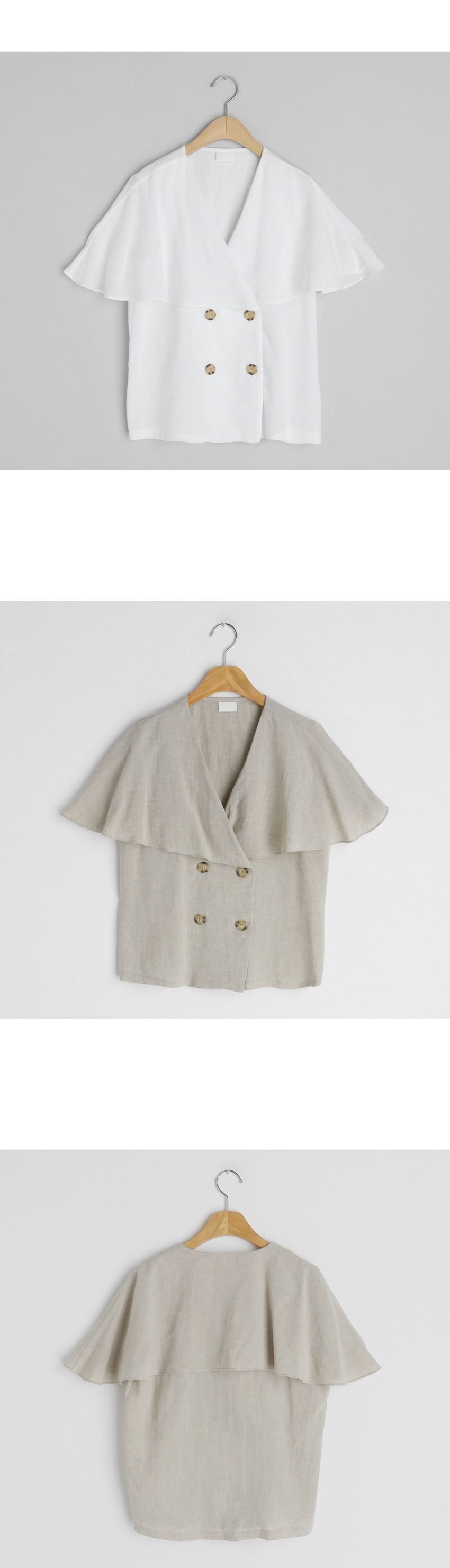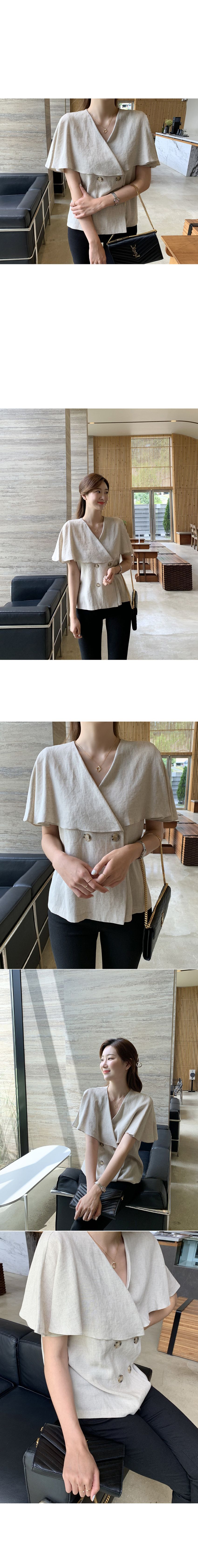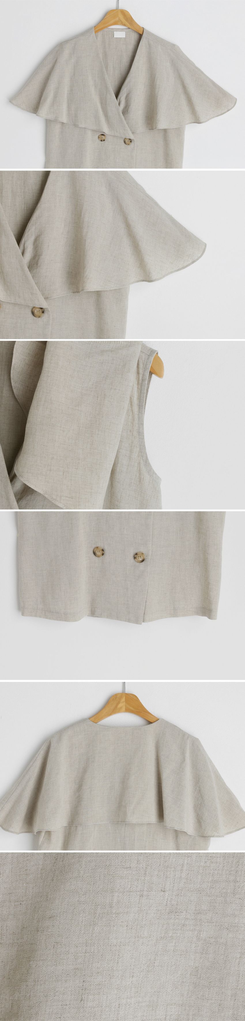 40%linen 60%tencel這款設計很別出新意V領交錯雙排釦設計大圓領像小斗篷批肩的感覺小斗篷剛好會遮住手臂最肉的地方 穿起來不會顯壯搭配裙裝或褲裝都可以呈現不一樣的風格這款領口沒有暗釦 直接穿會建議要搭配內搭避免彎腰會曝光或是建議要買這件的話 可以試穿以後 以自己的身形在領口適當的地方縫一顆暗釦 就可以直接穿不怕曝光了