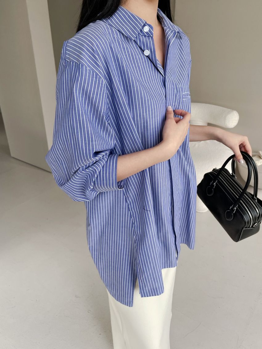 (條紋)斜角剪裁隱藏釦襯衫(直播影片)