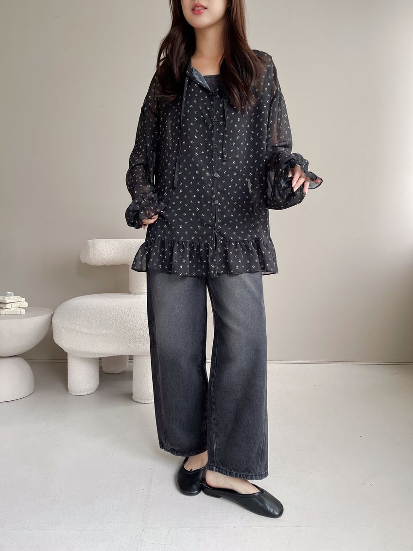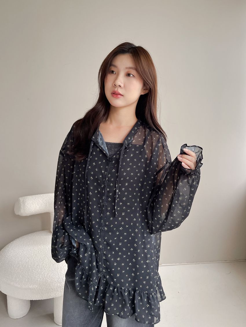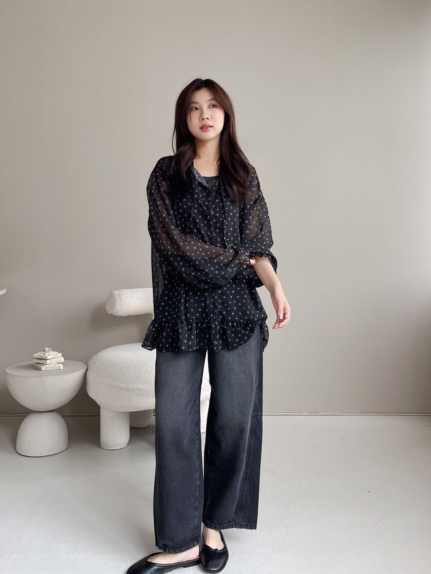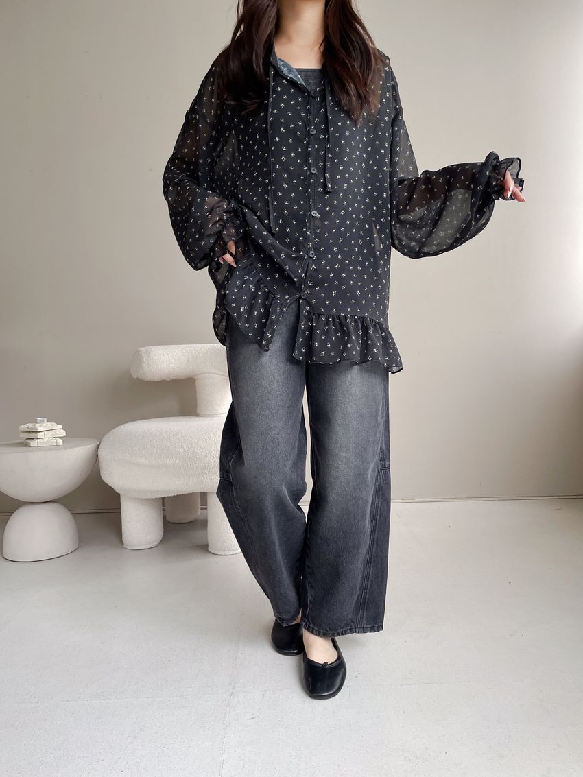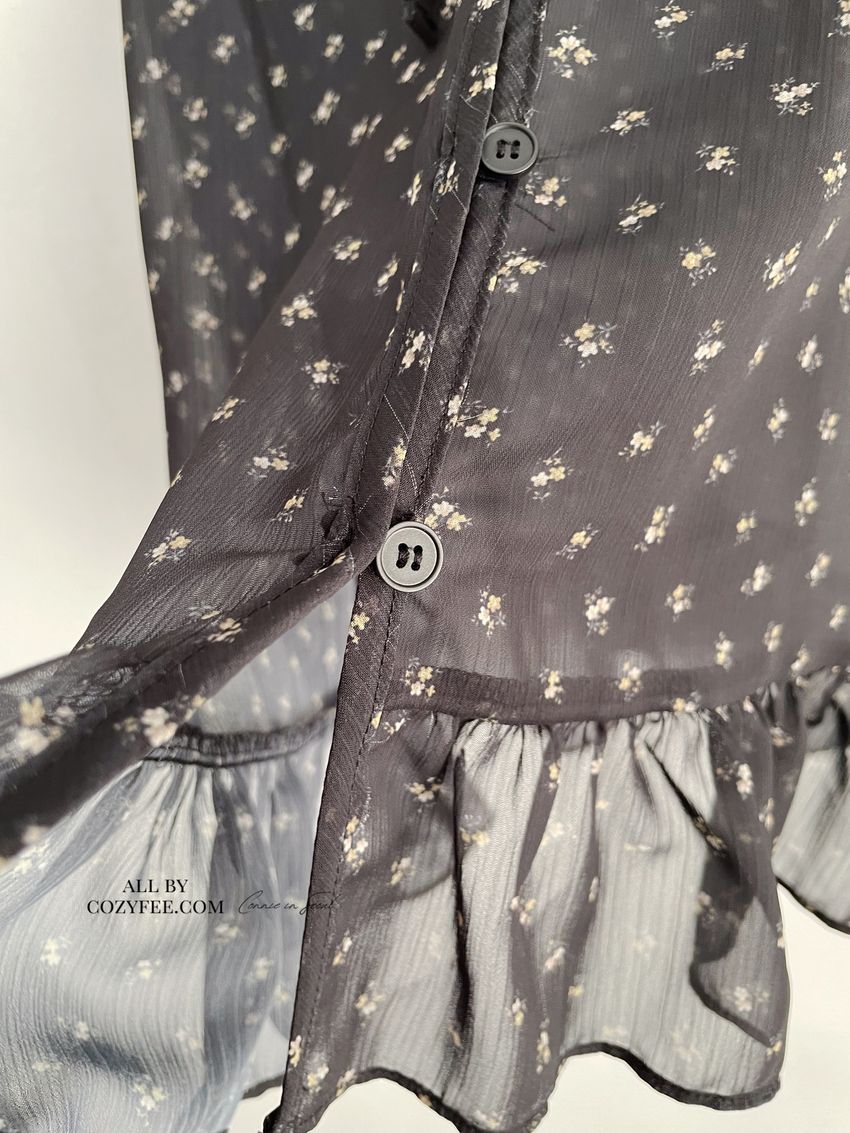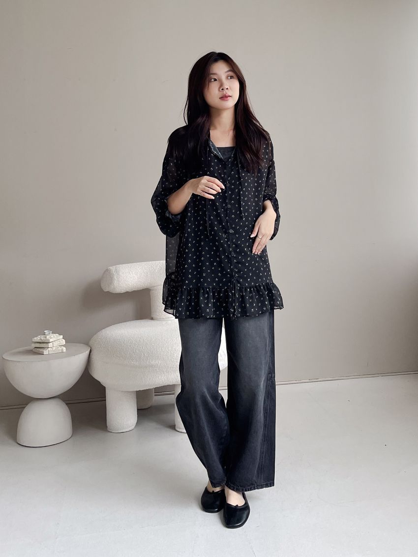 > 碎花綁帶下荷葉雪紡衫