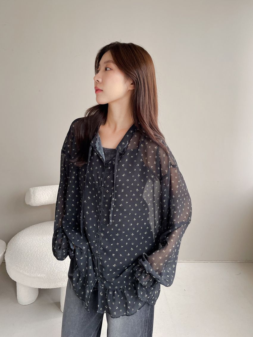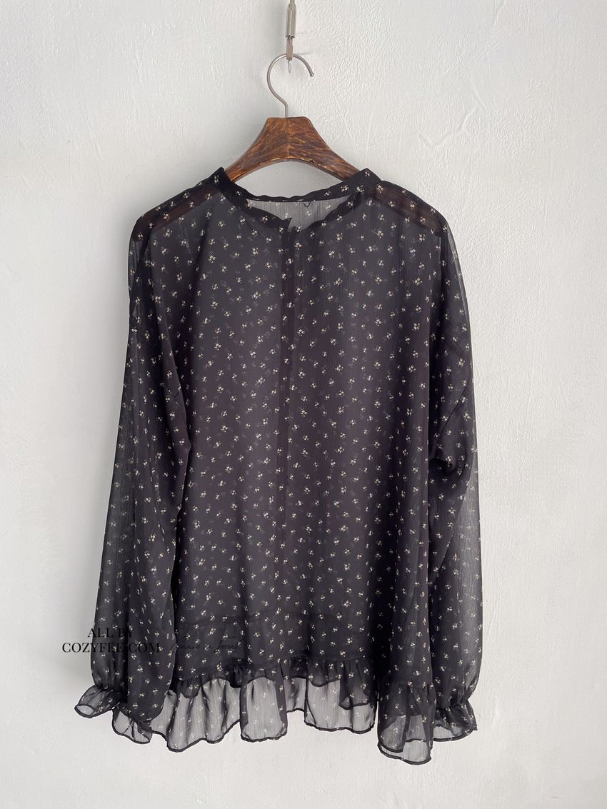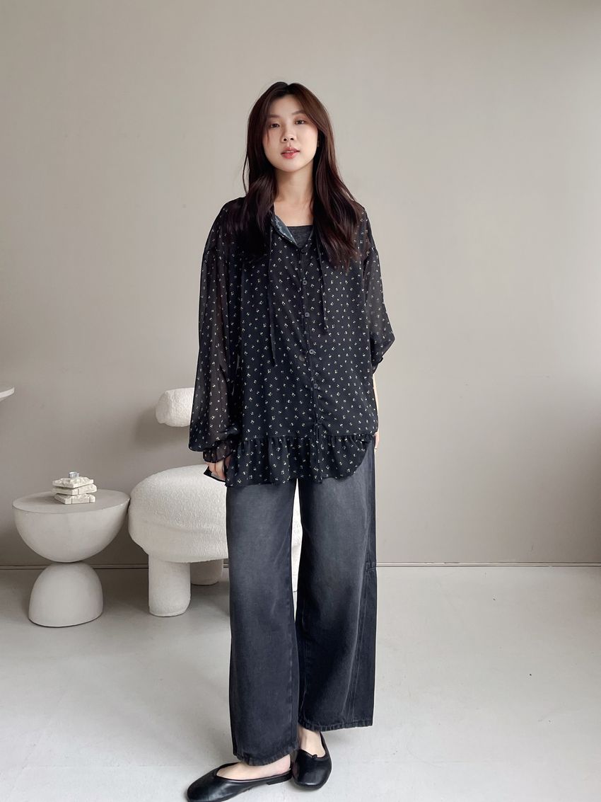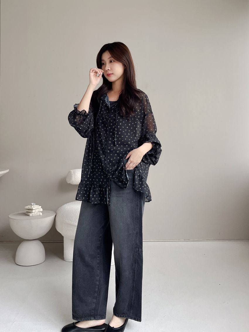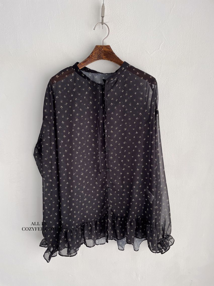 > 碎花綁帶下荷葉雪紡衫
