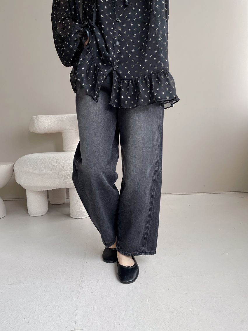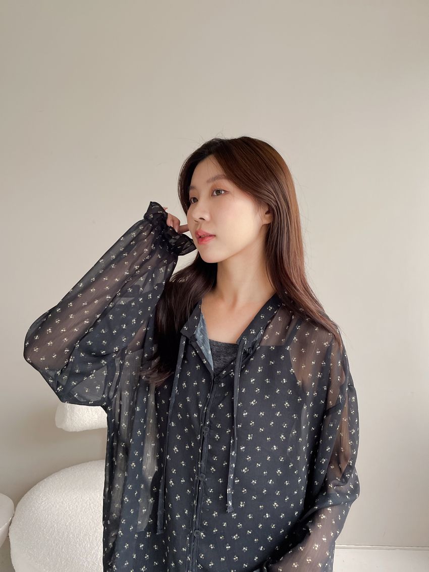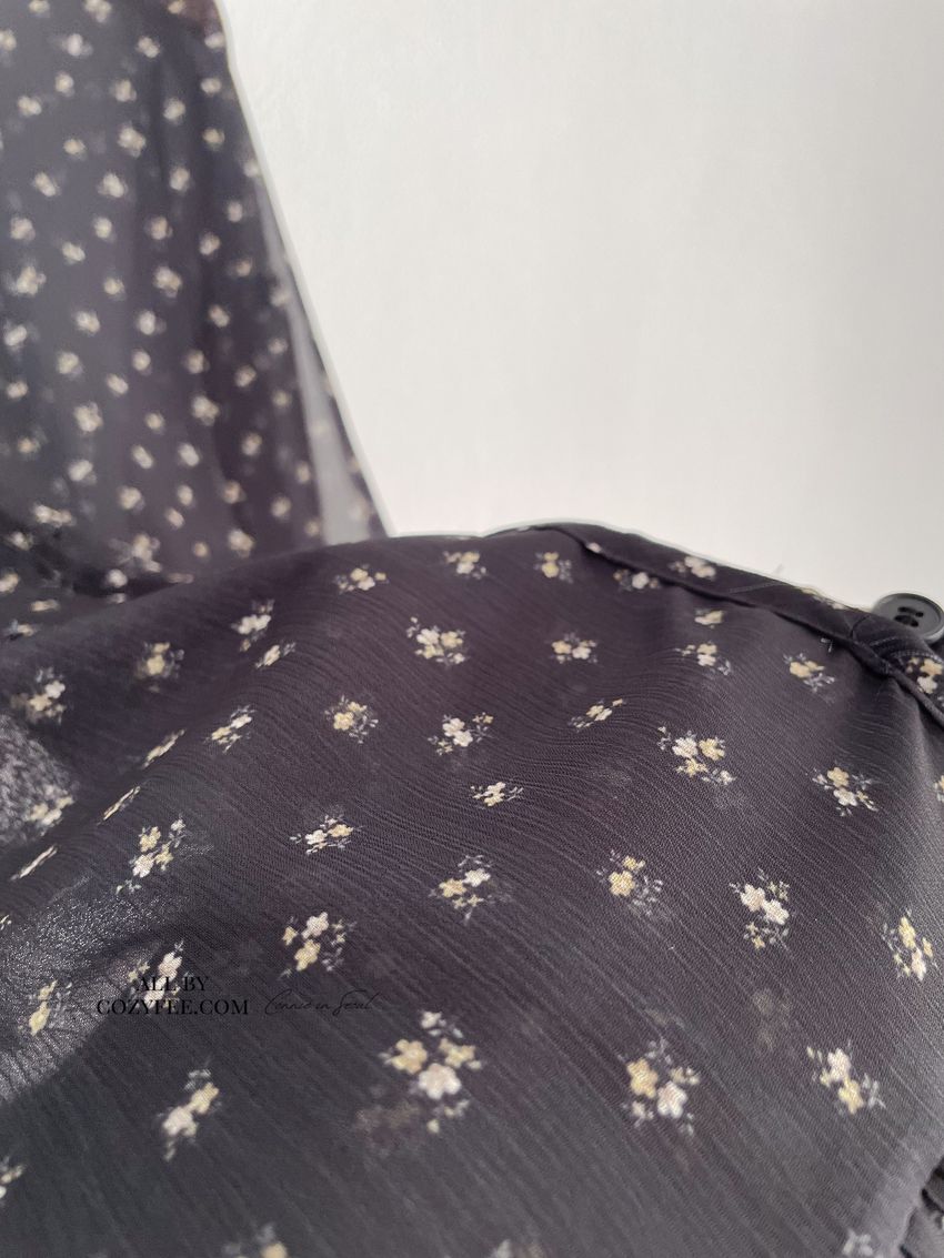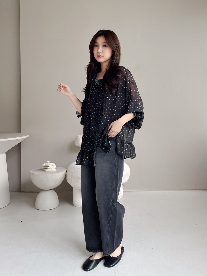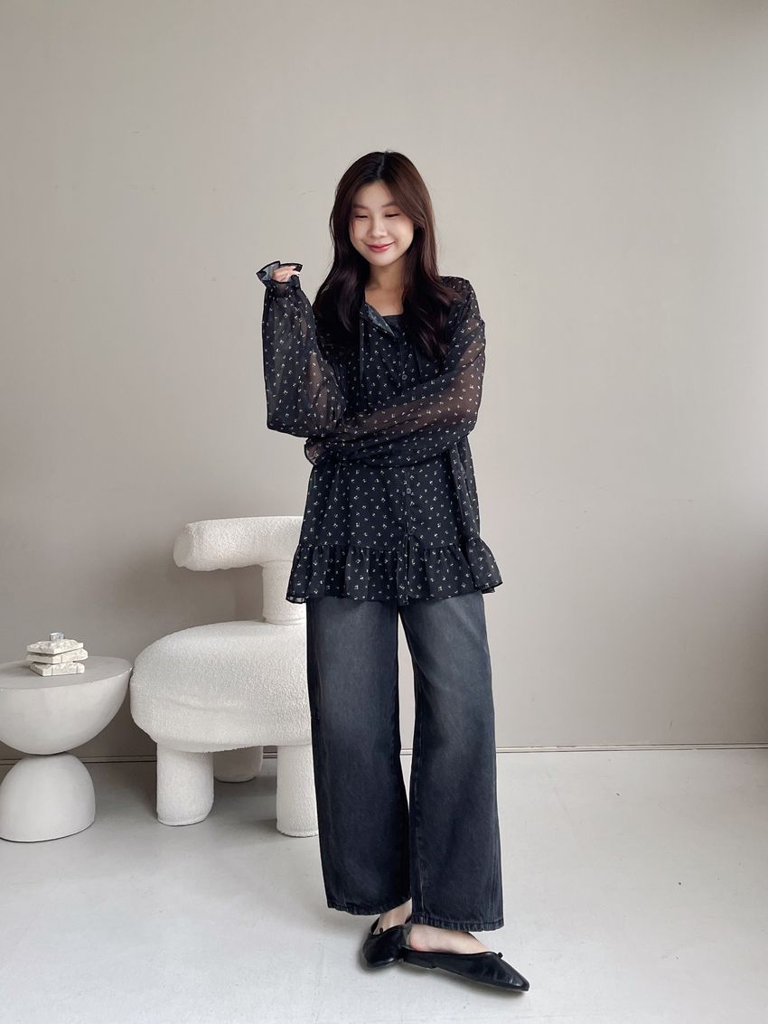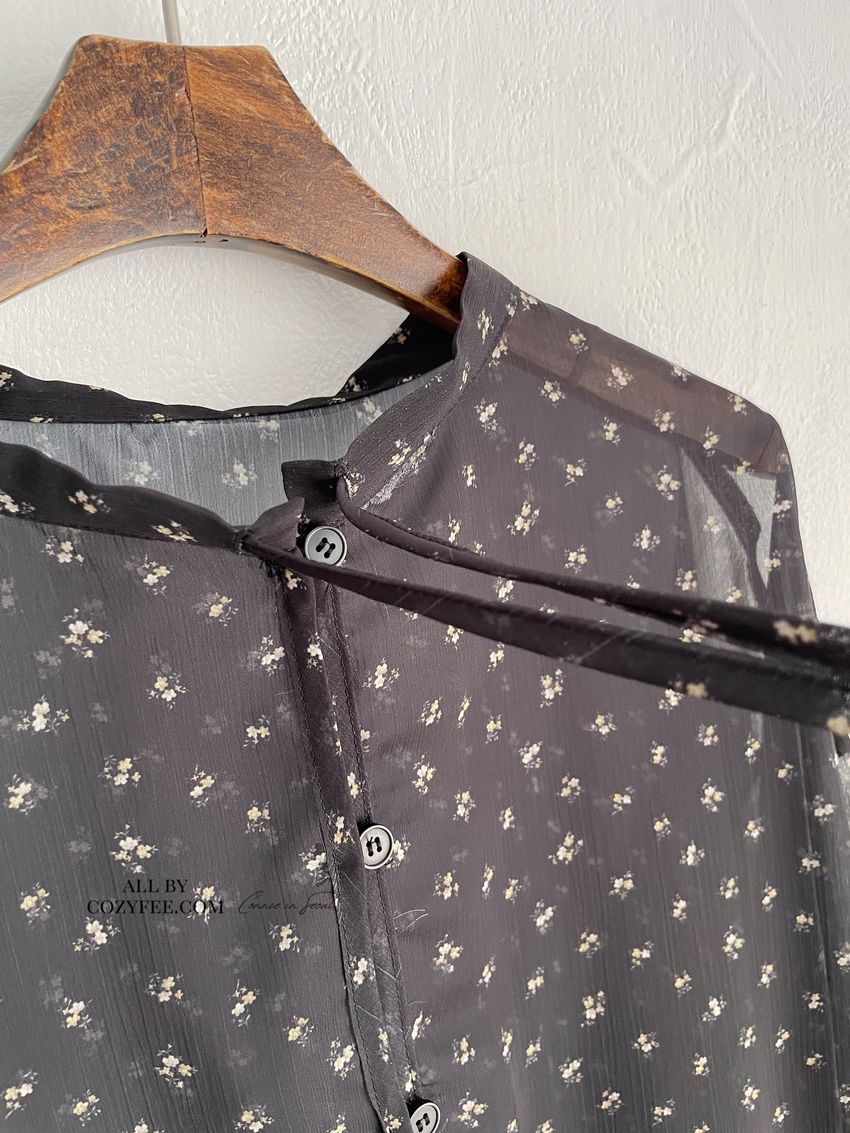 > 碎花綁帶下荷葉雪紡衫