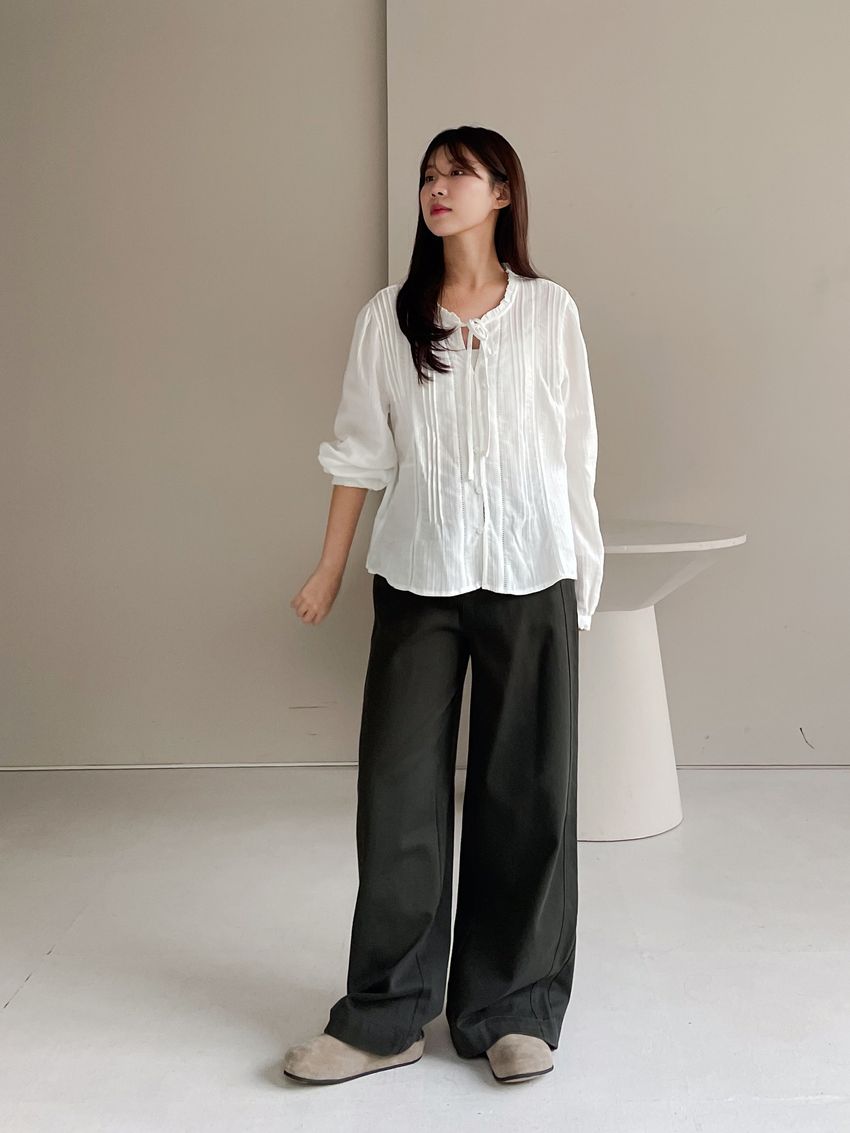 > 荷葉滾領壓摺布蕾衫