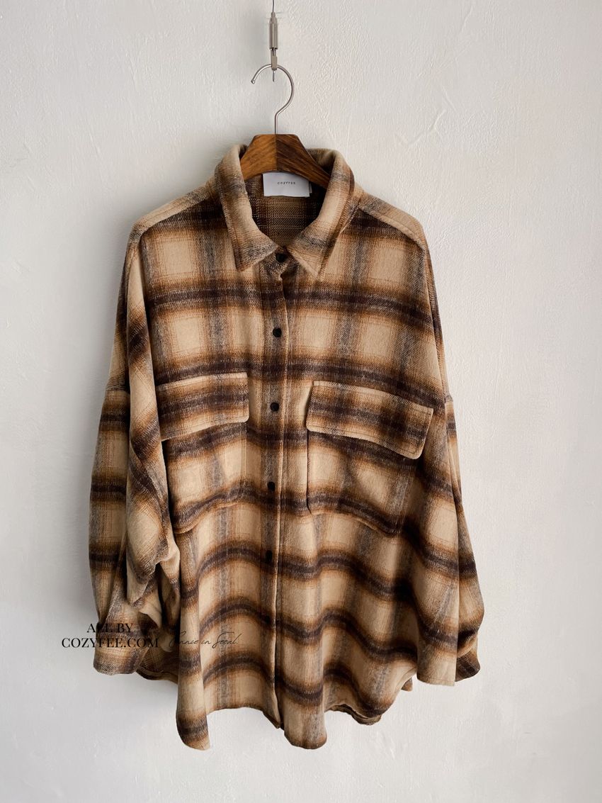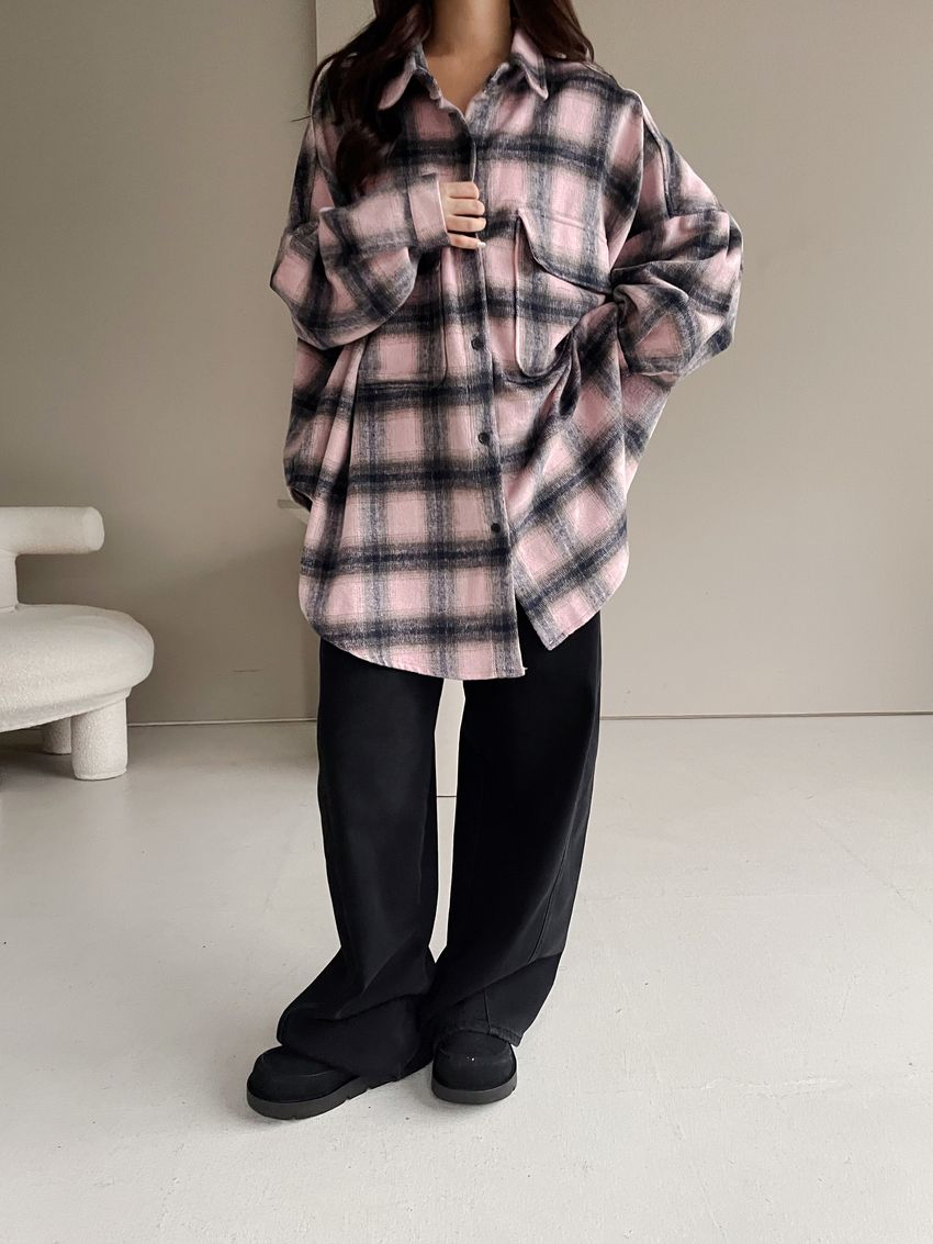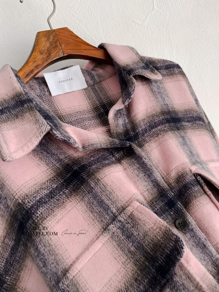 > 格紋翻蓋口袋毛呢長版襯衫