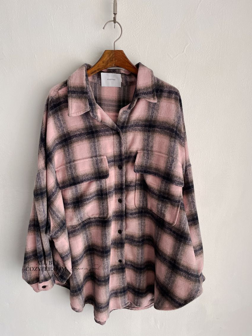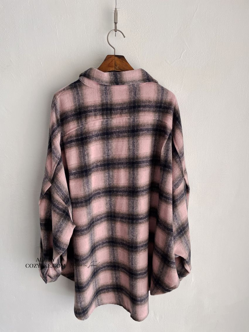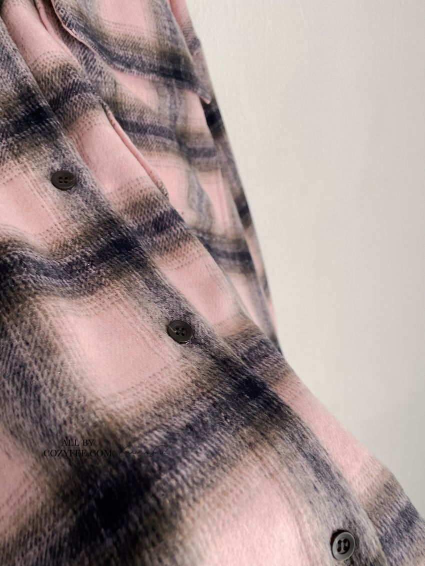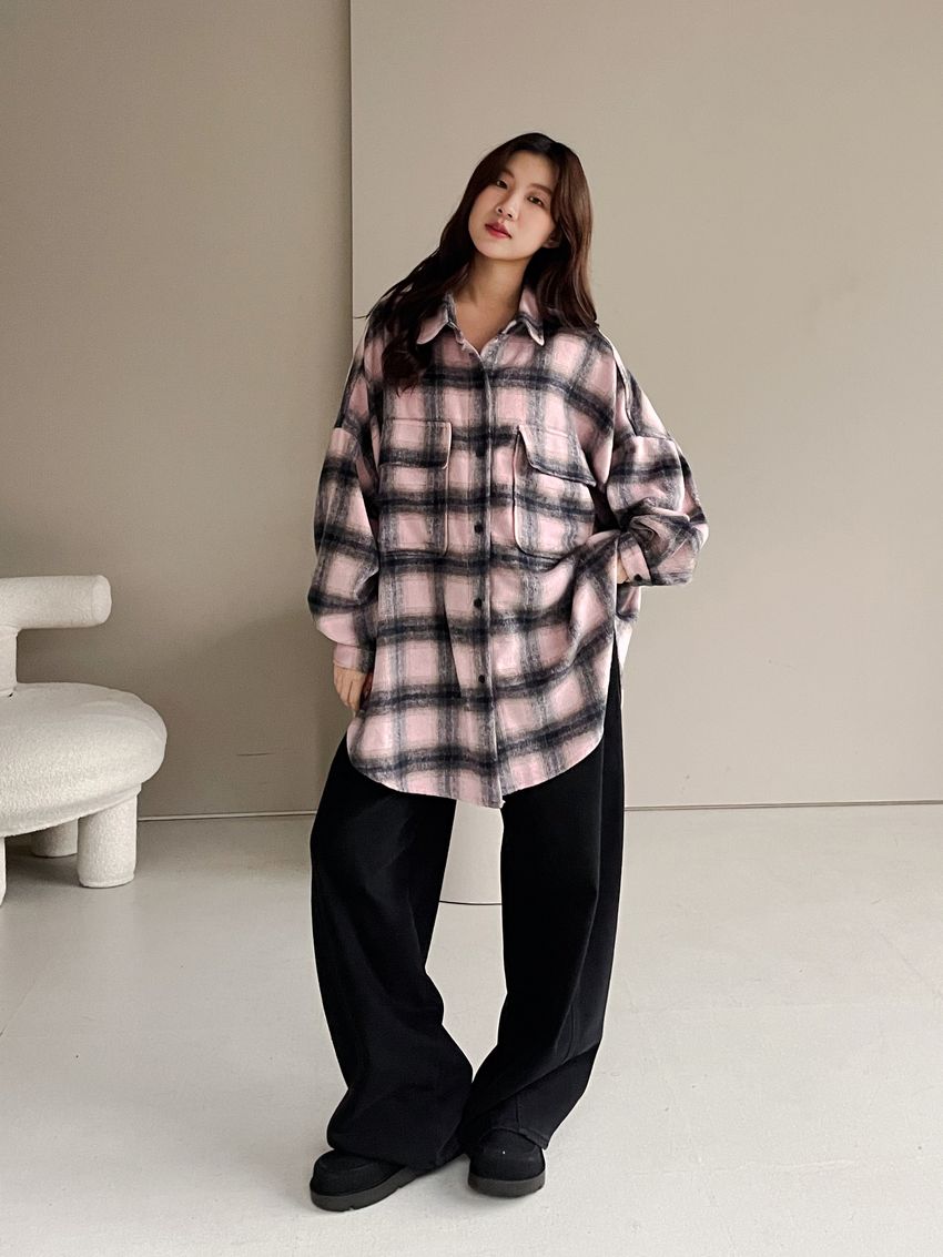 > 格紋翻蓋口袋毛呢長版襯衫