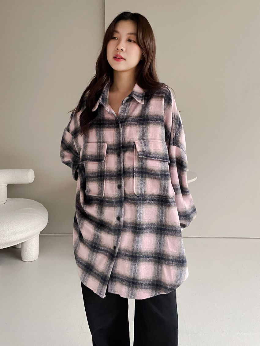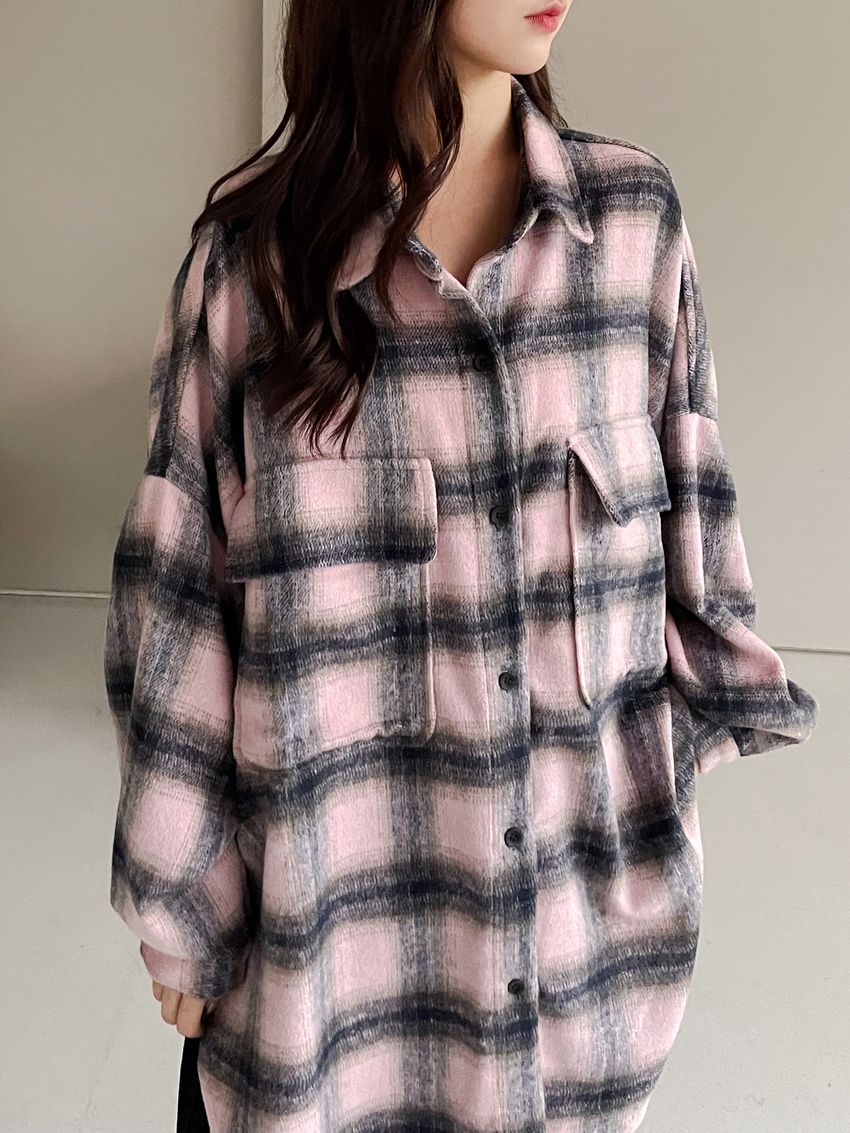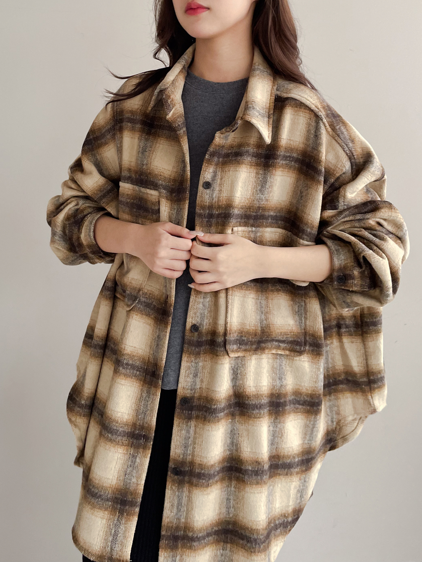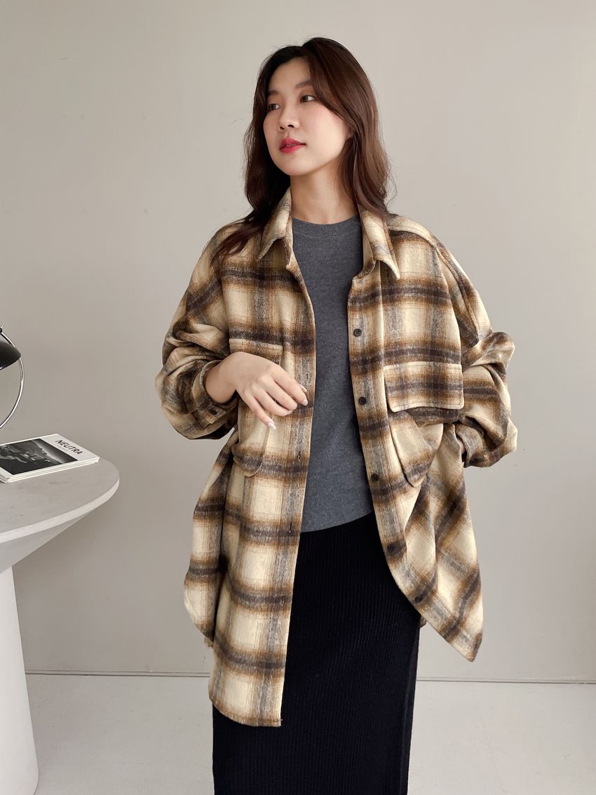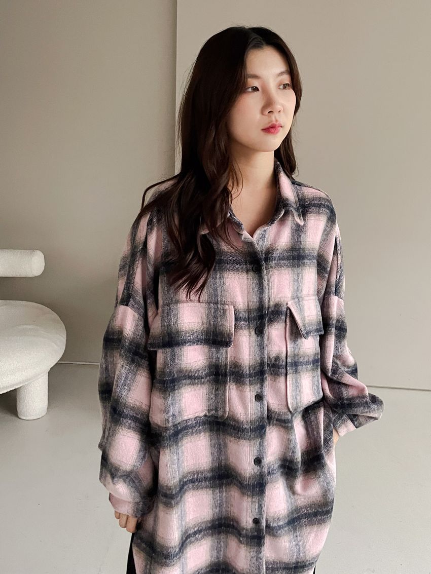格紋翻蓋口袋毛呢長版襯衫