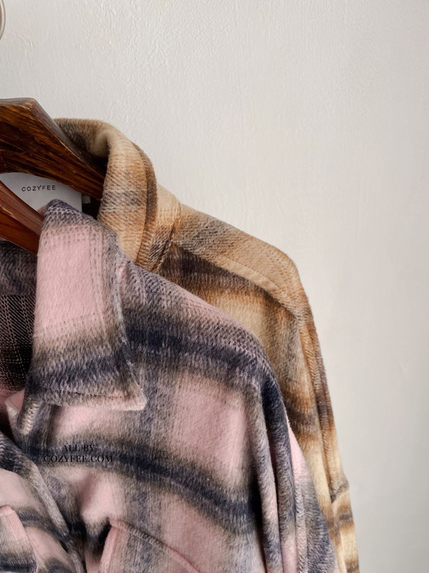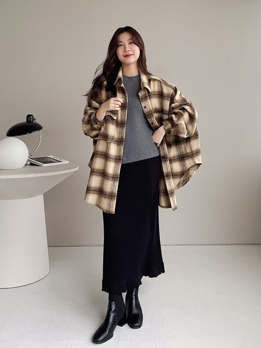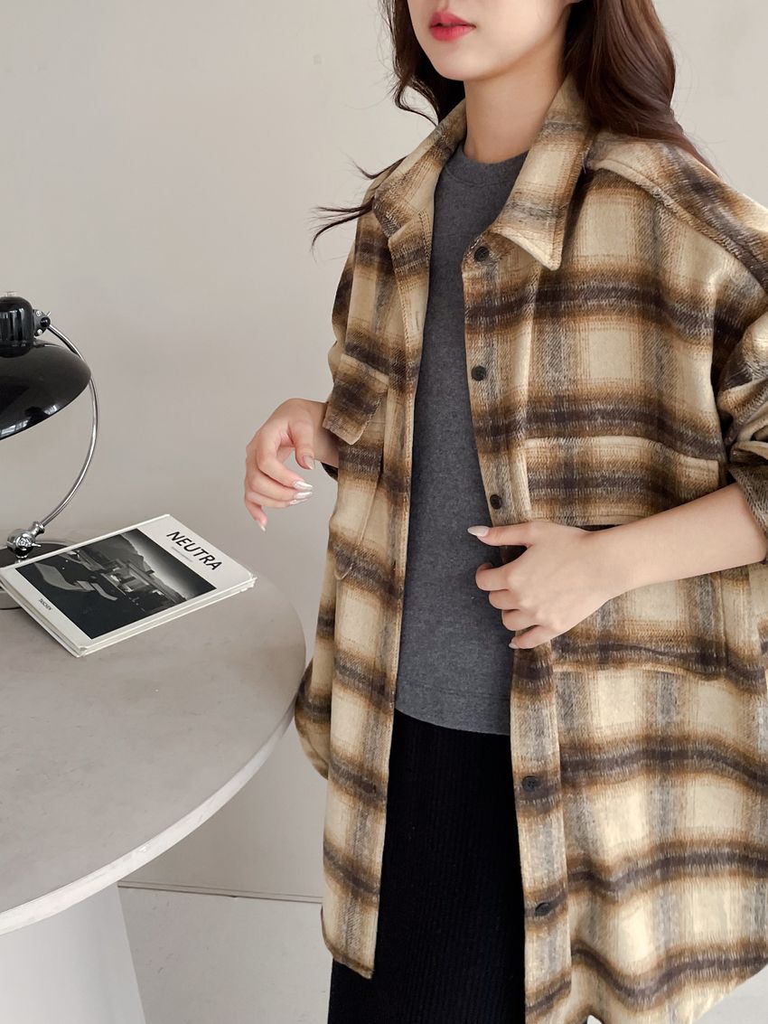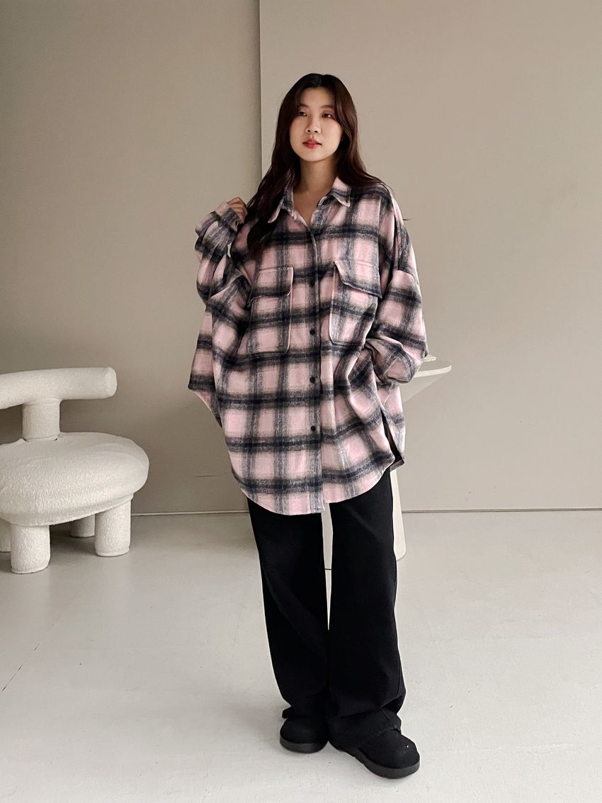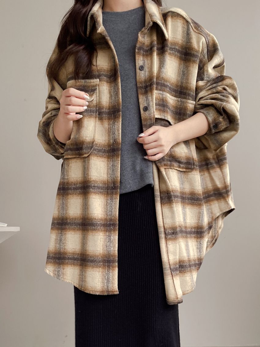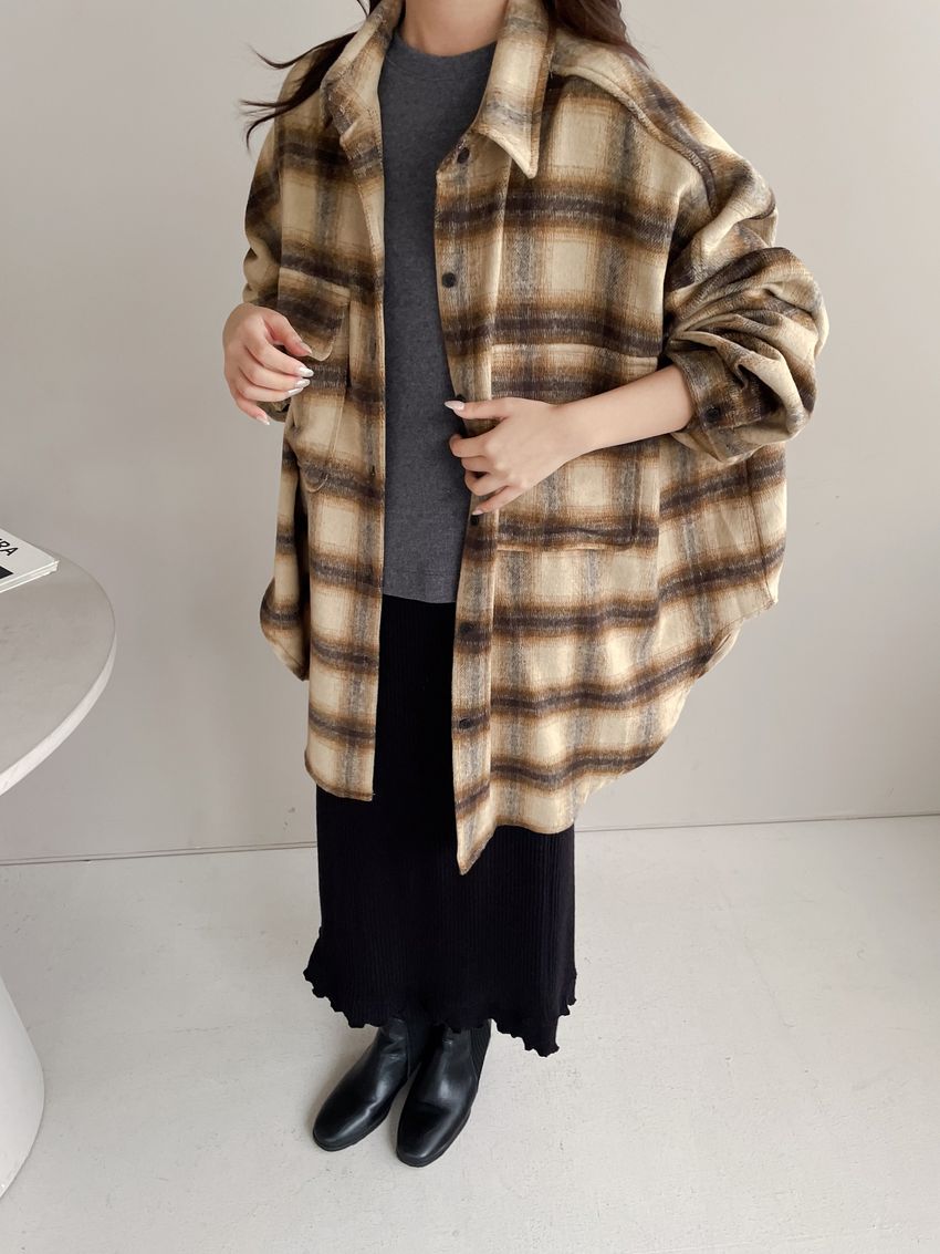 格紋翻蓋口袋毛呢長版襯衫