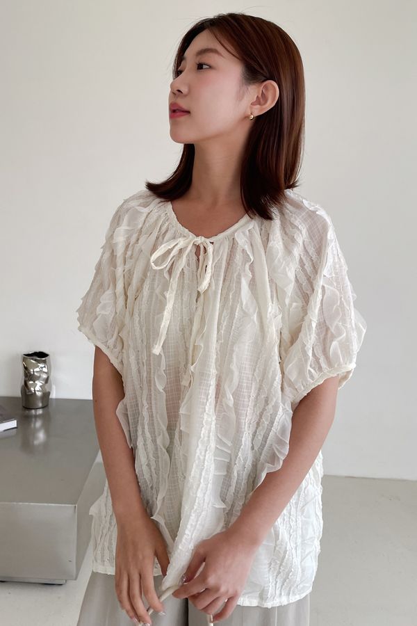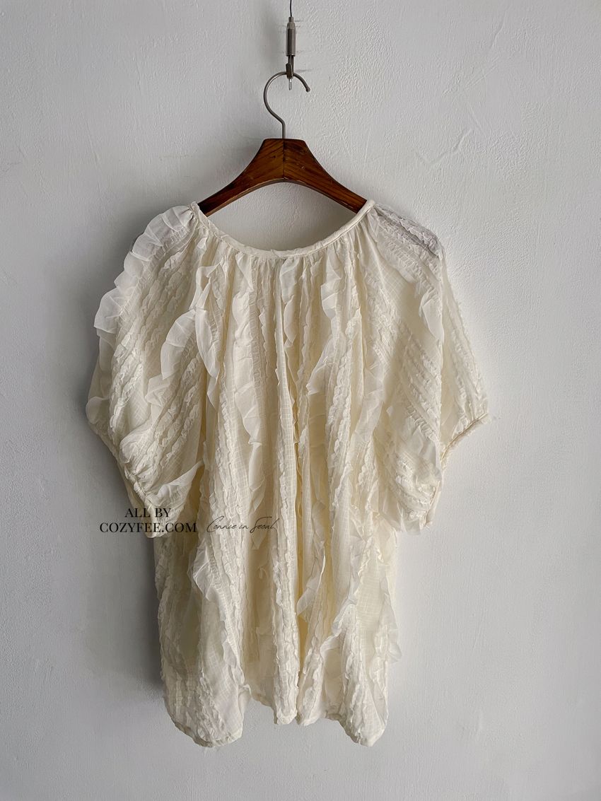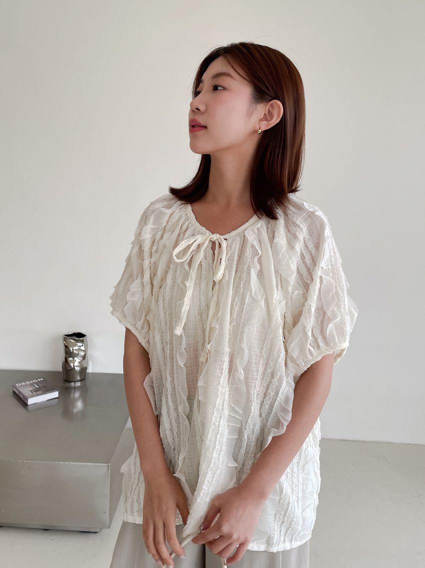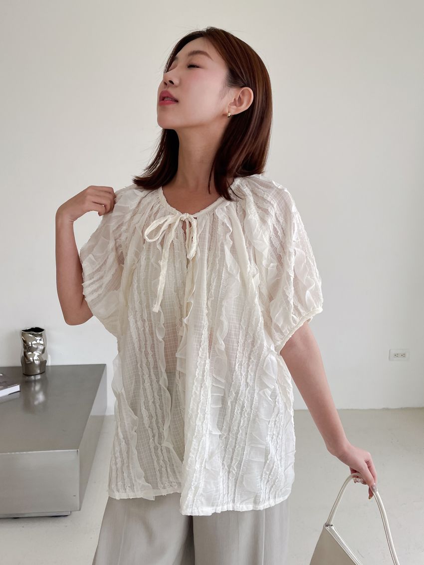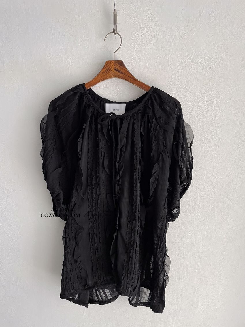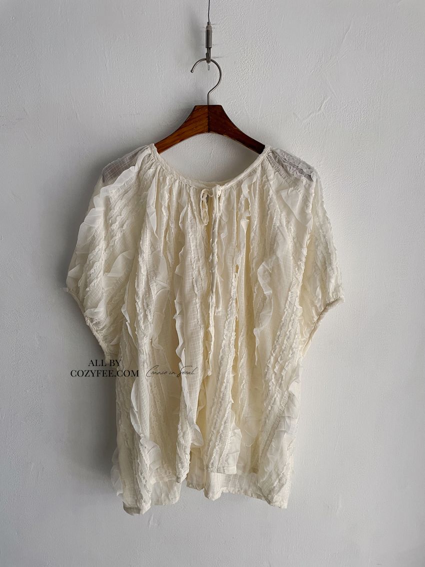 > 紛飛花紗綁帶領雪紡衫