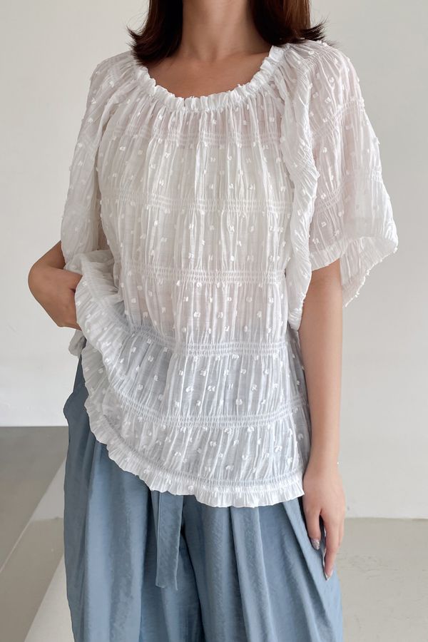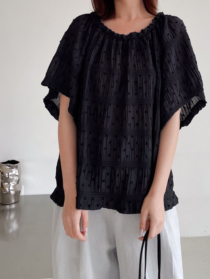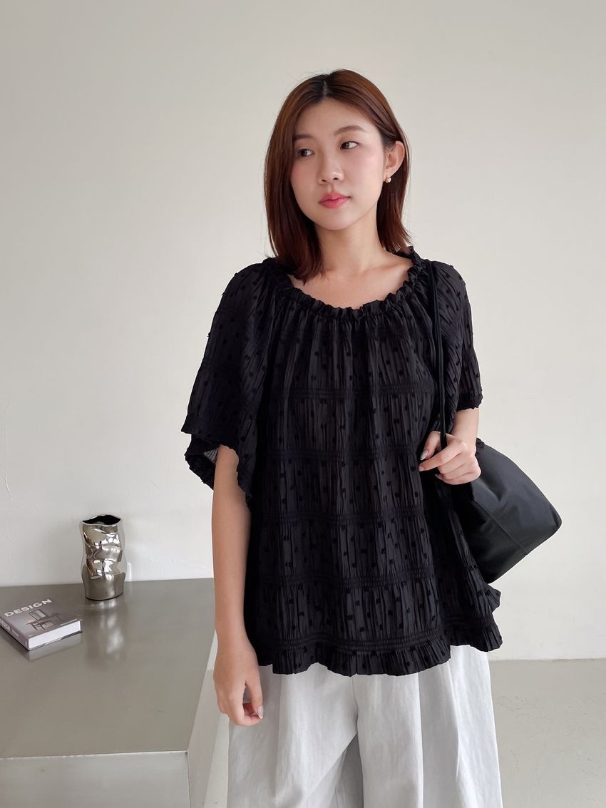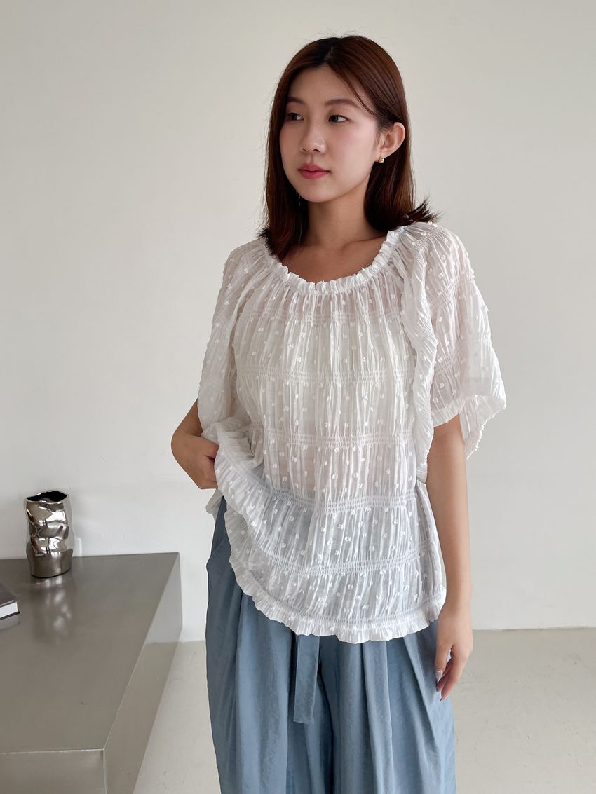 Connie推薦款!植絨點點鬆緊皺折雪紡衫