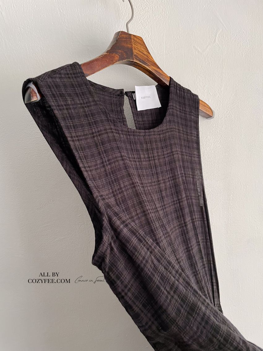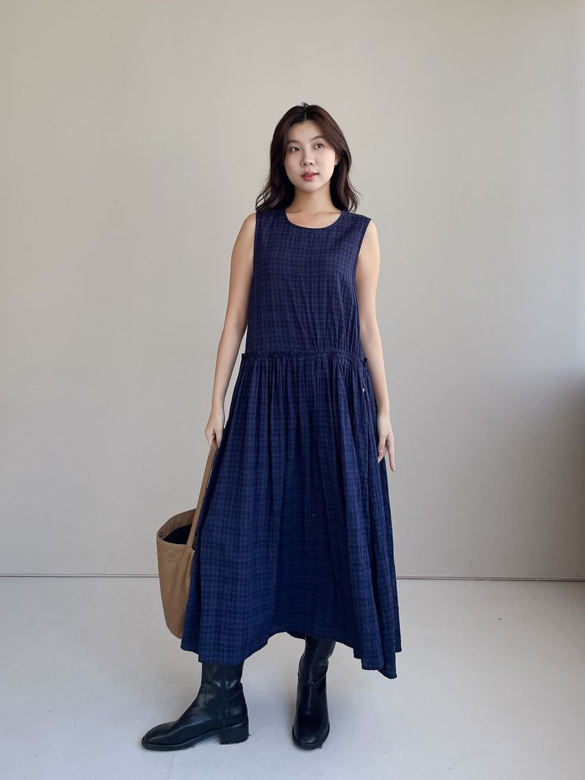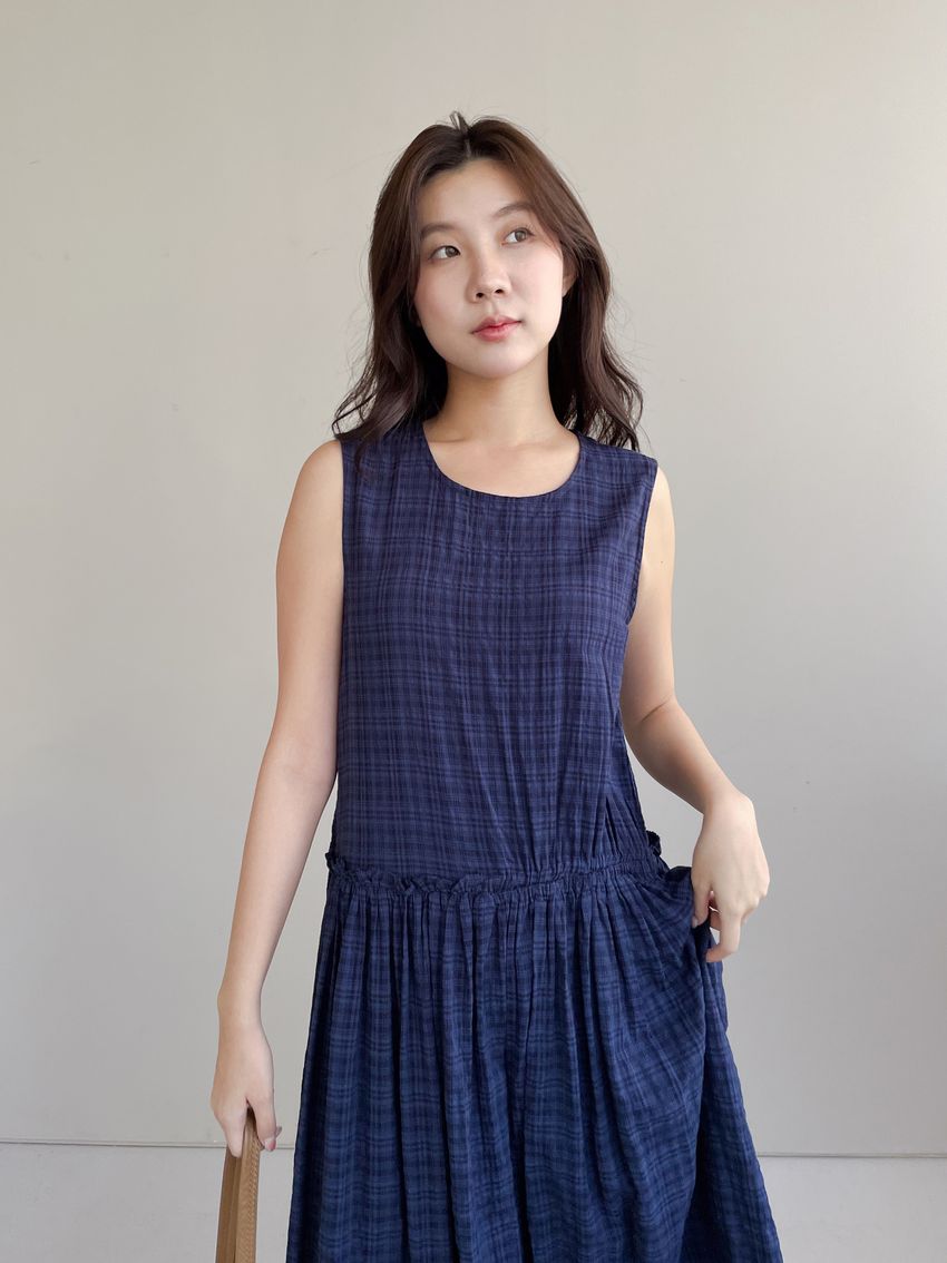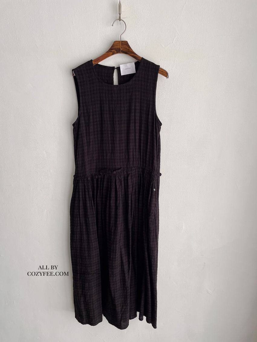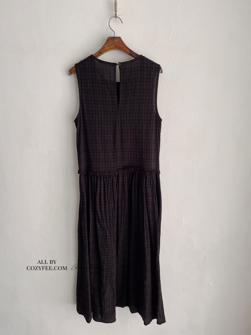 文青小格長版背心洋裝