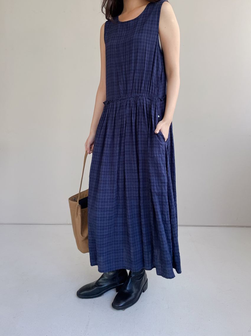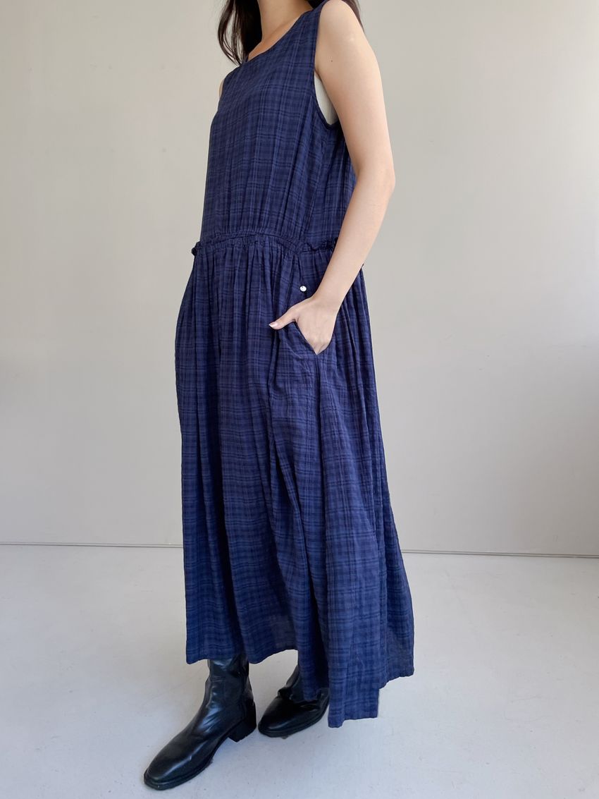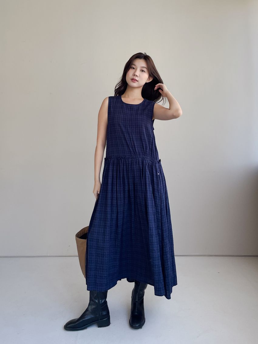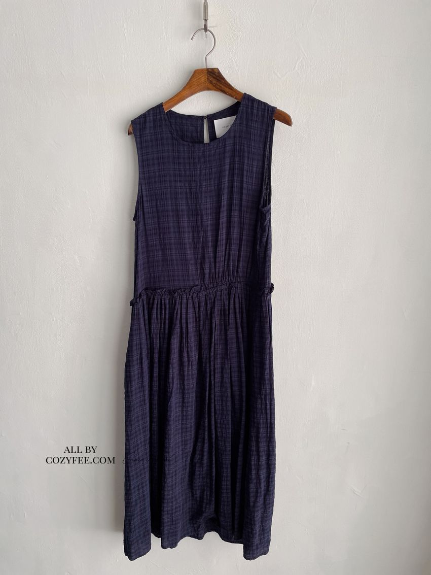 文青小格長版背心洋裝