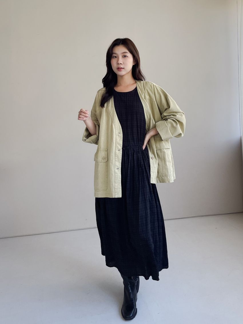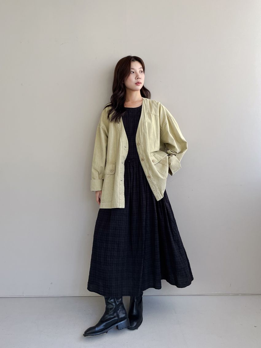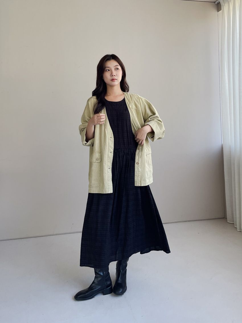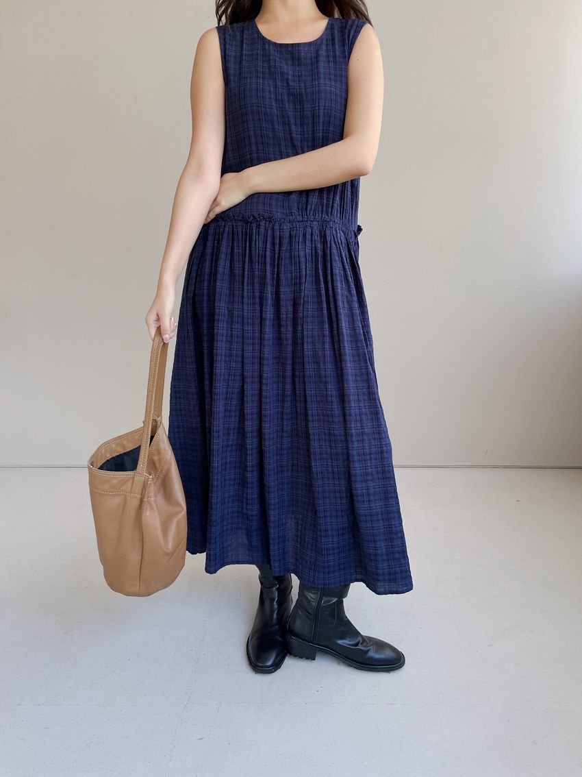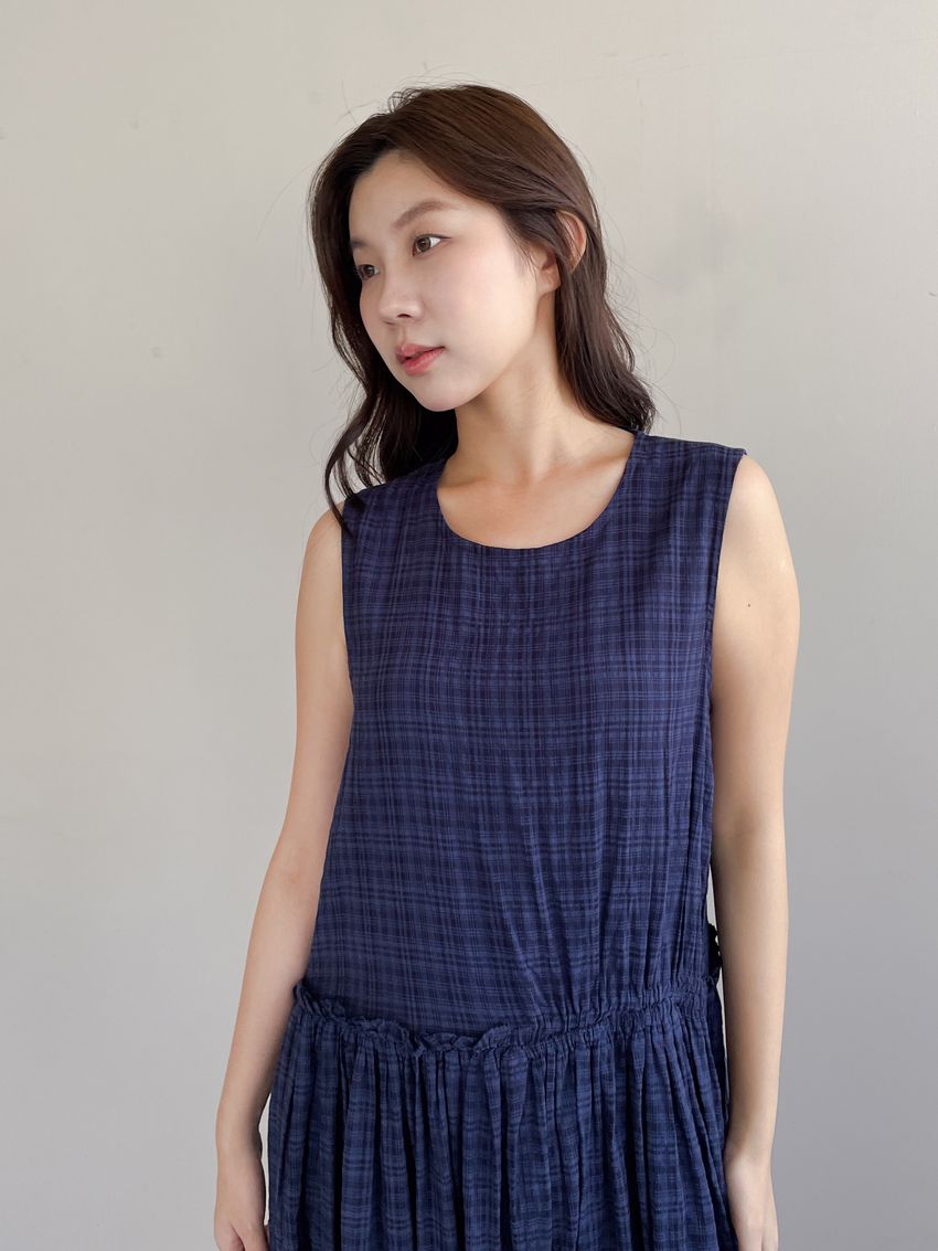 文青小格長版背心洋裝