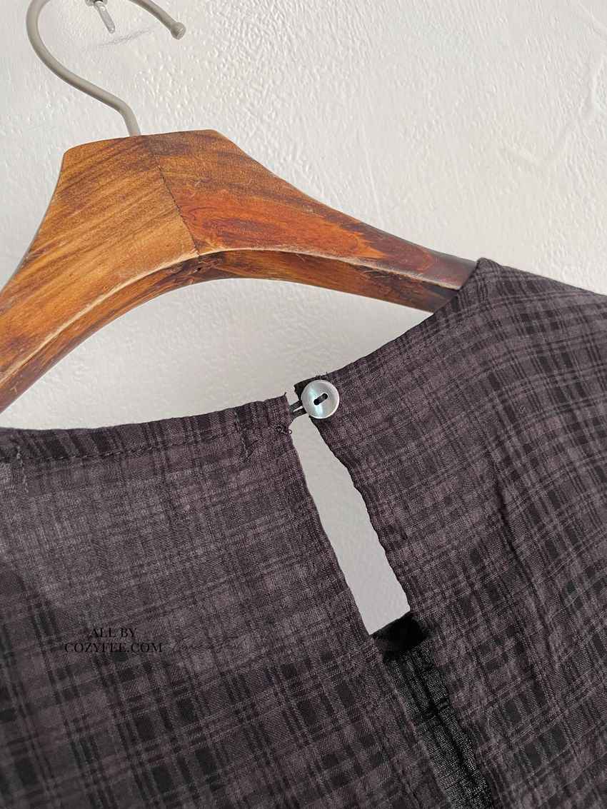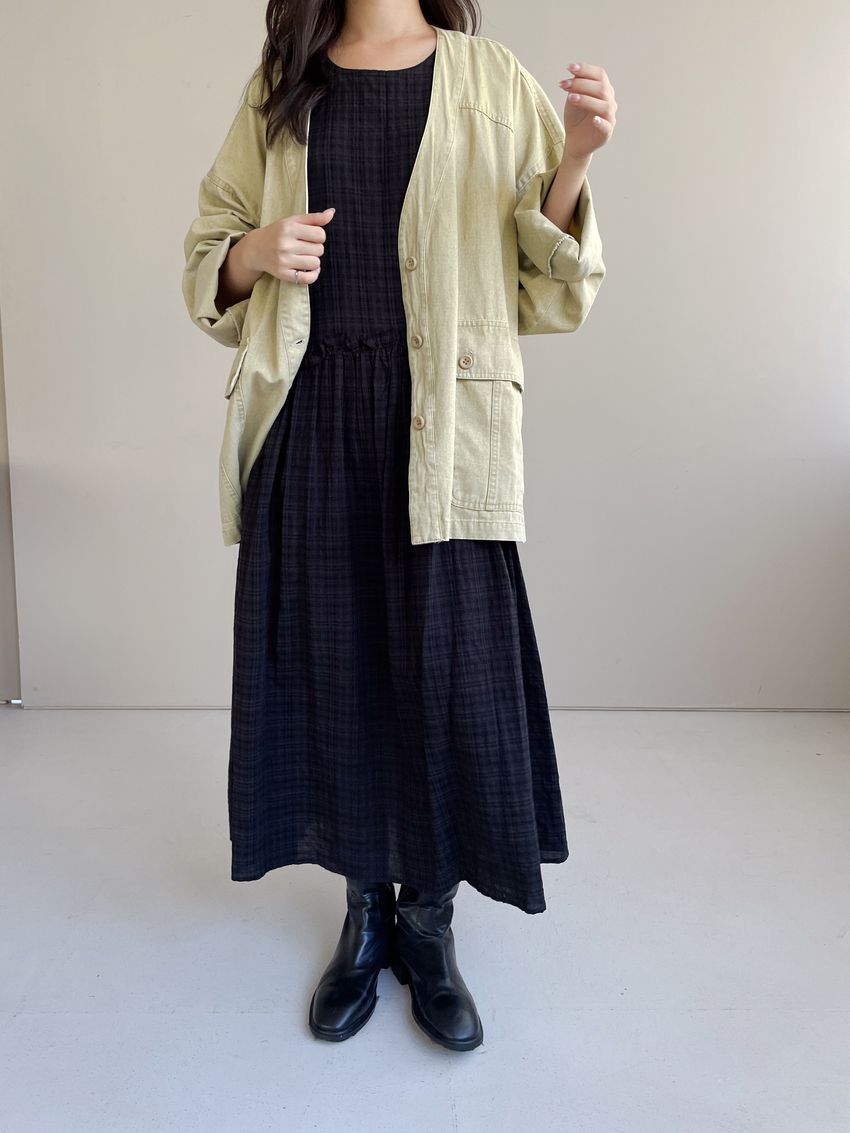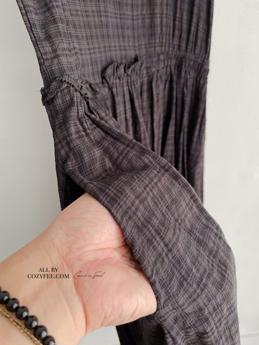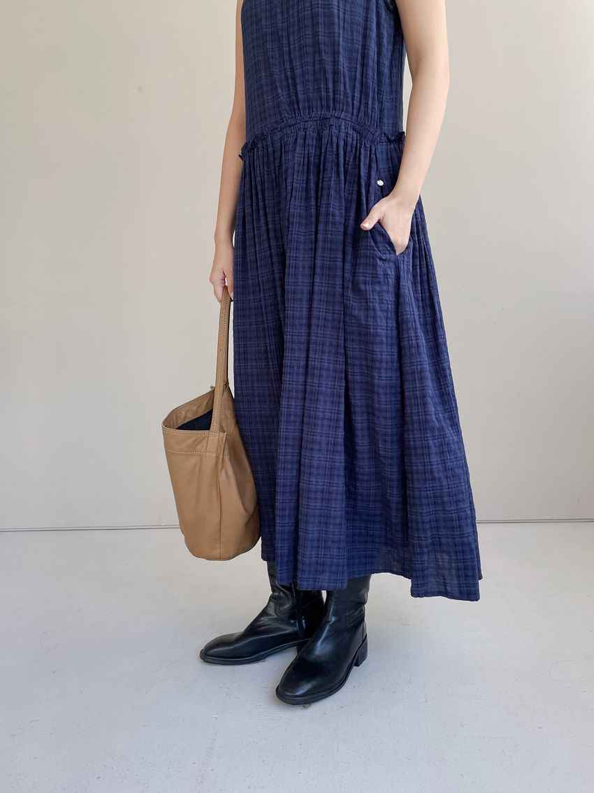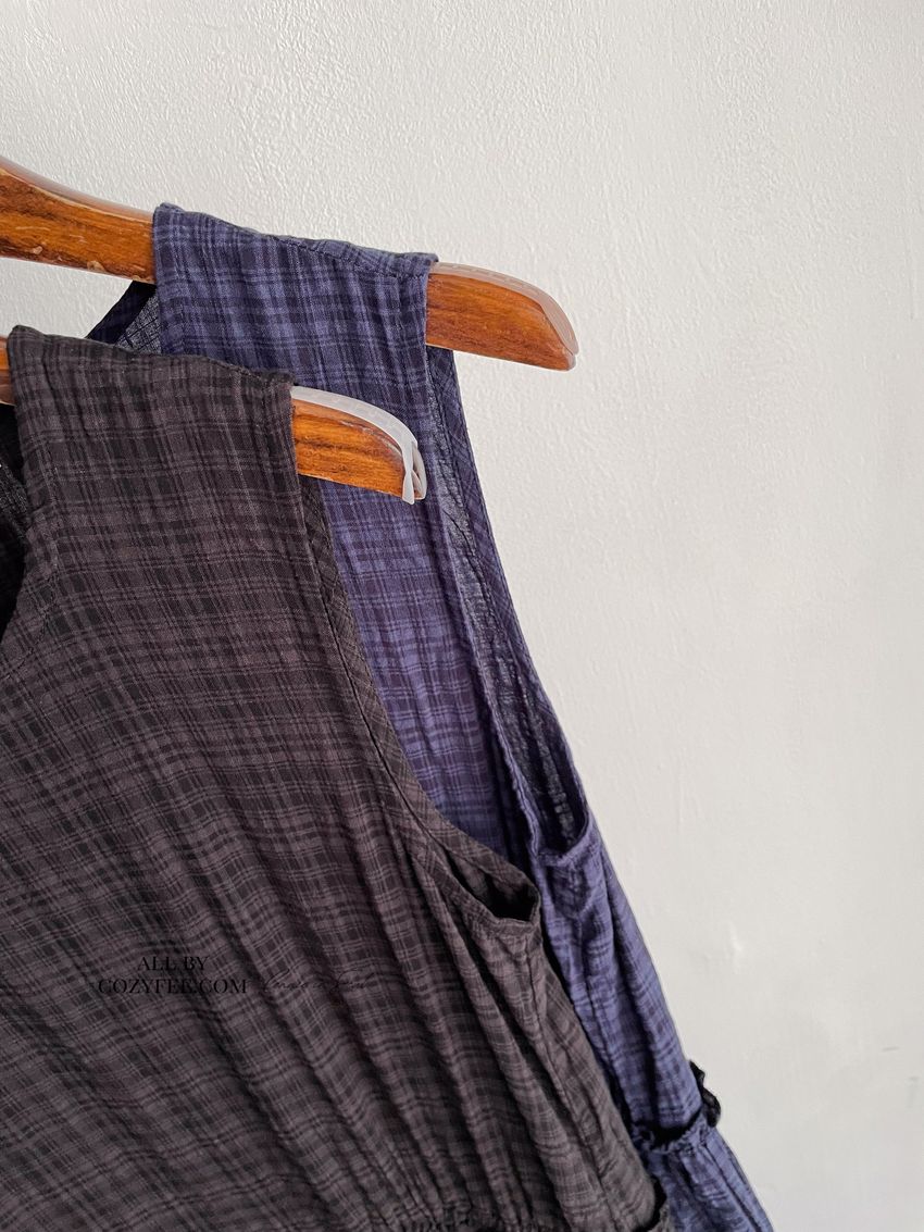> 文青小格長版背心洋裝