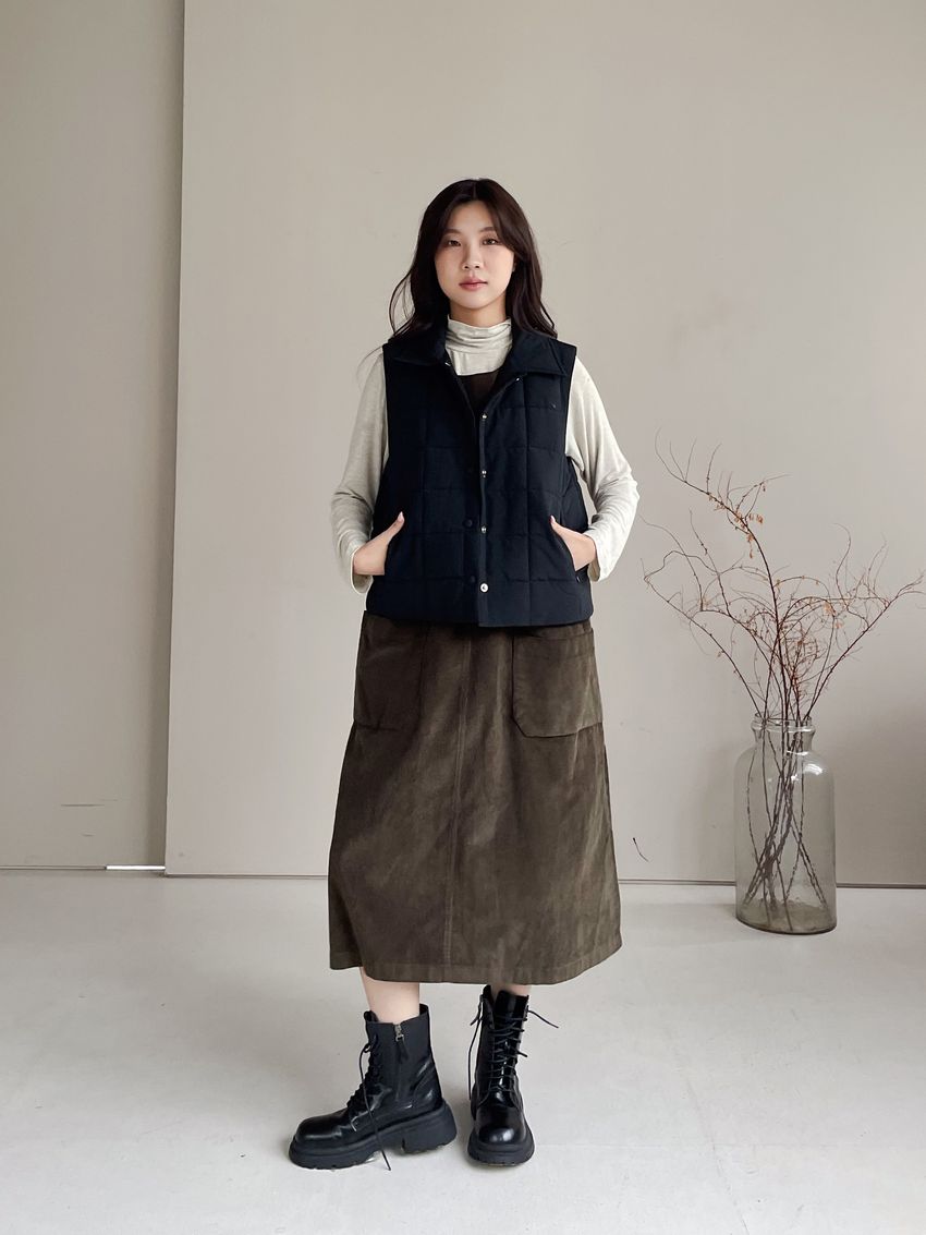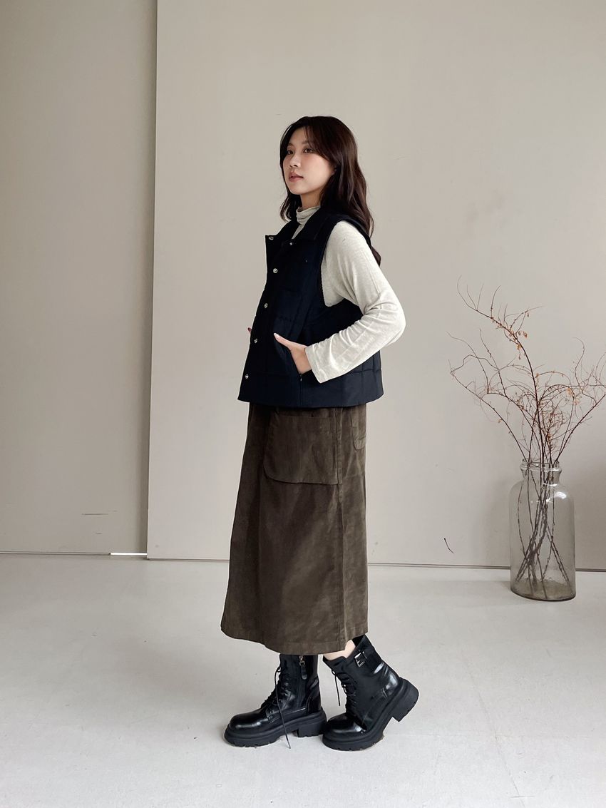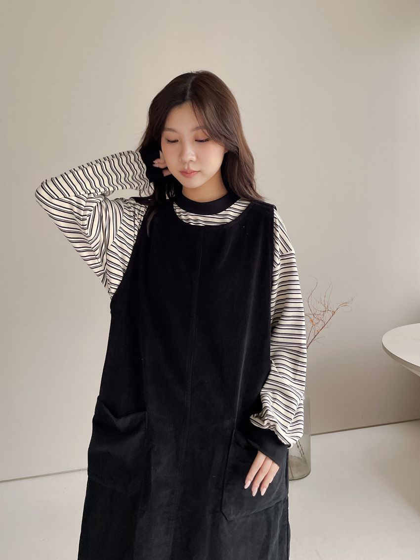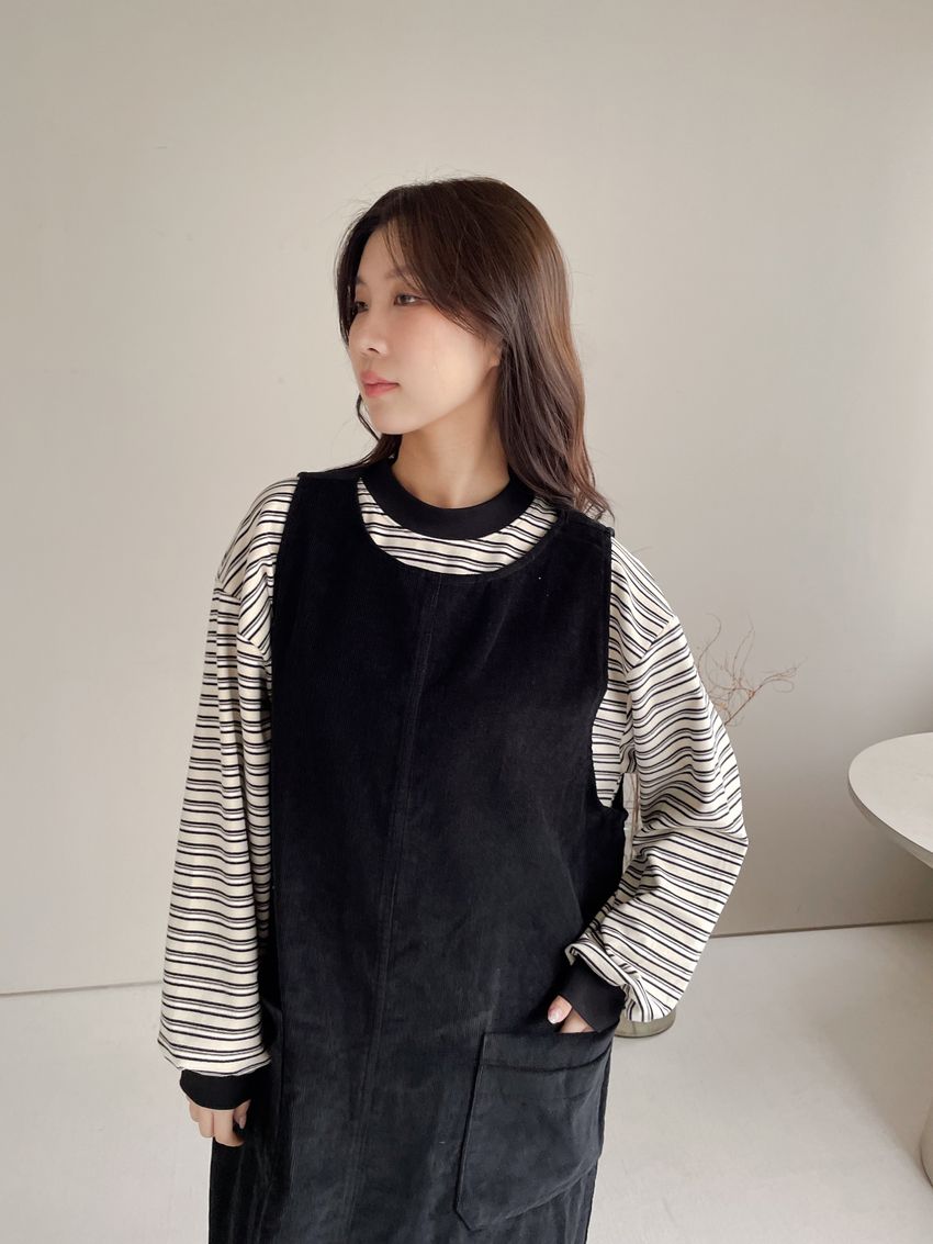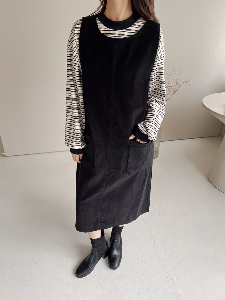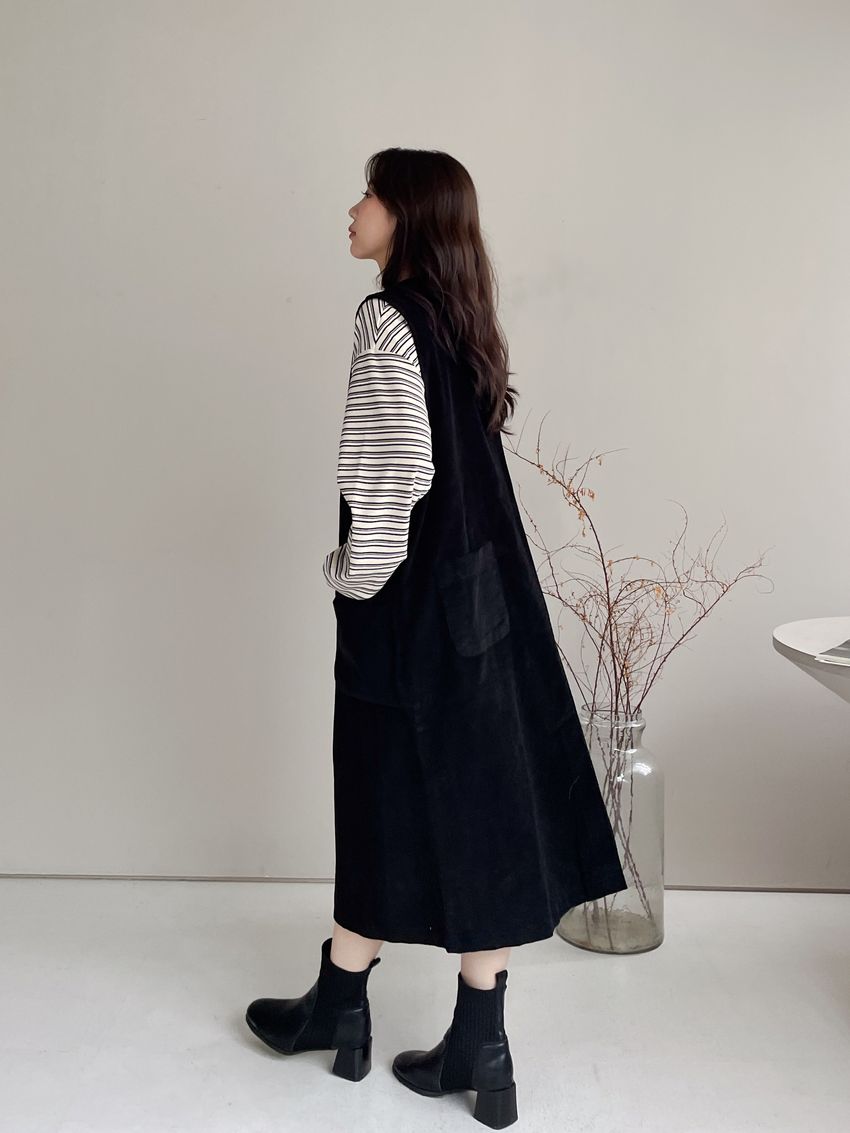 燈芯絨側釦口袋背心洋裝
