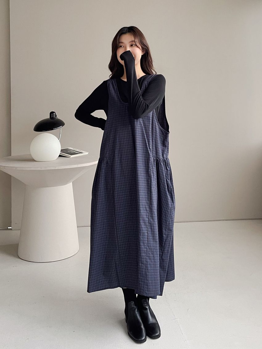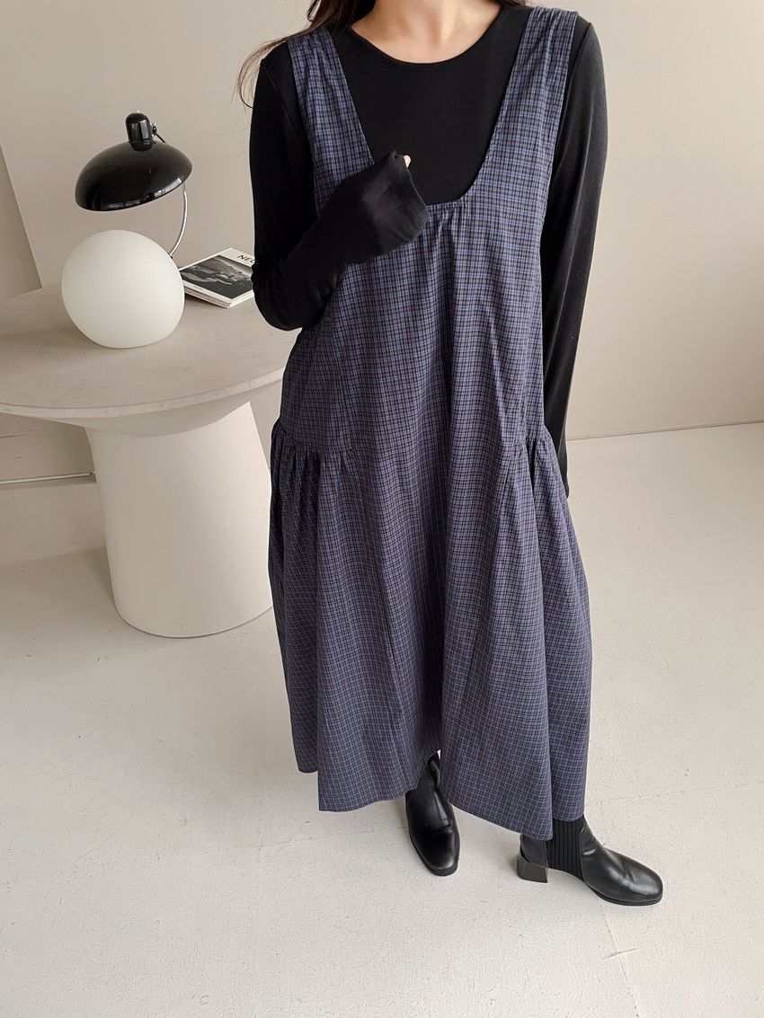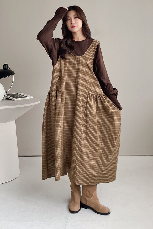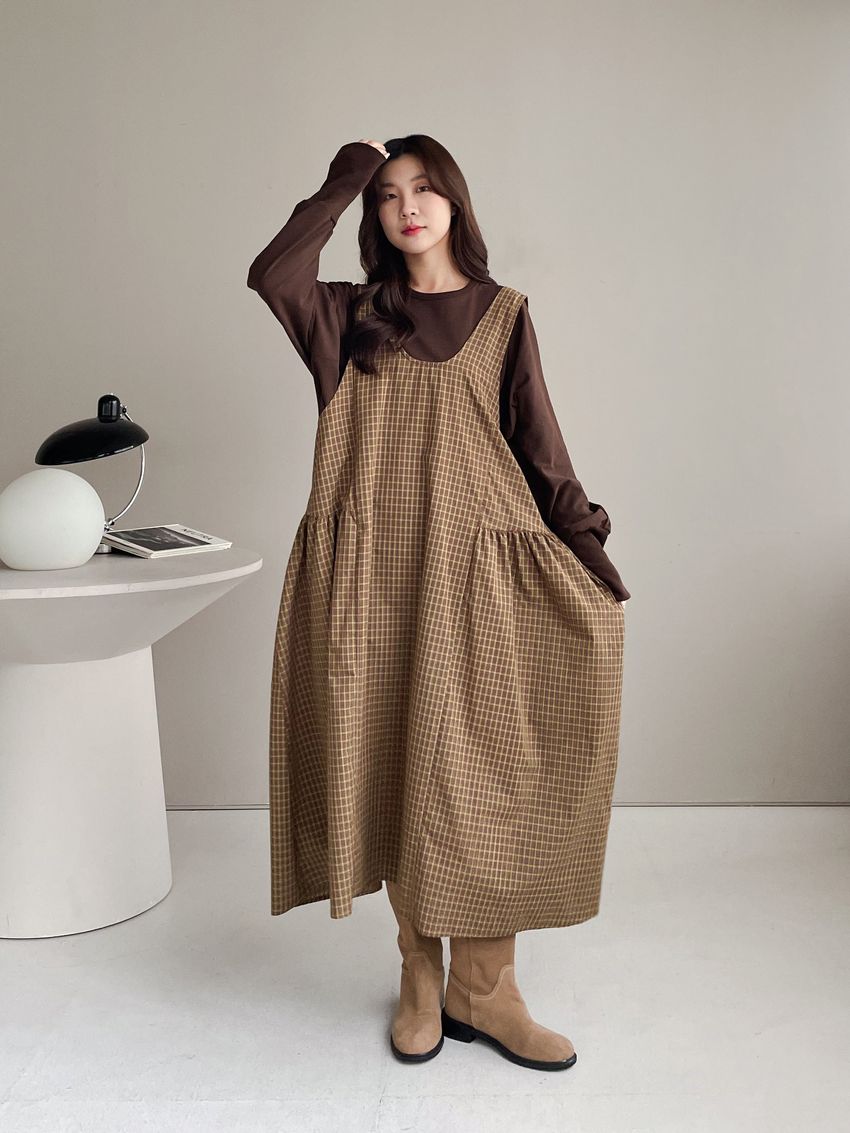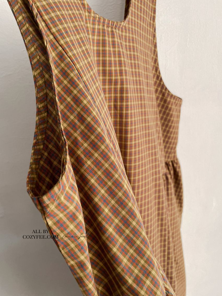 格紋腰抓褶背心洋裝