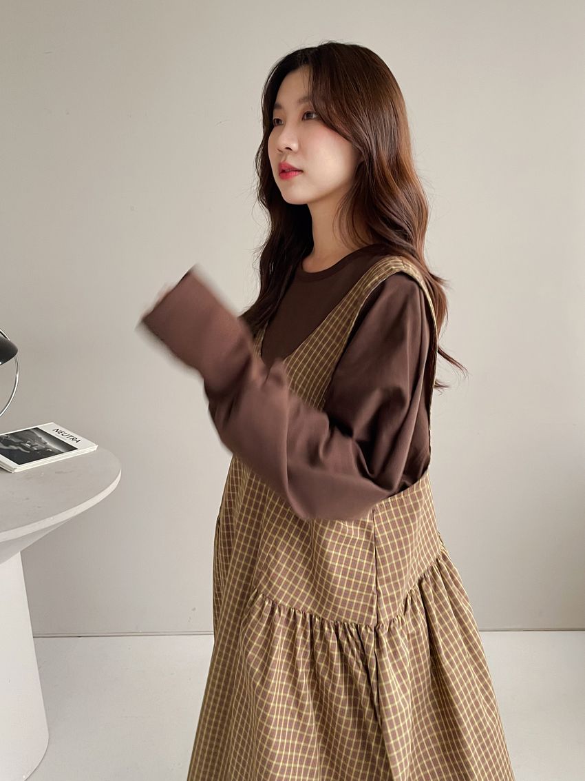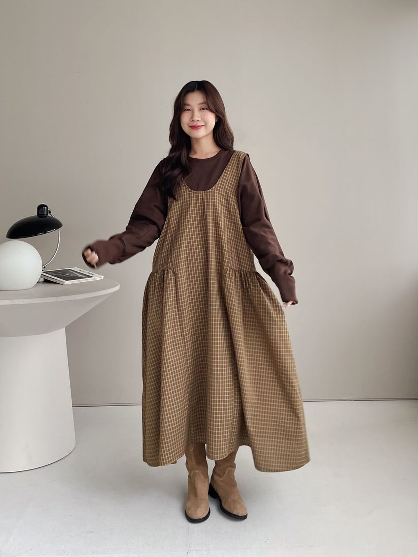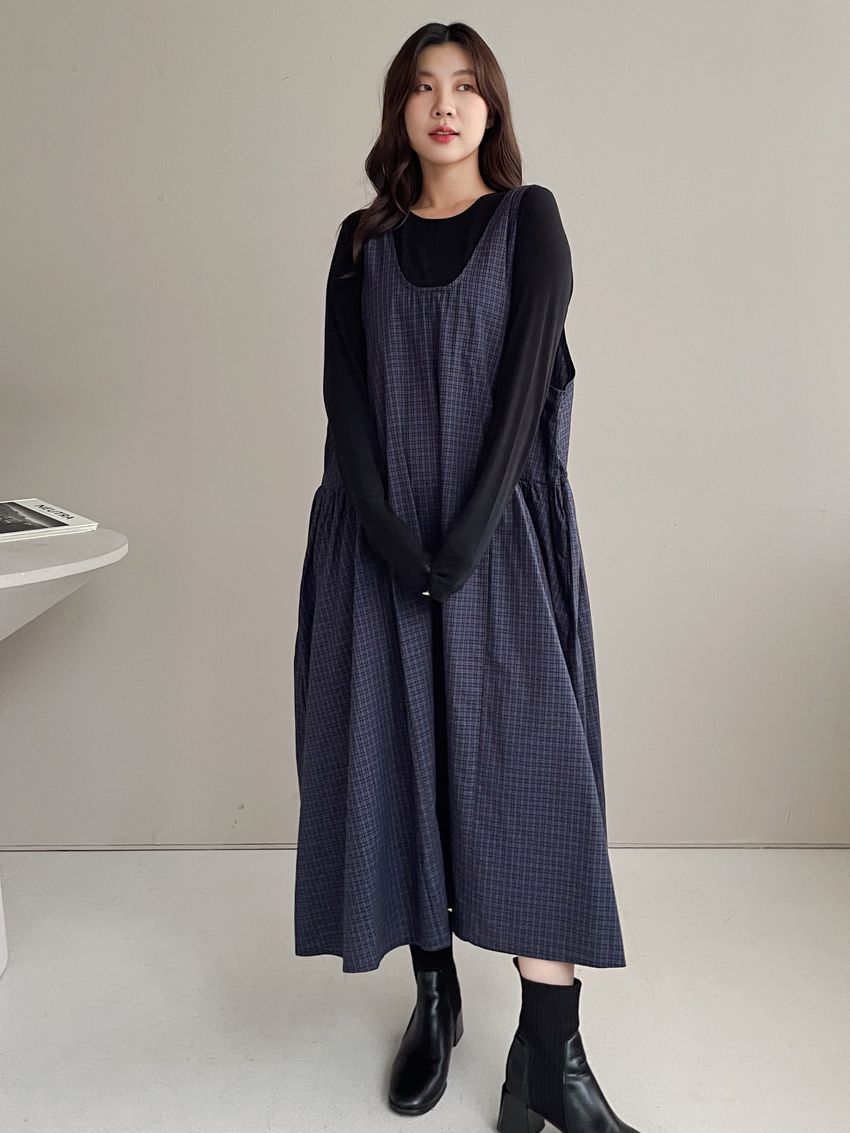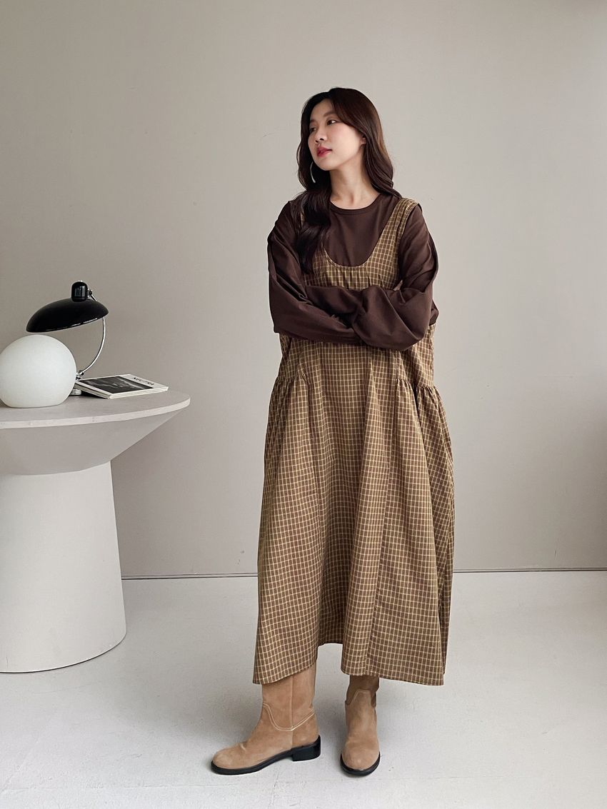 格紋腰抓褶背心洋裝