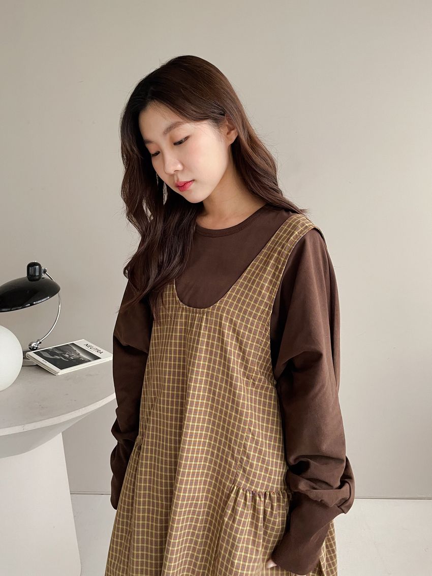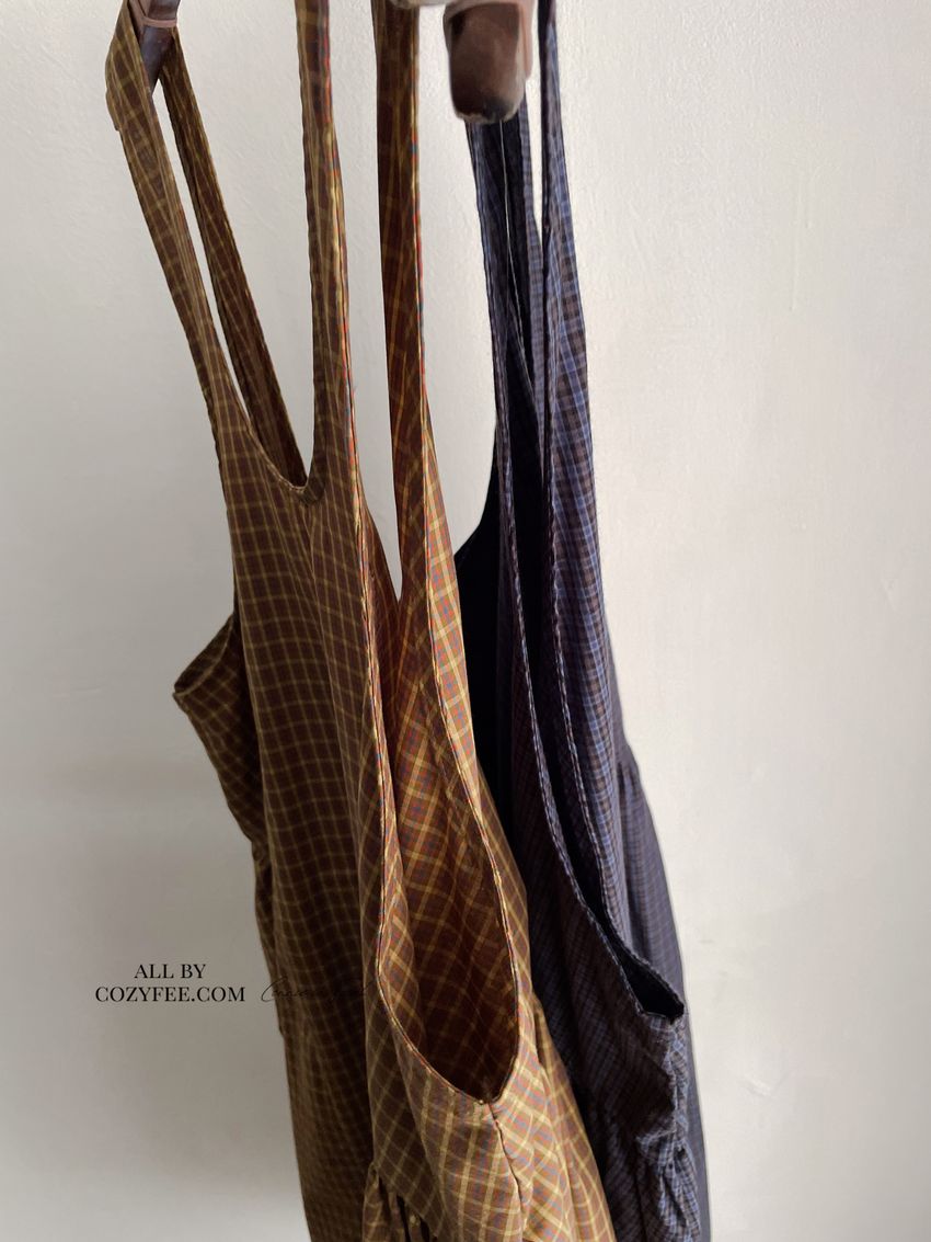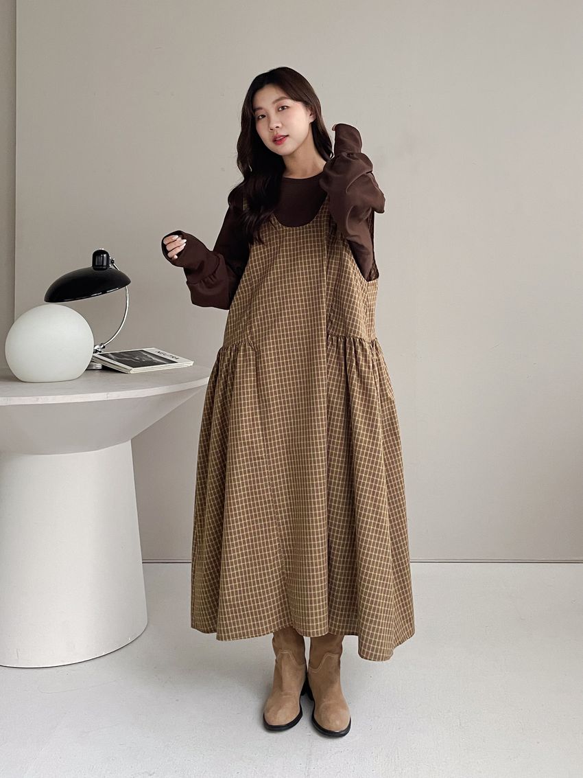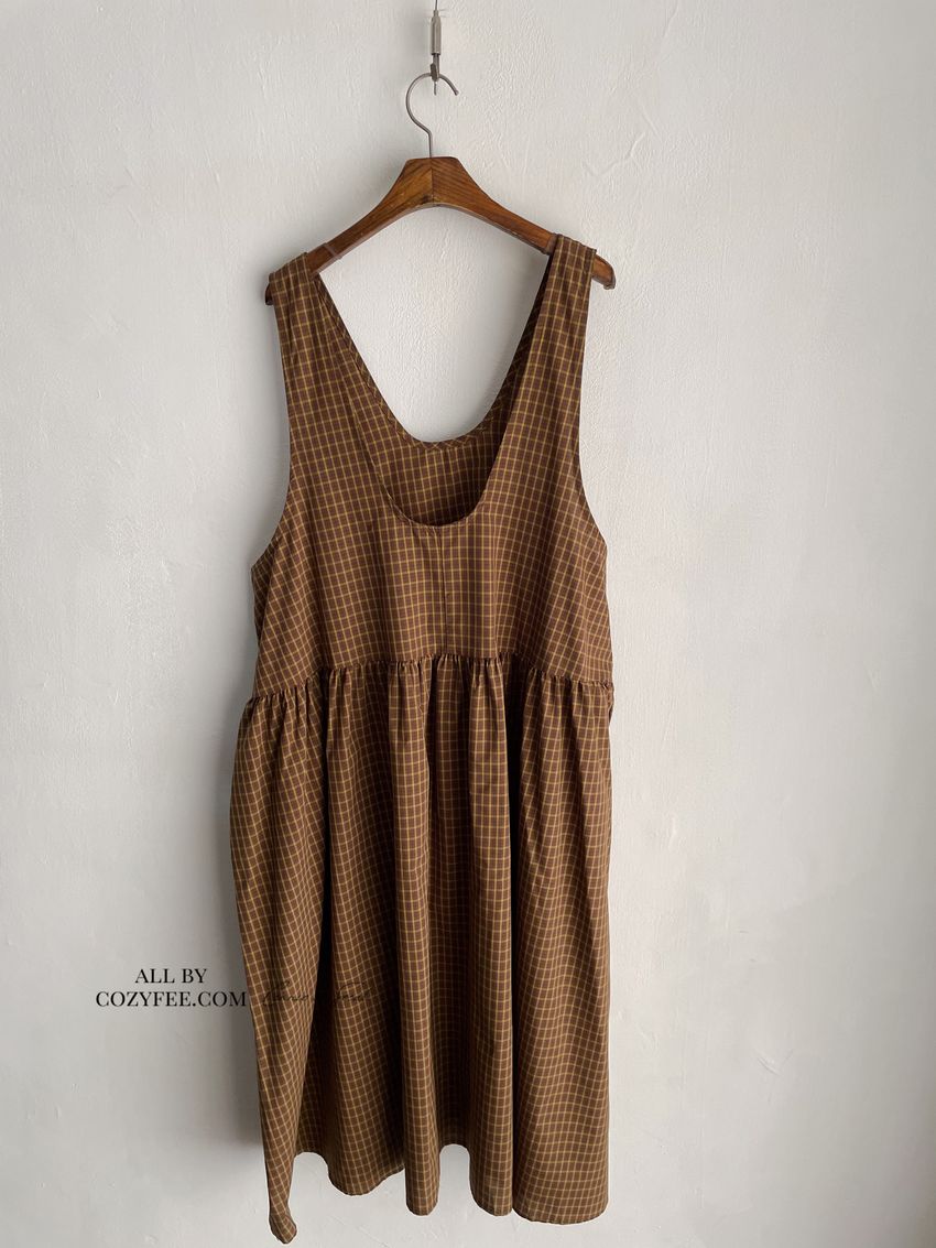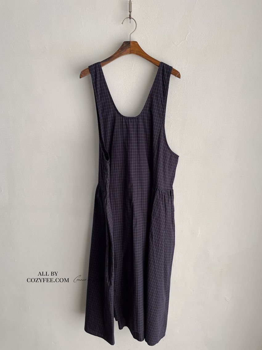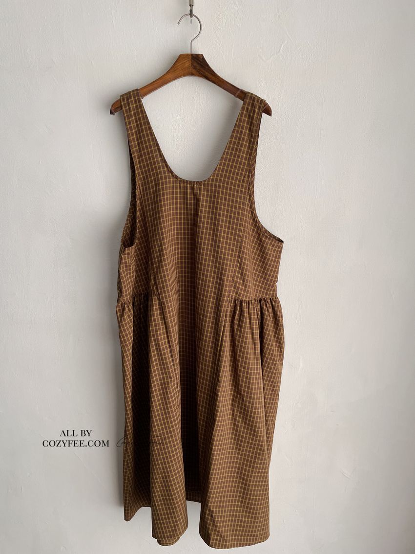 > 格紋腰抓褶背心洋裝