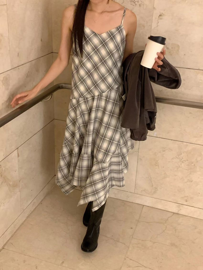 格紋不規則裙襬細肩洋裝(特)