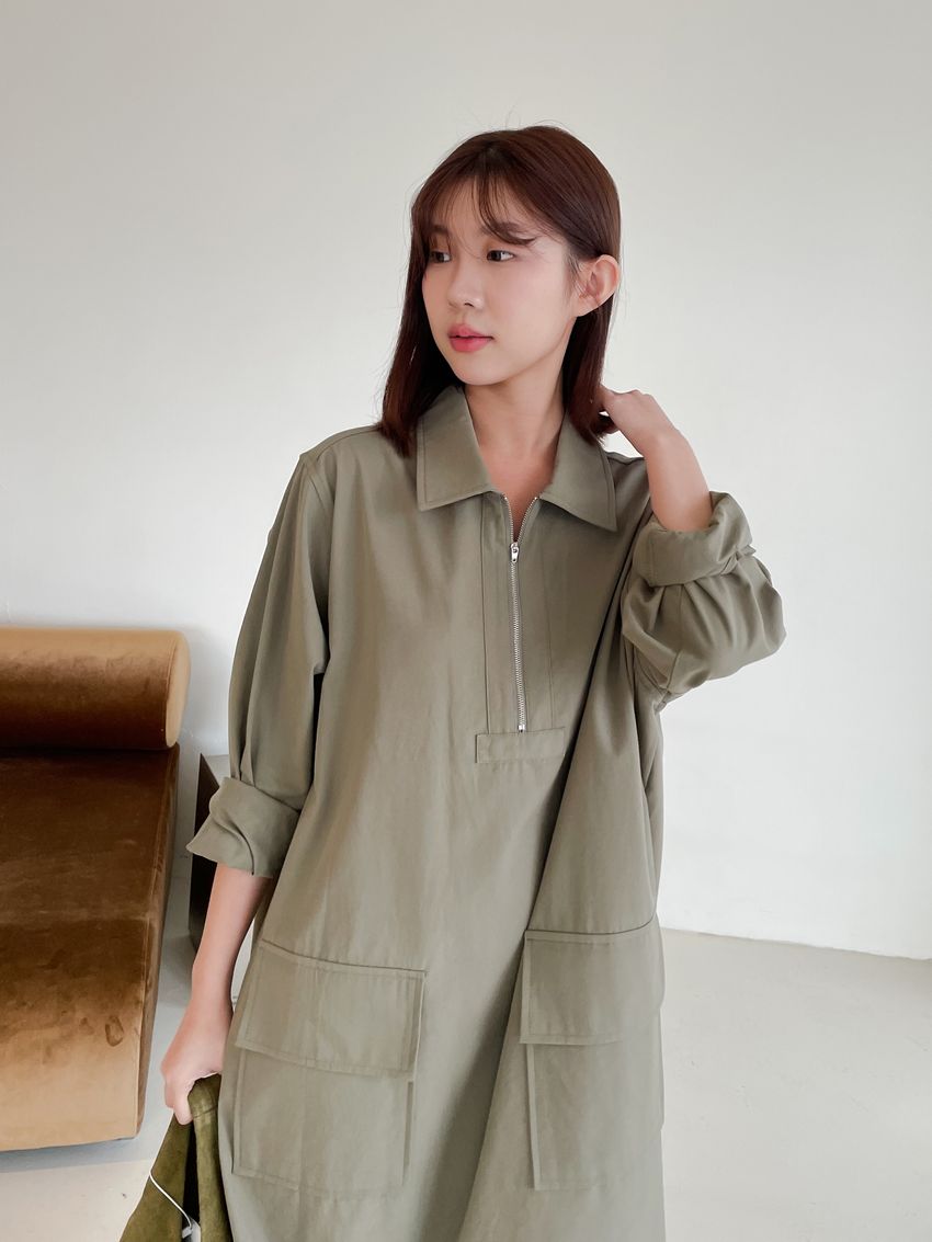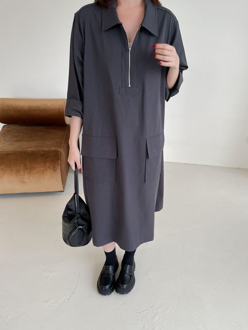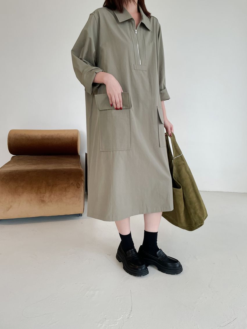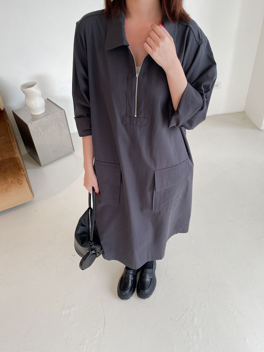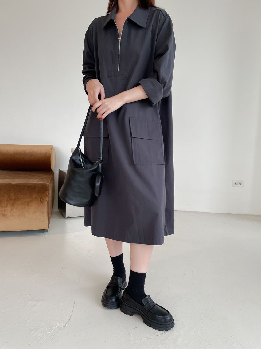 > 拉鍊翻領口袋洋裝