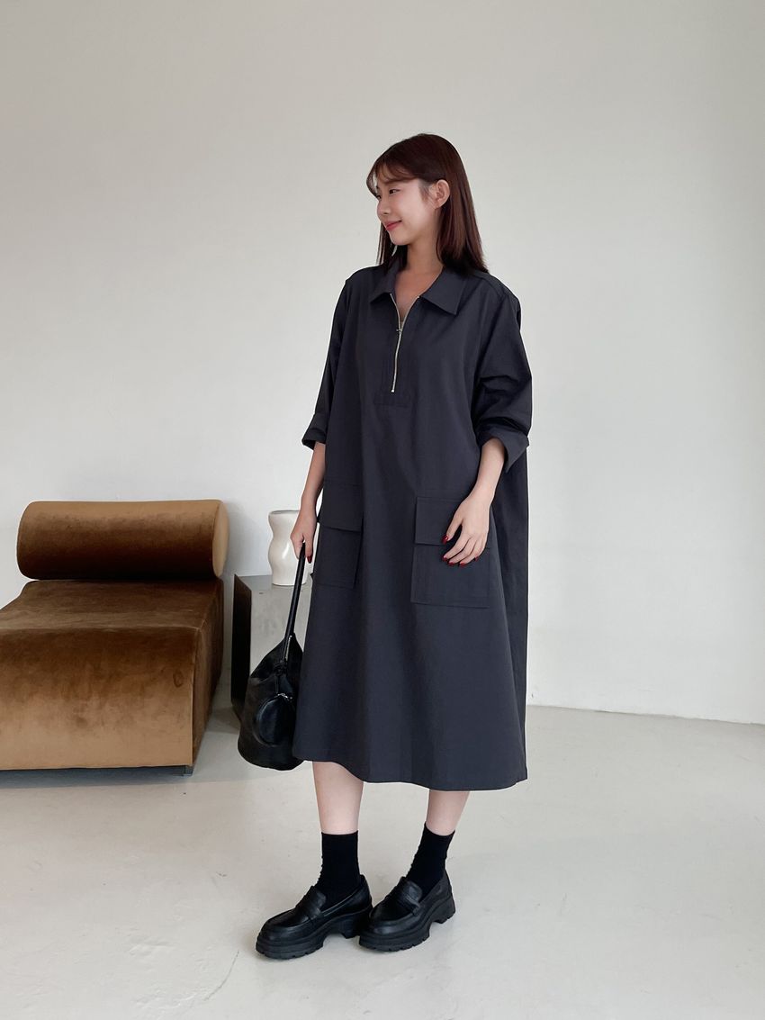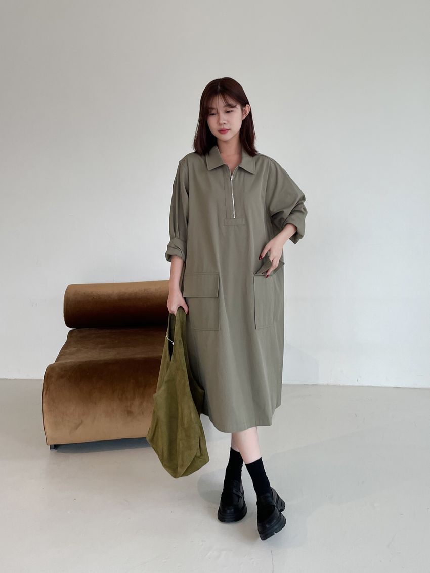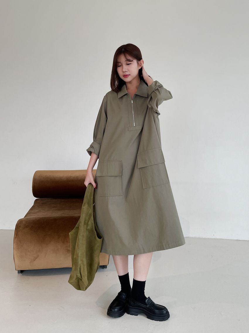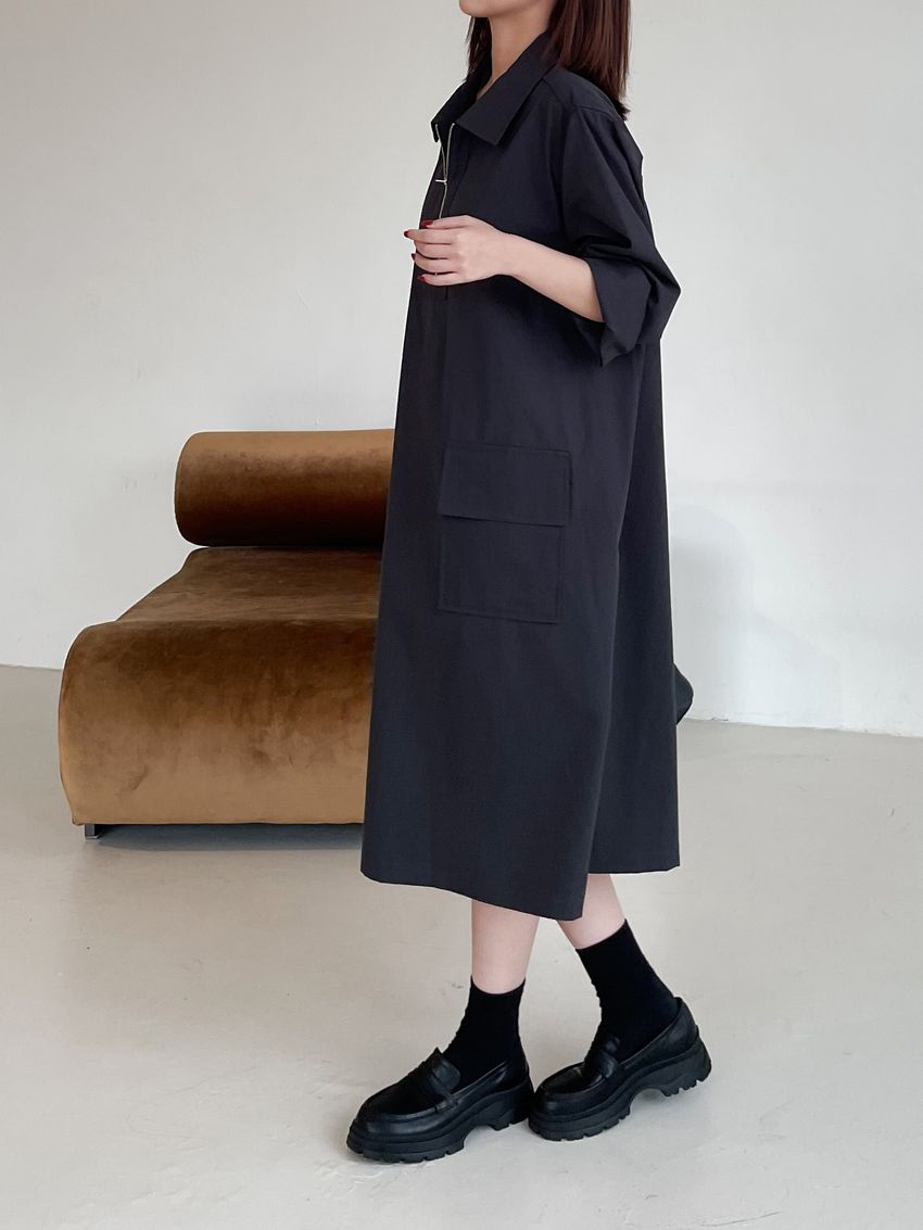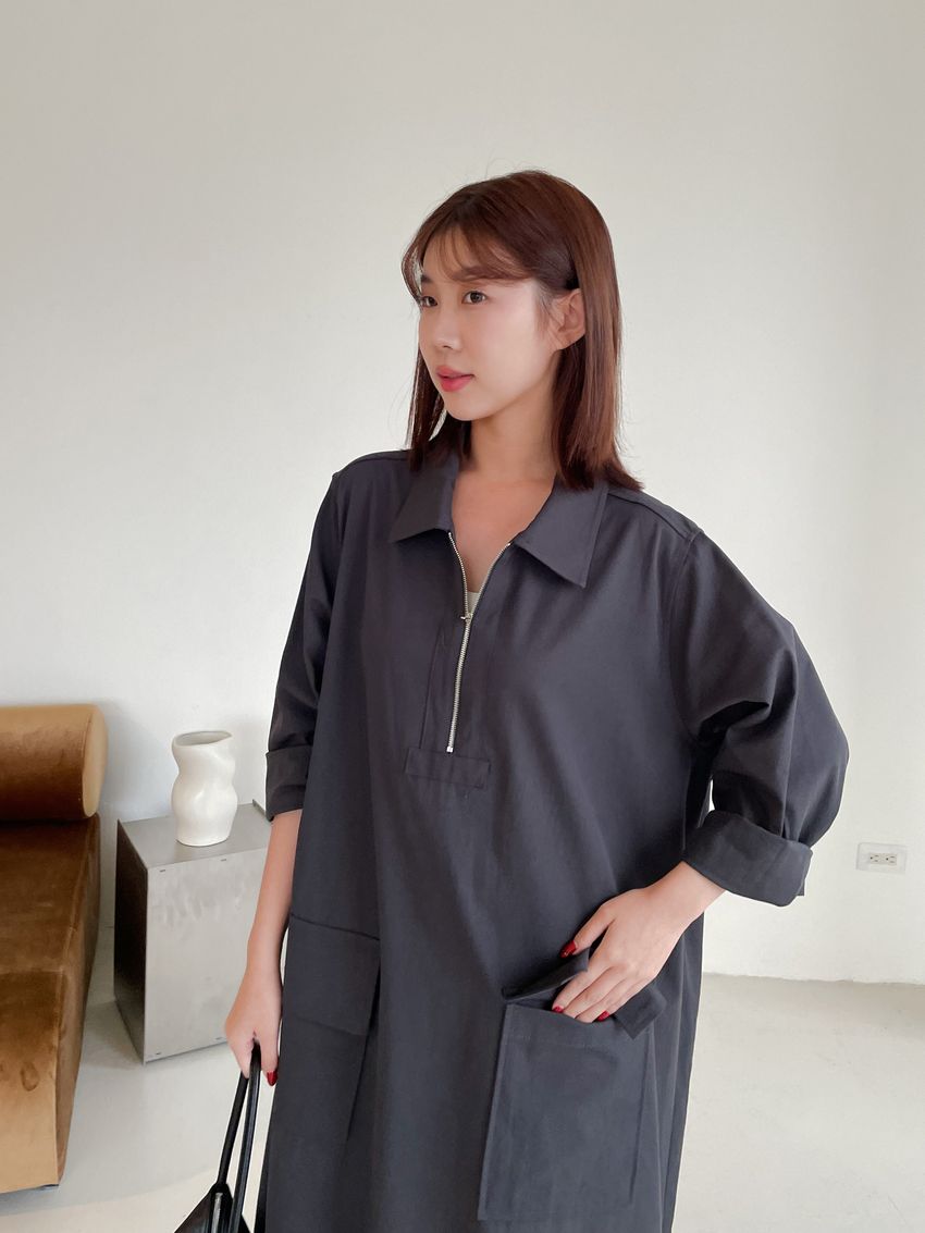 > 拉鍊翻領口袋洋裝