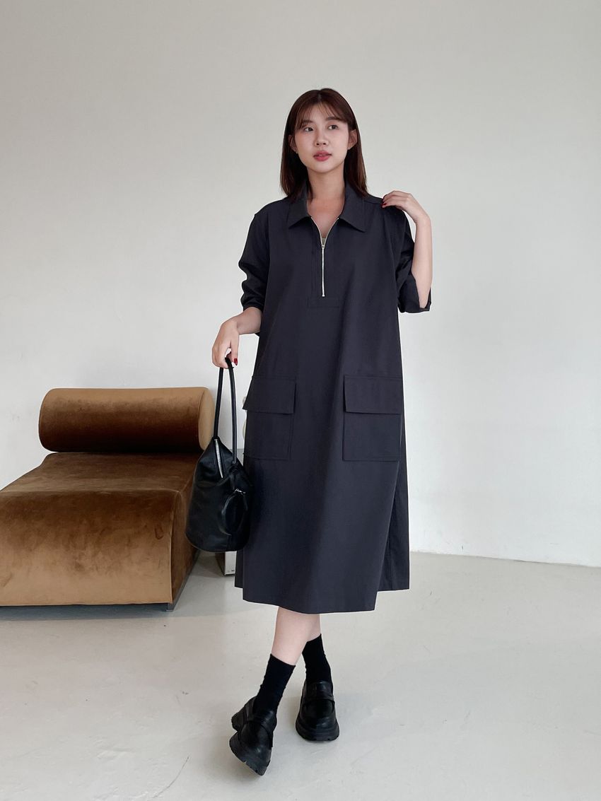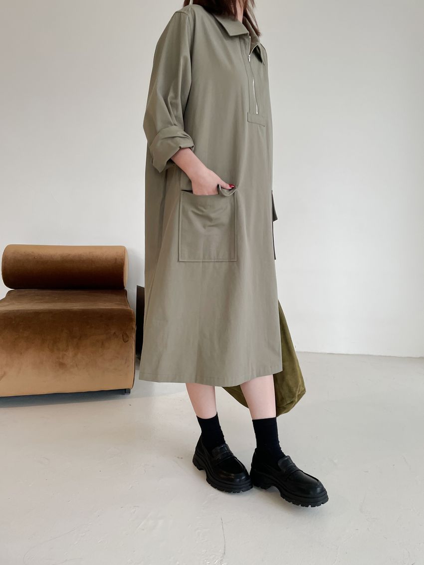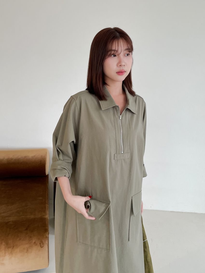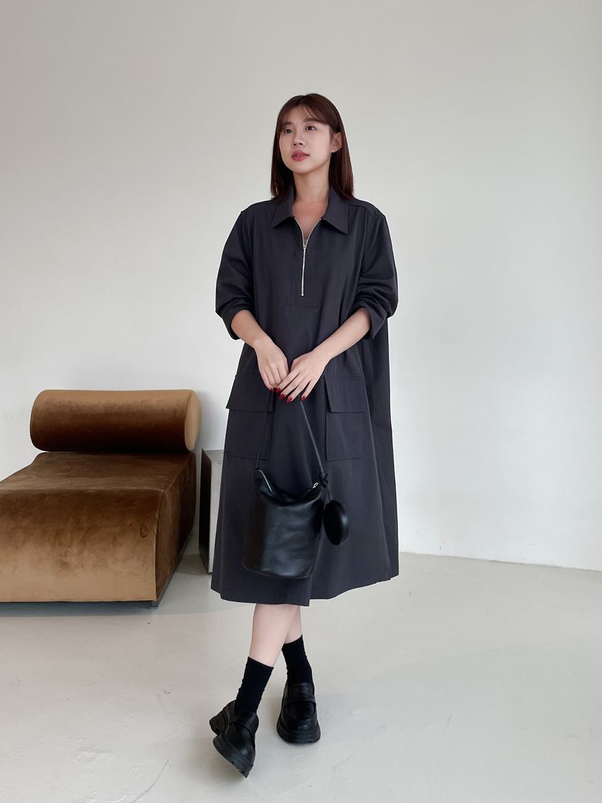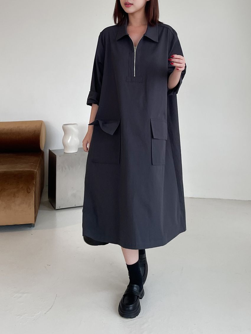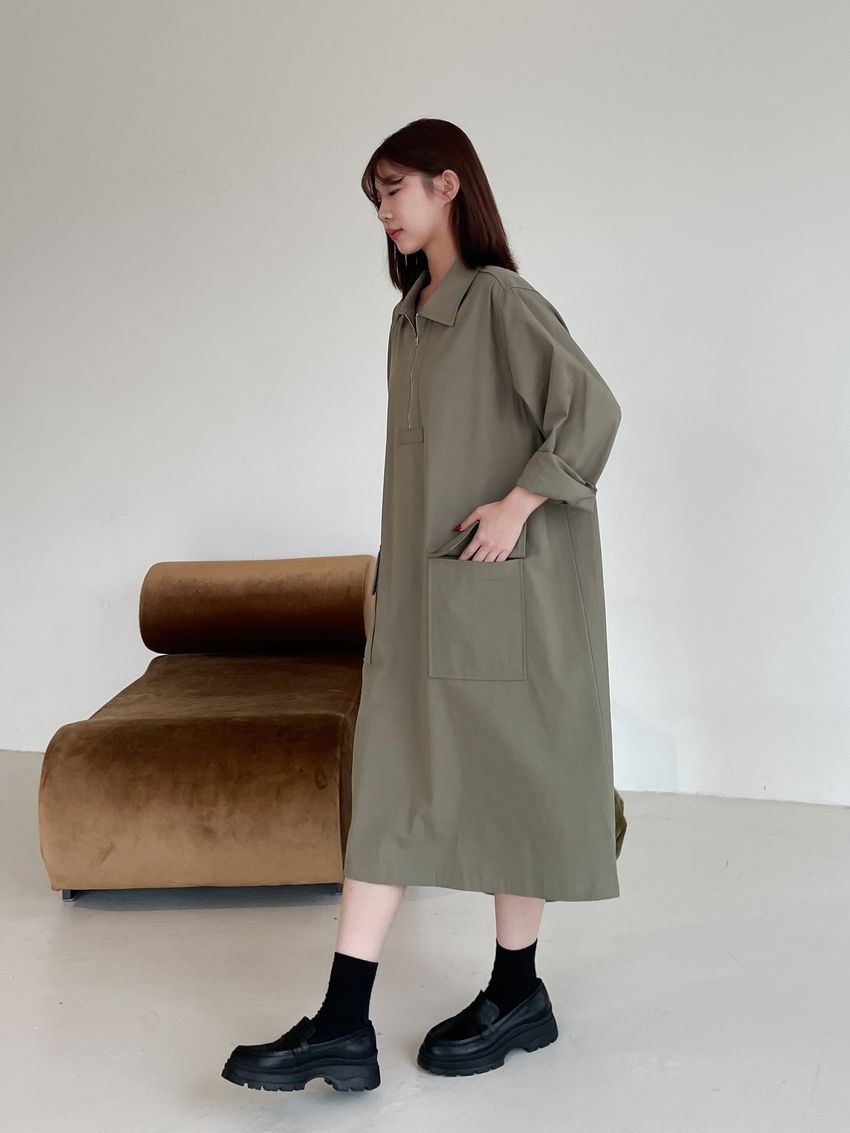 > 拉鍊翻領口袋洋裝