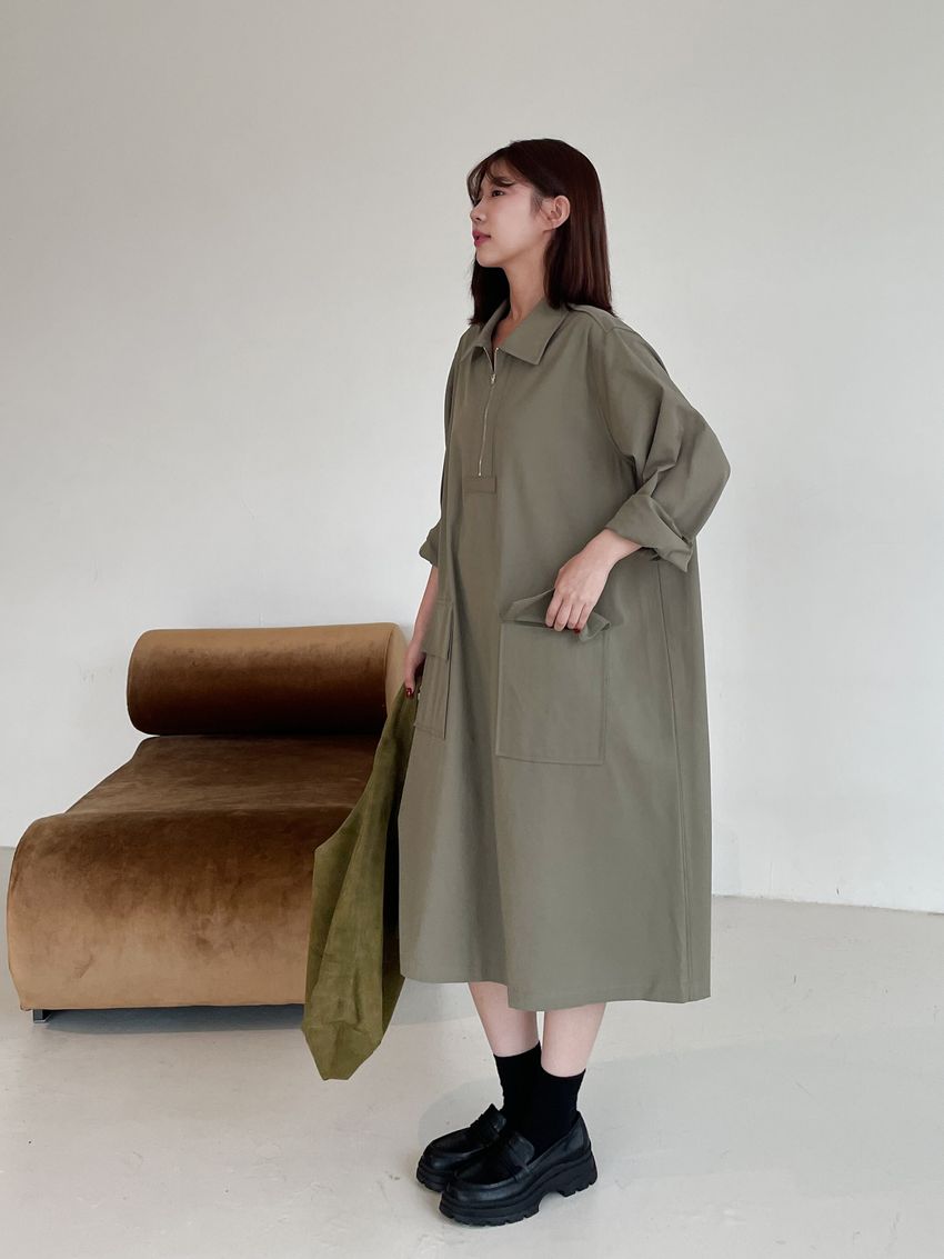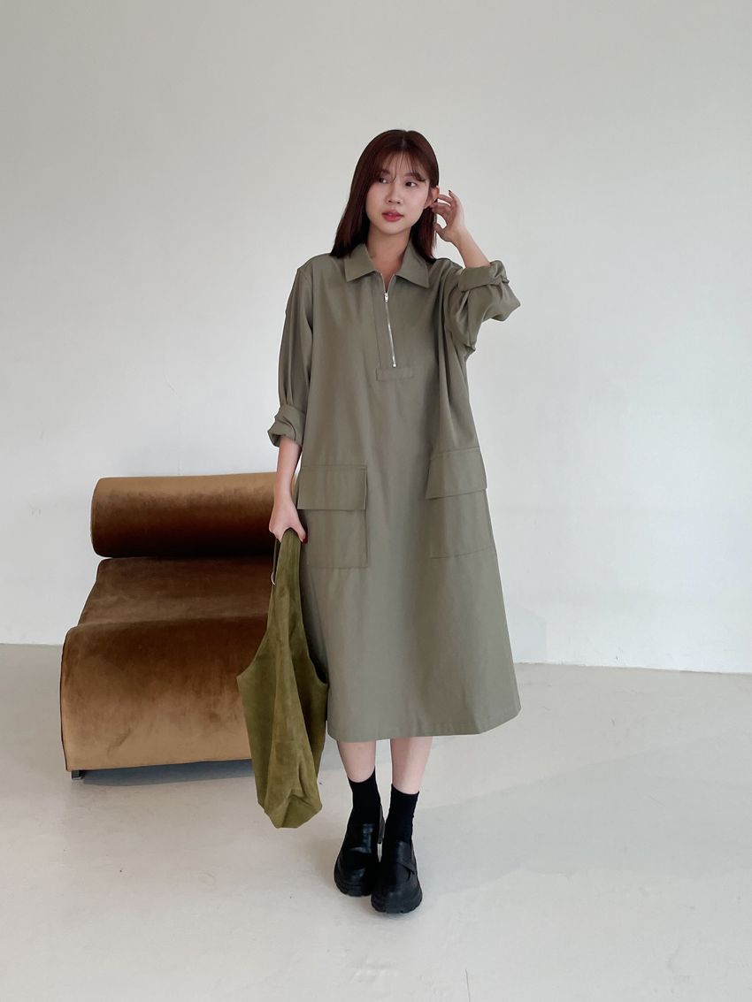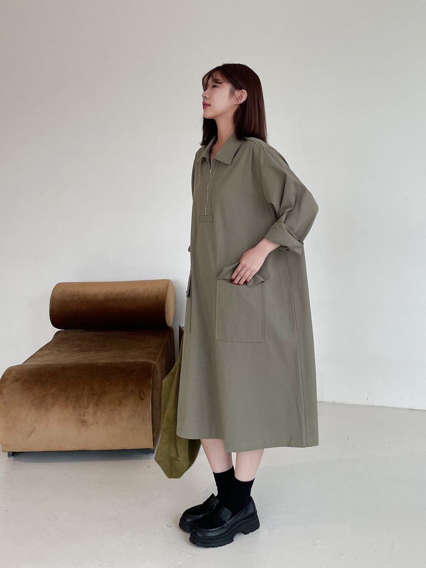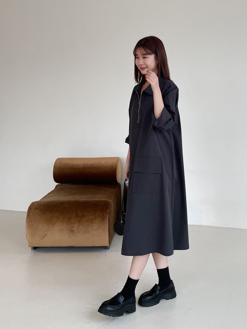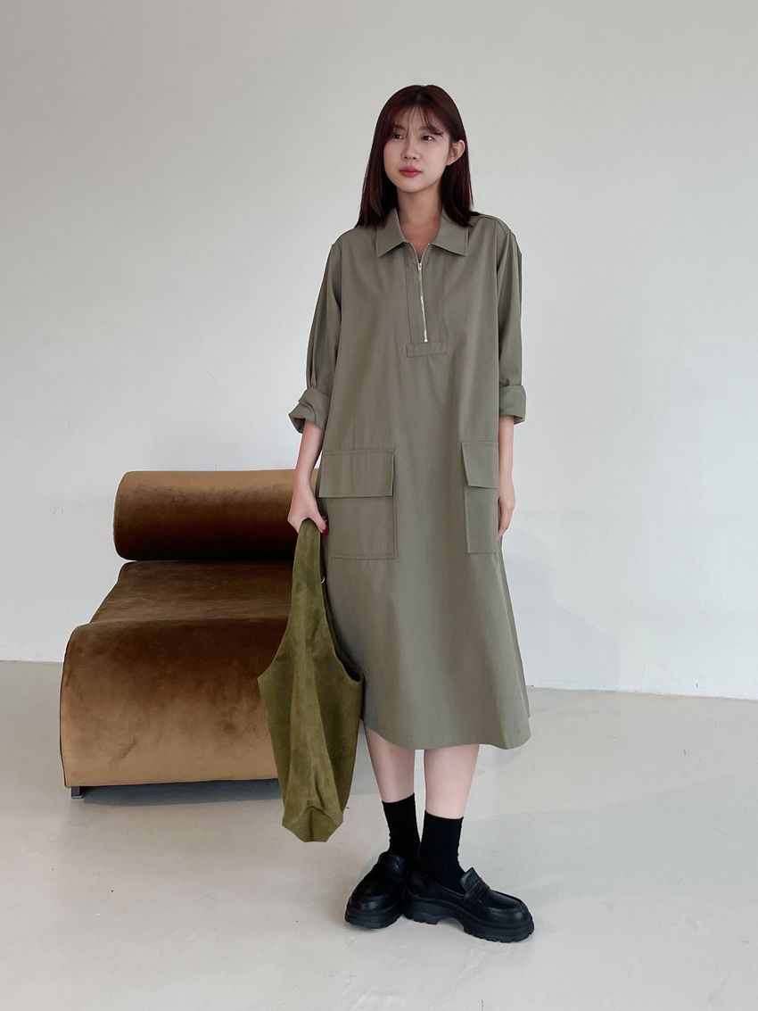 > 拉鍊翻領口袋洋裝