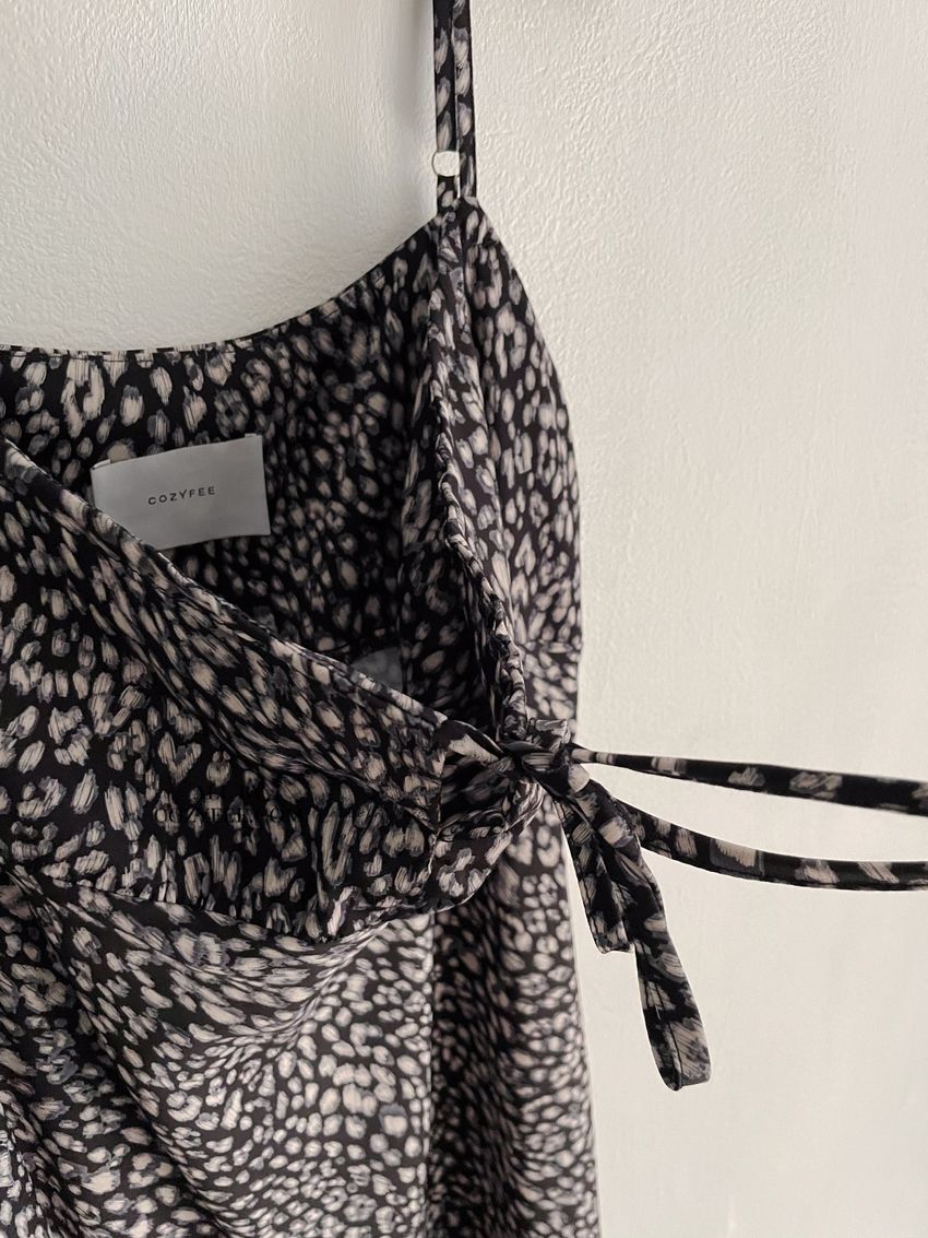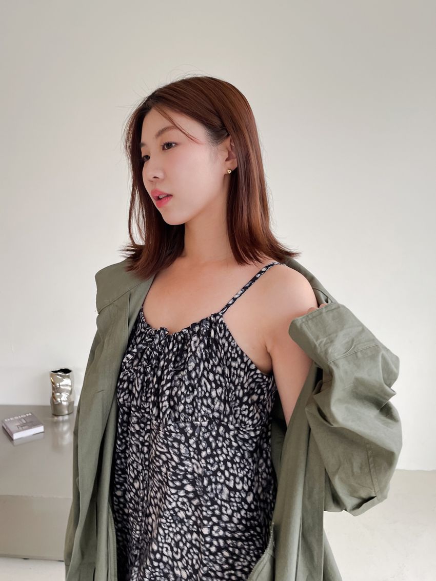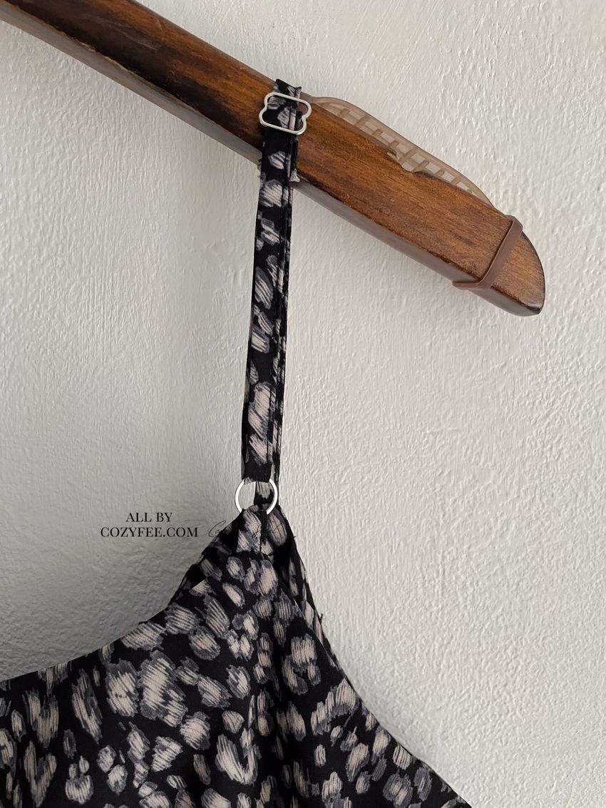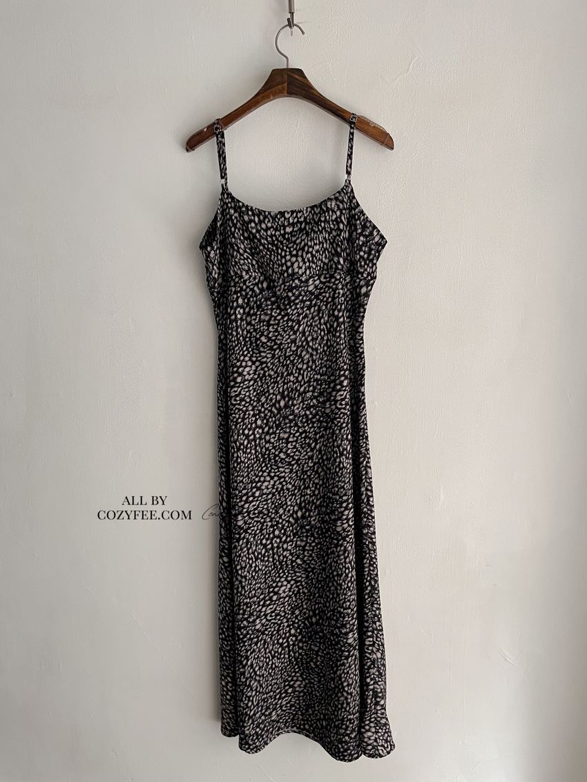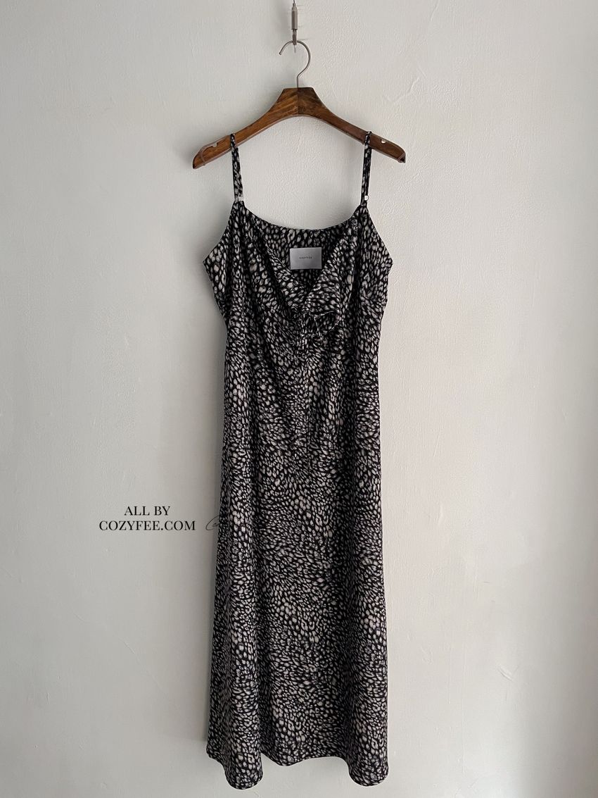 > 領口綁帶豹紋細肩雪紡洋裝(直播款)