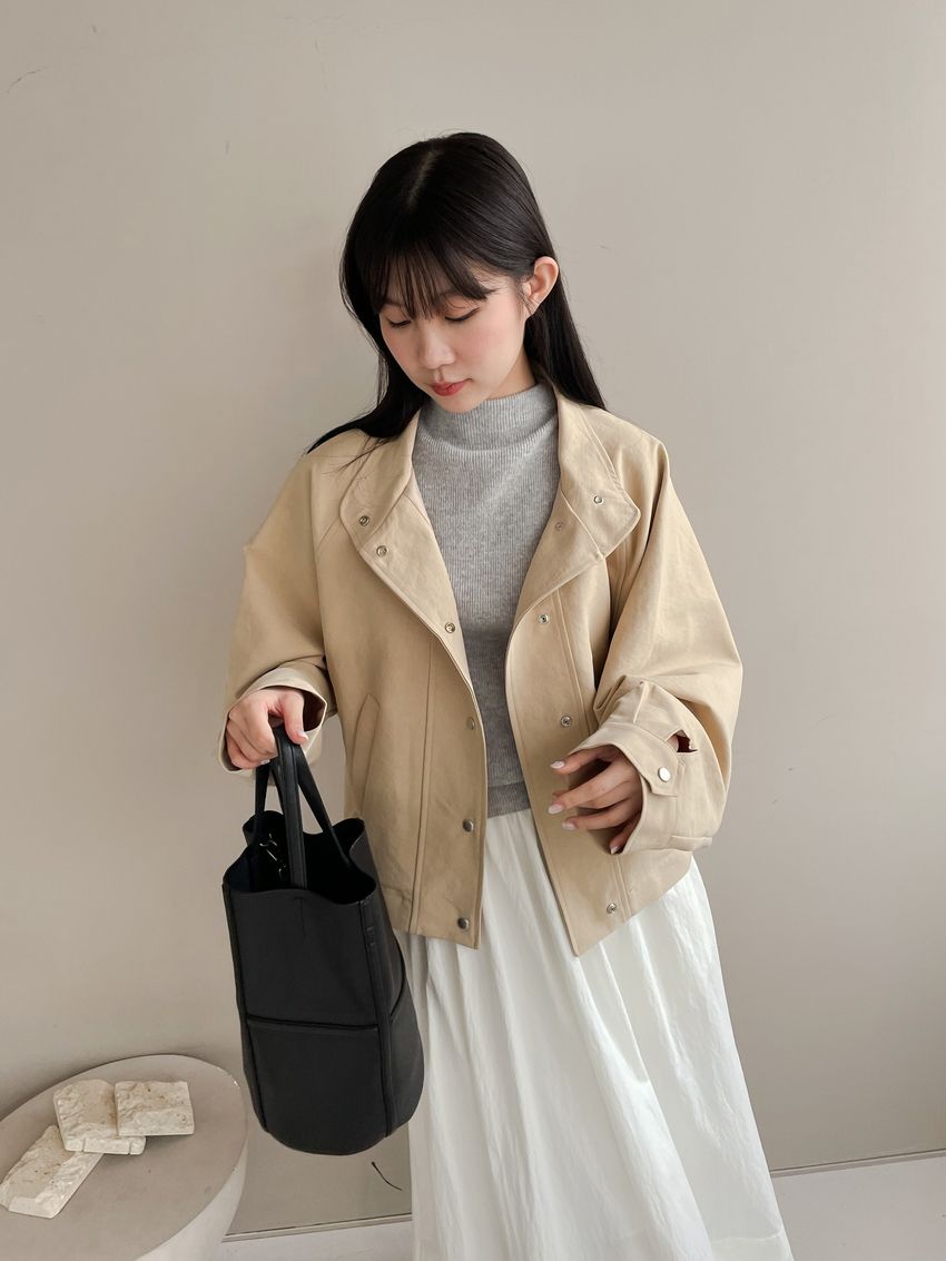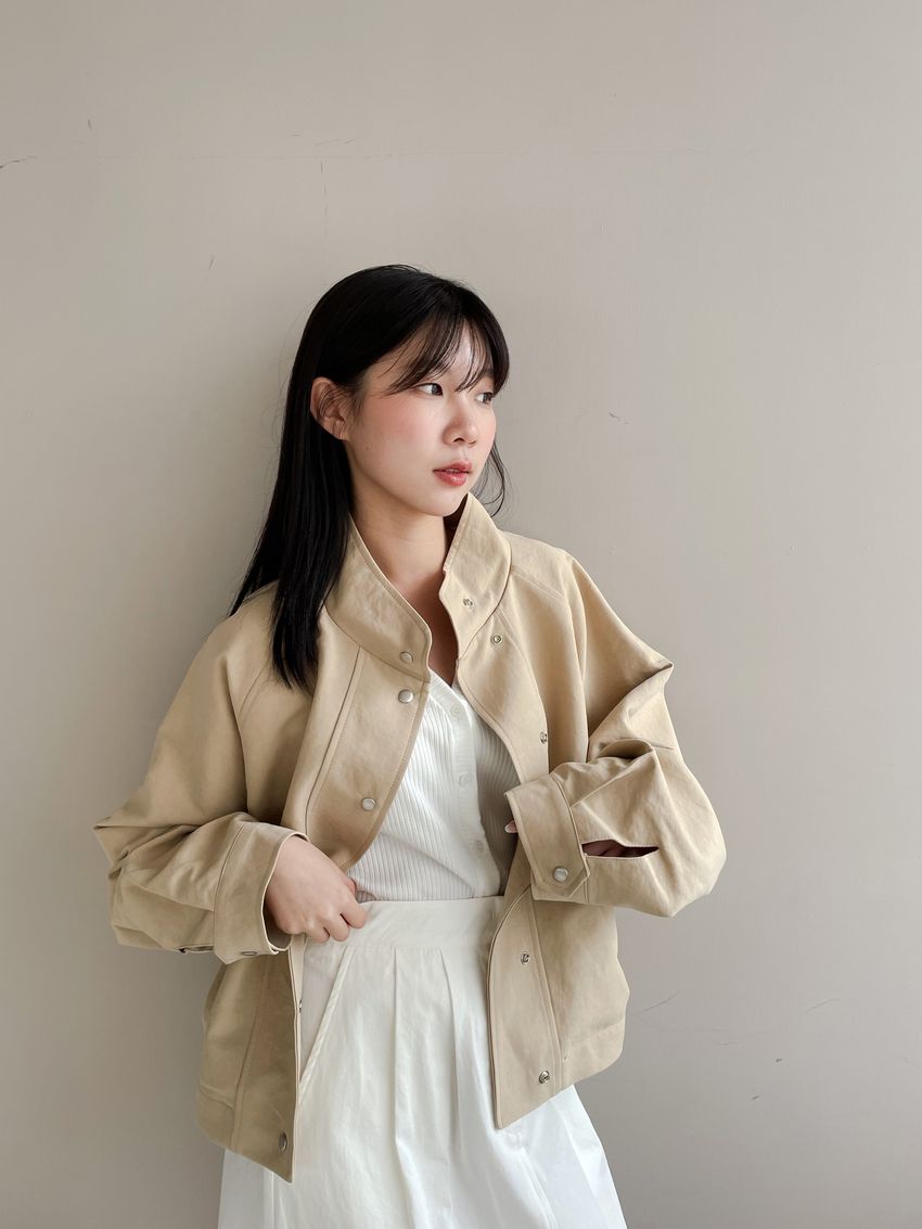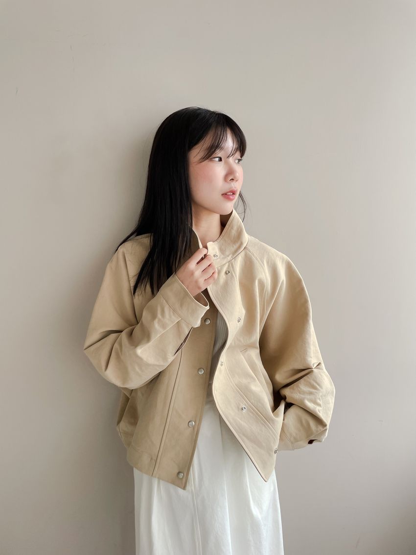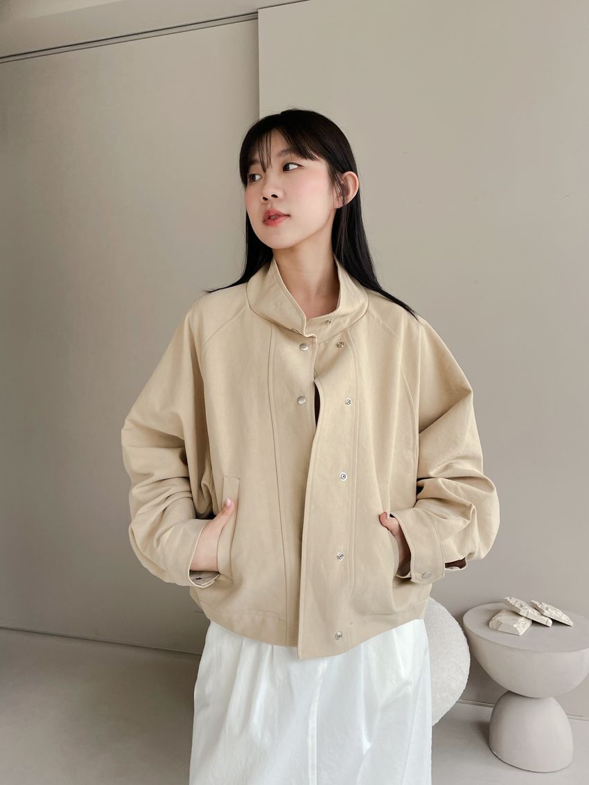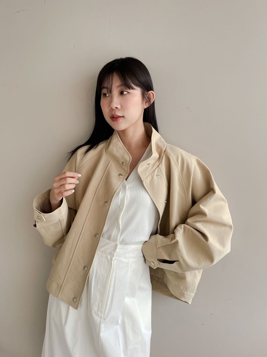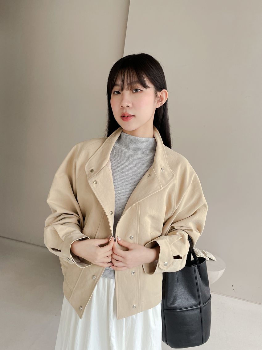 > 立領插肩袖壓釦短風衣外套(直播影片)