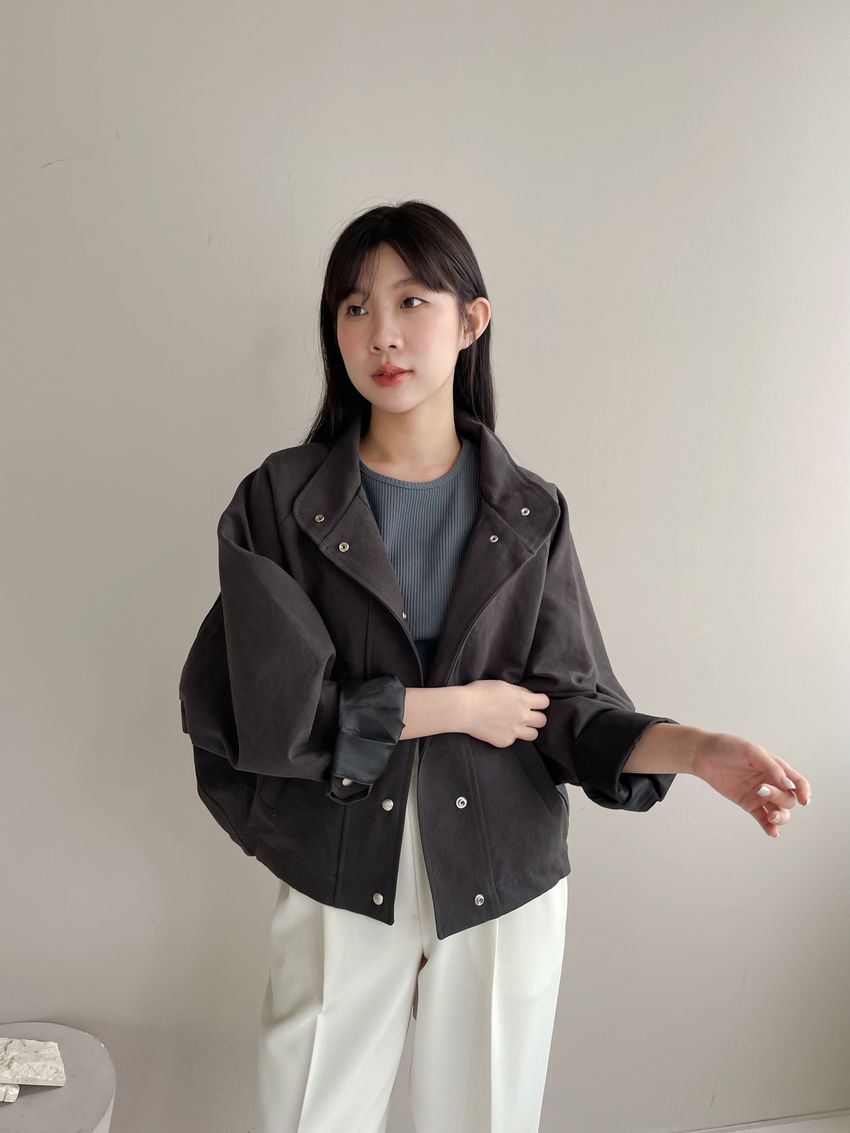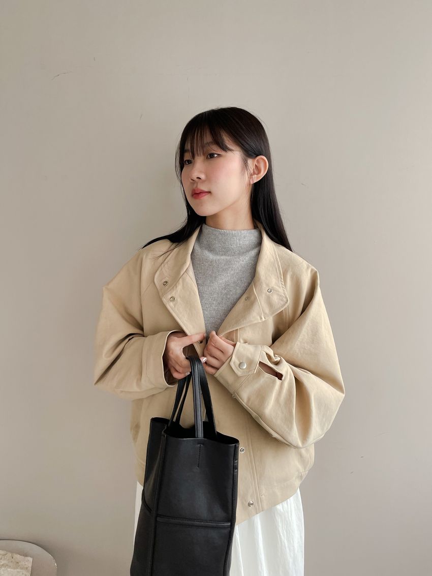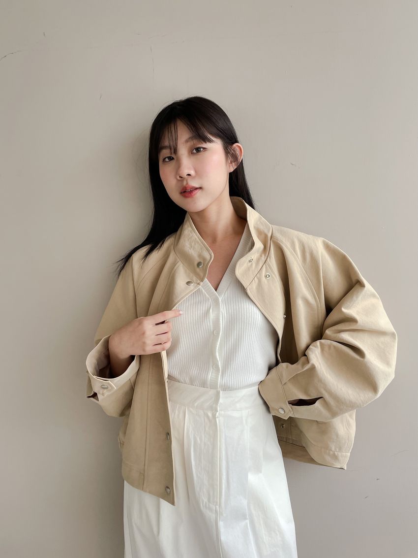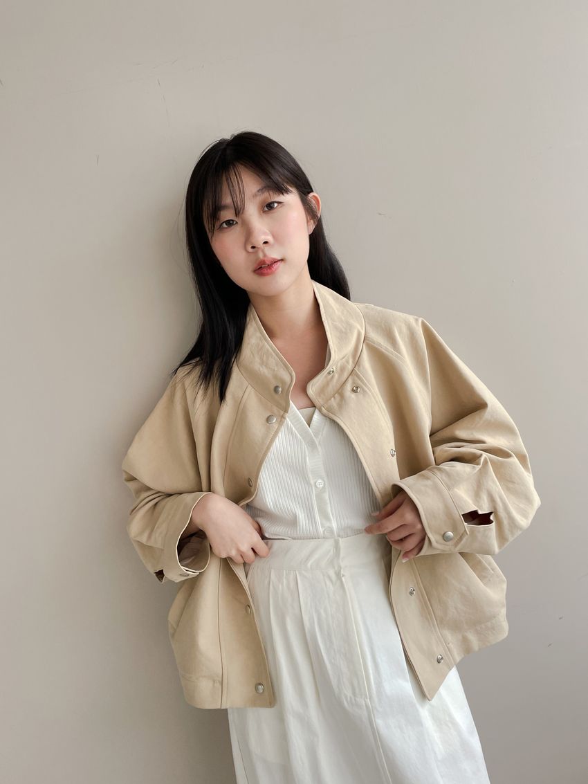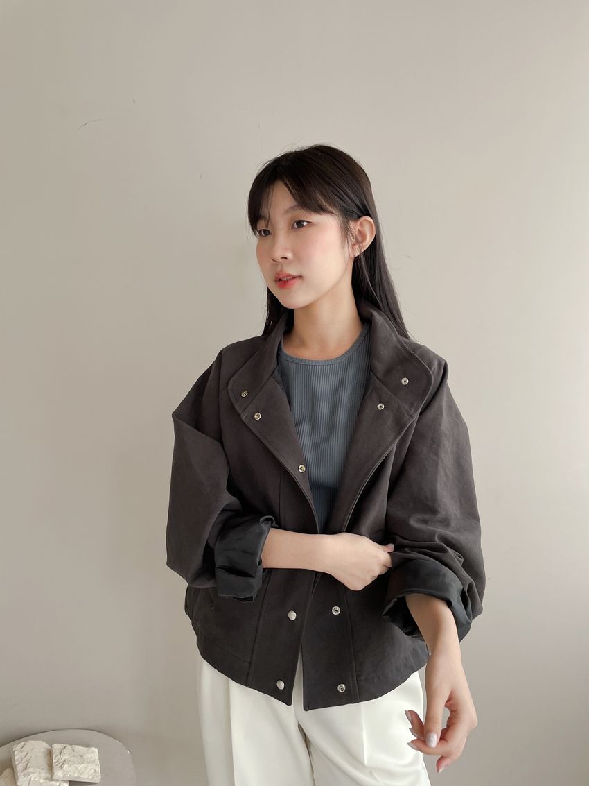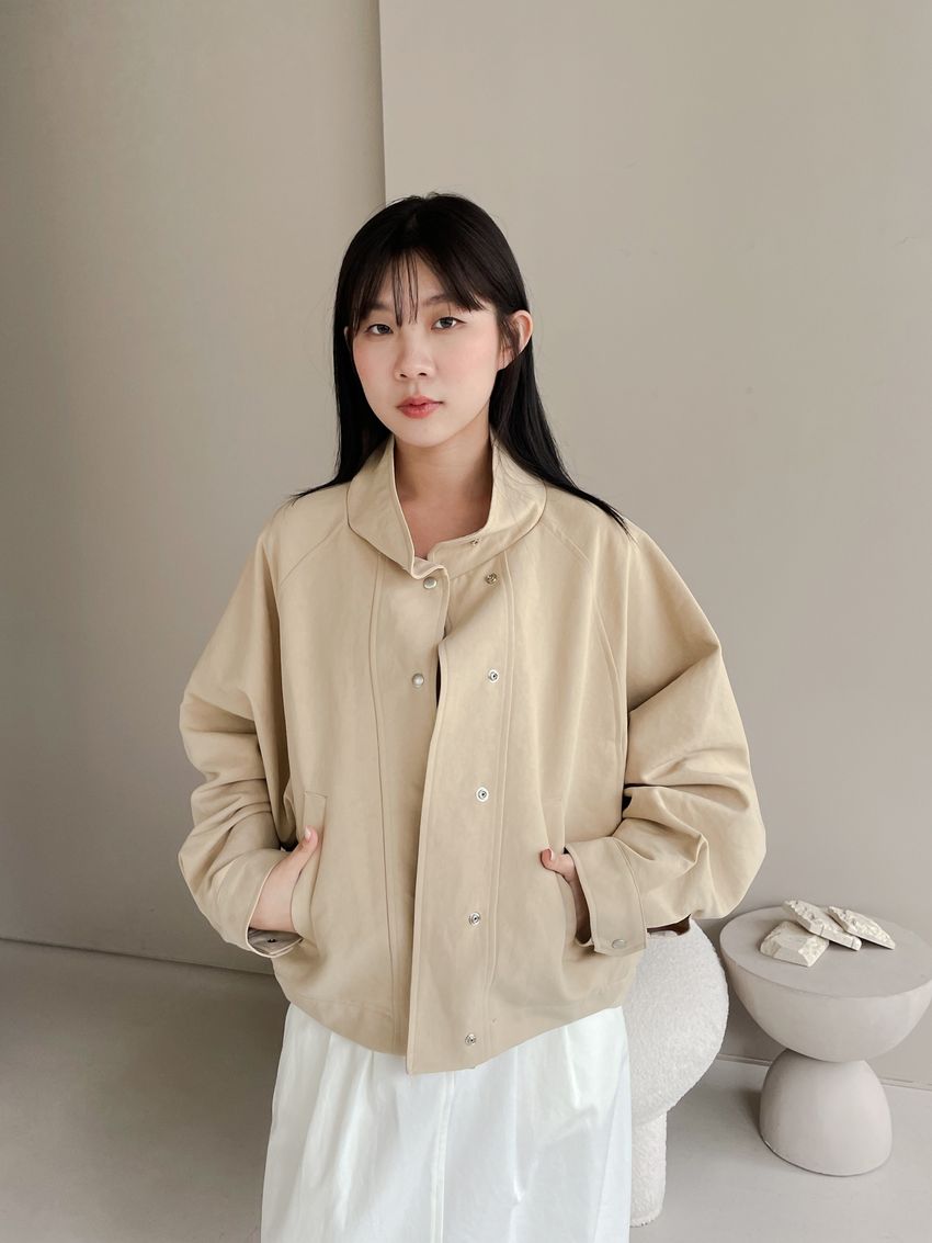 > 立領插肩袖壓釦短風衣外套(直播影片)