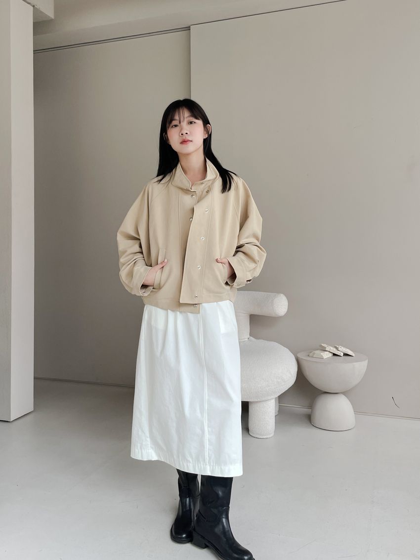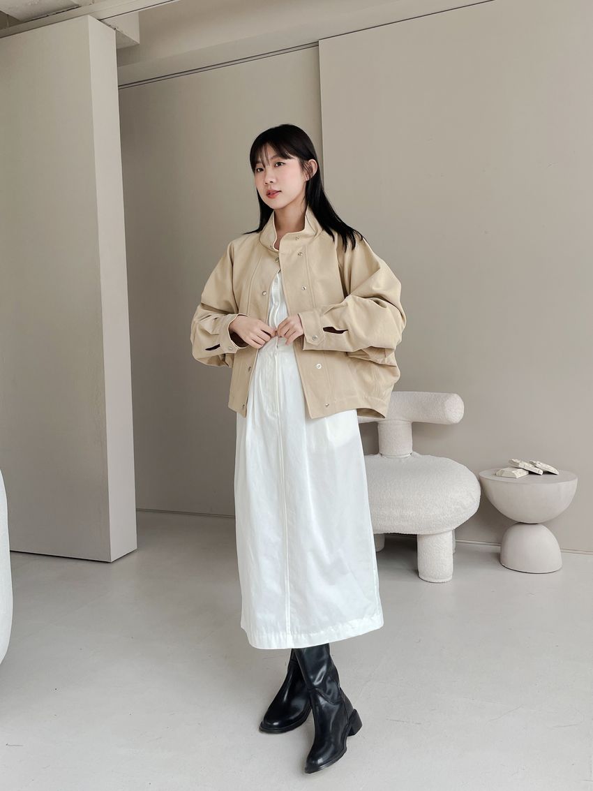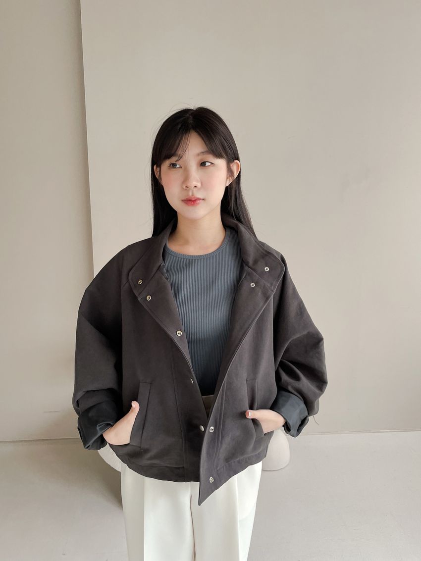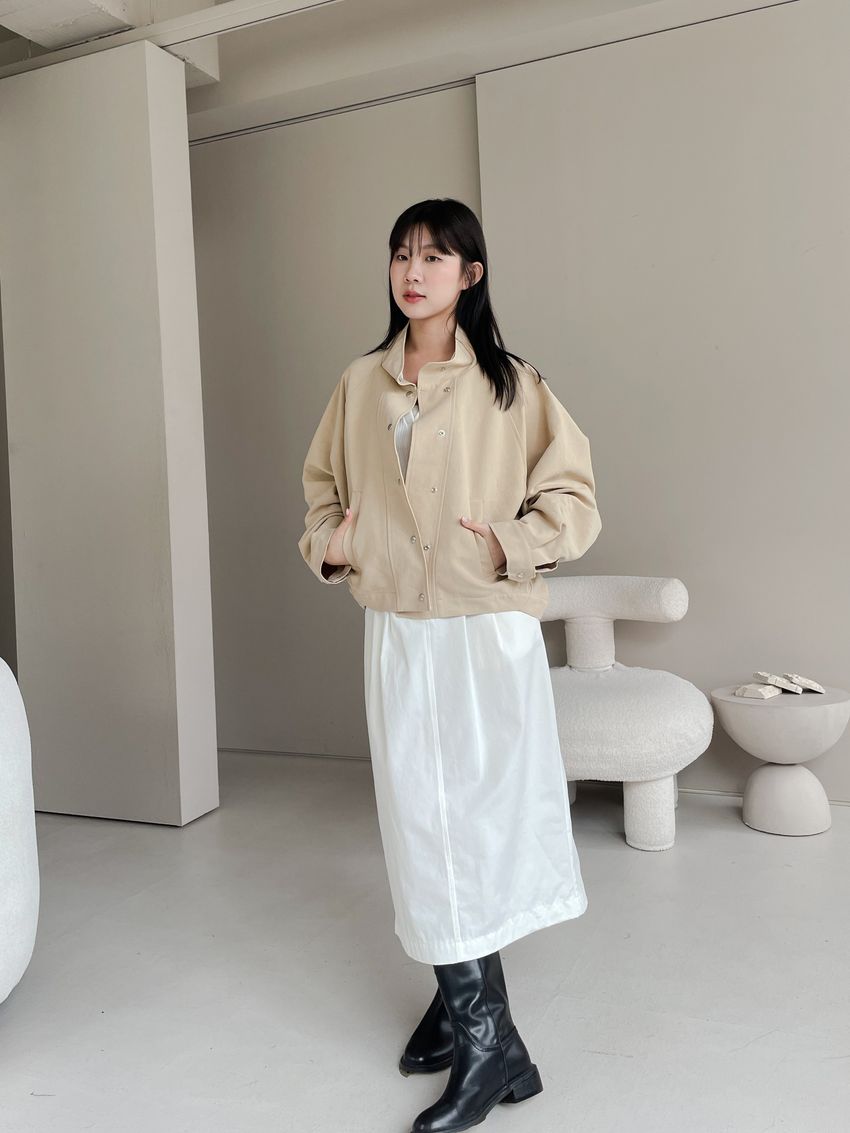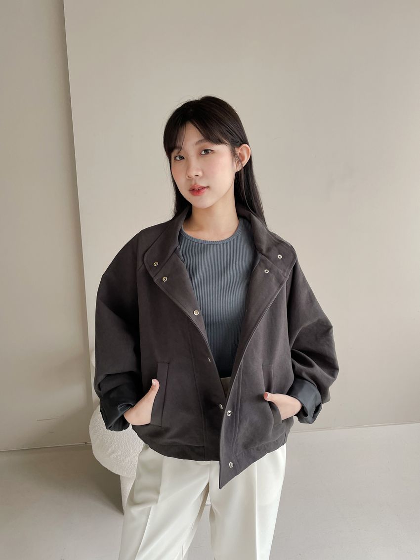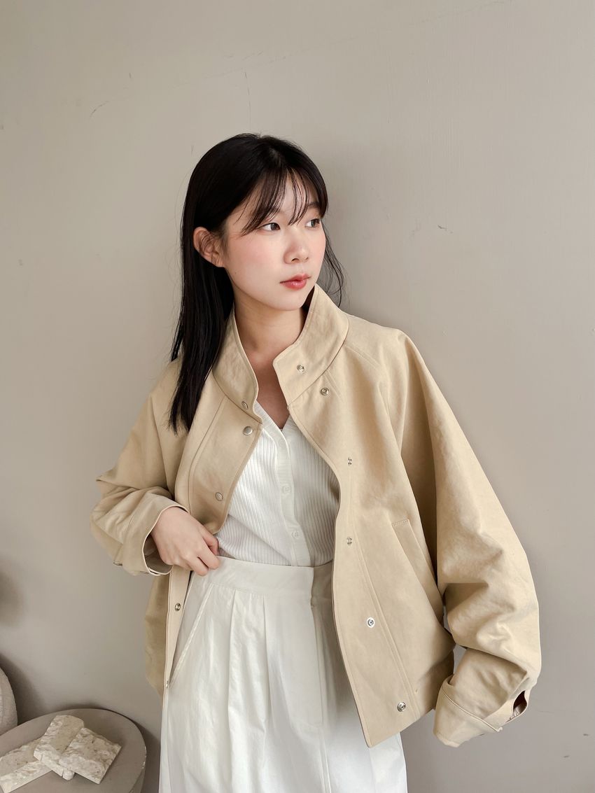 > 立領插肩袖壓釦短風衣外套(直播影片)
