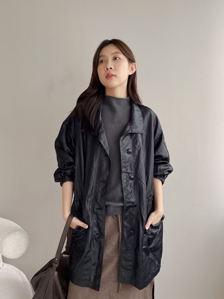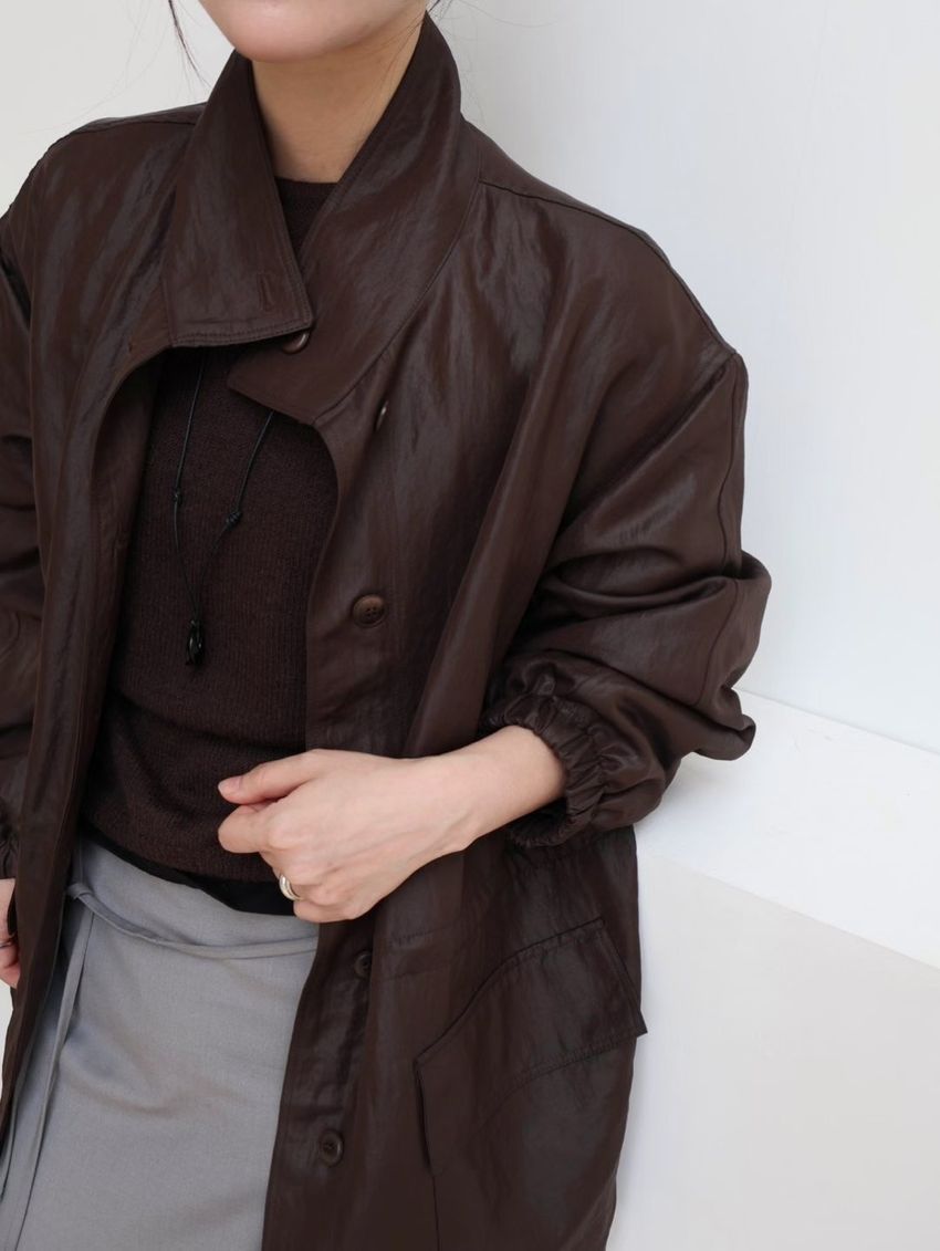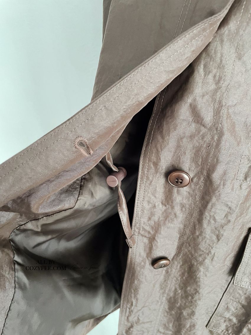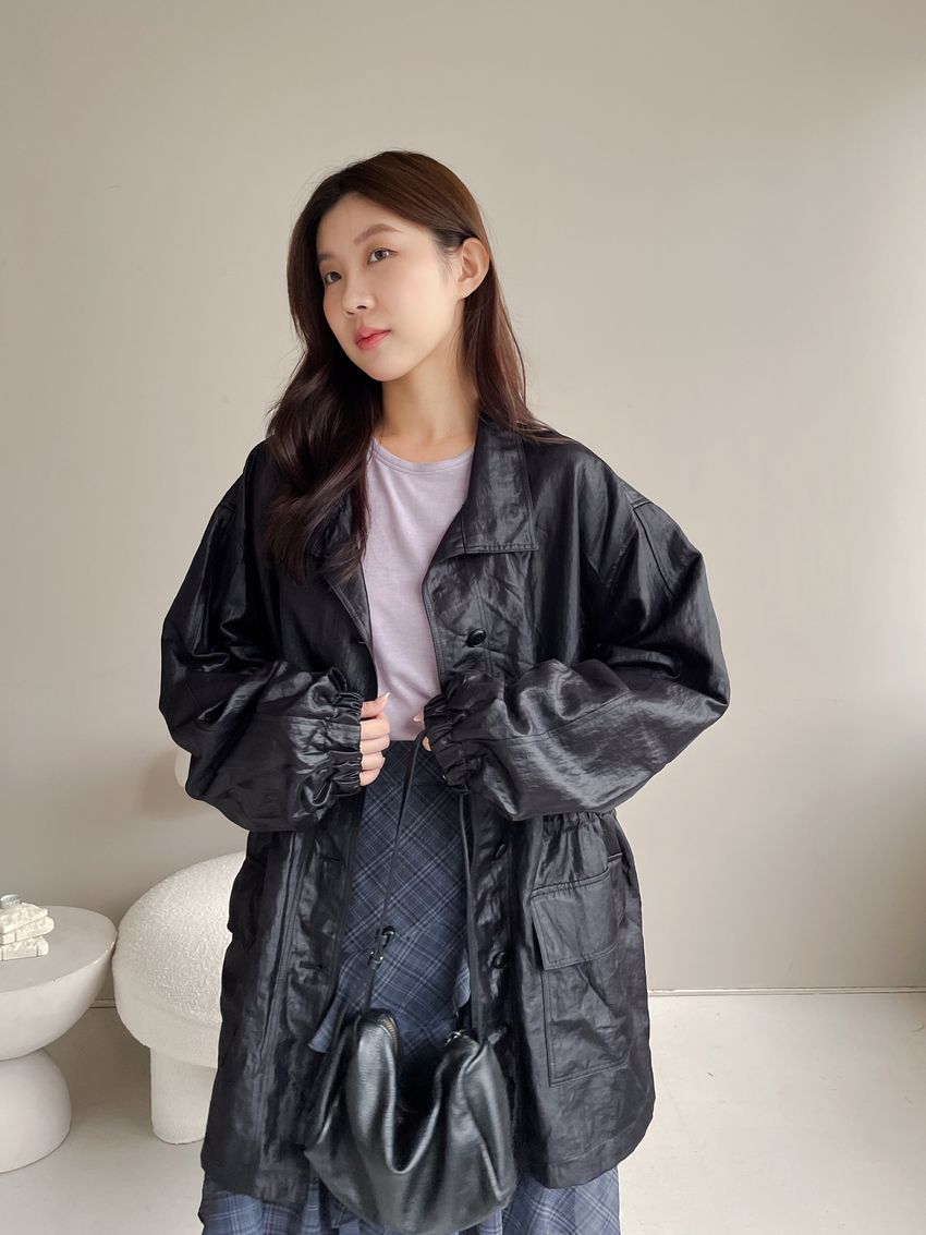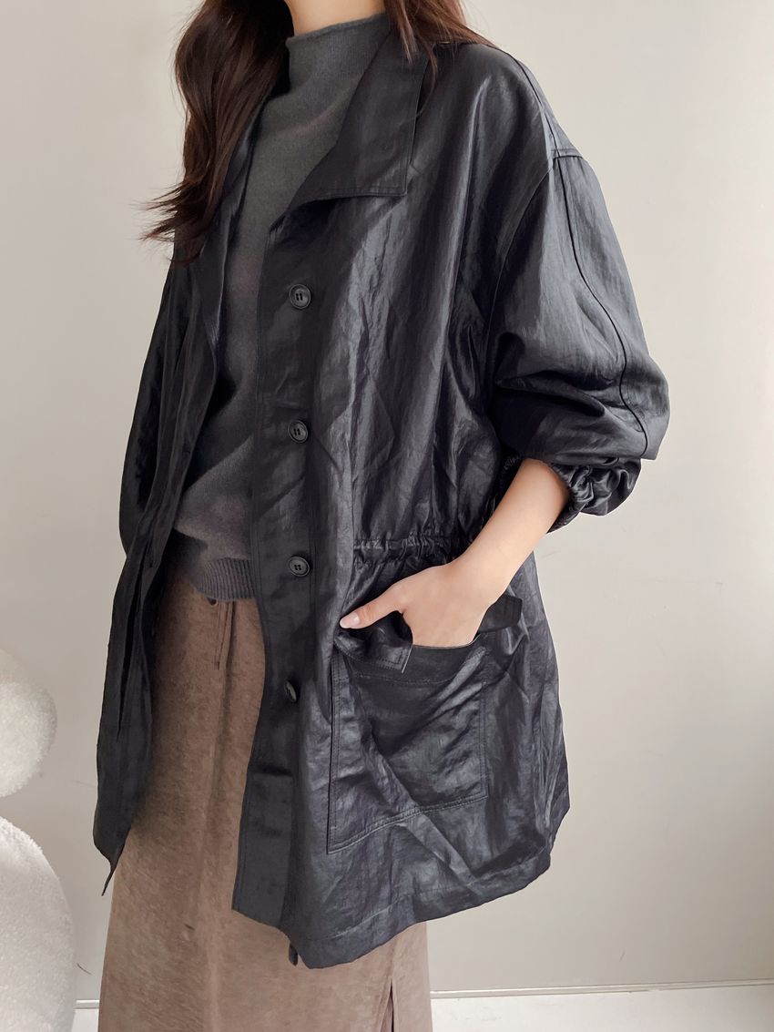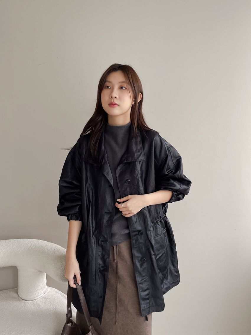 > 霧面皮質感光澤滑布抽繩風衣外套