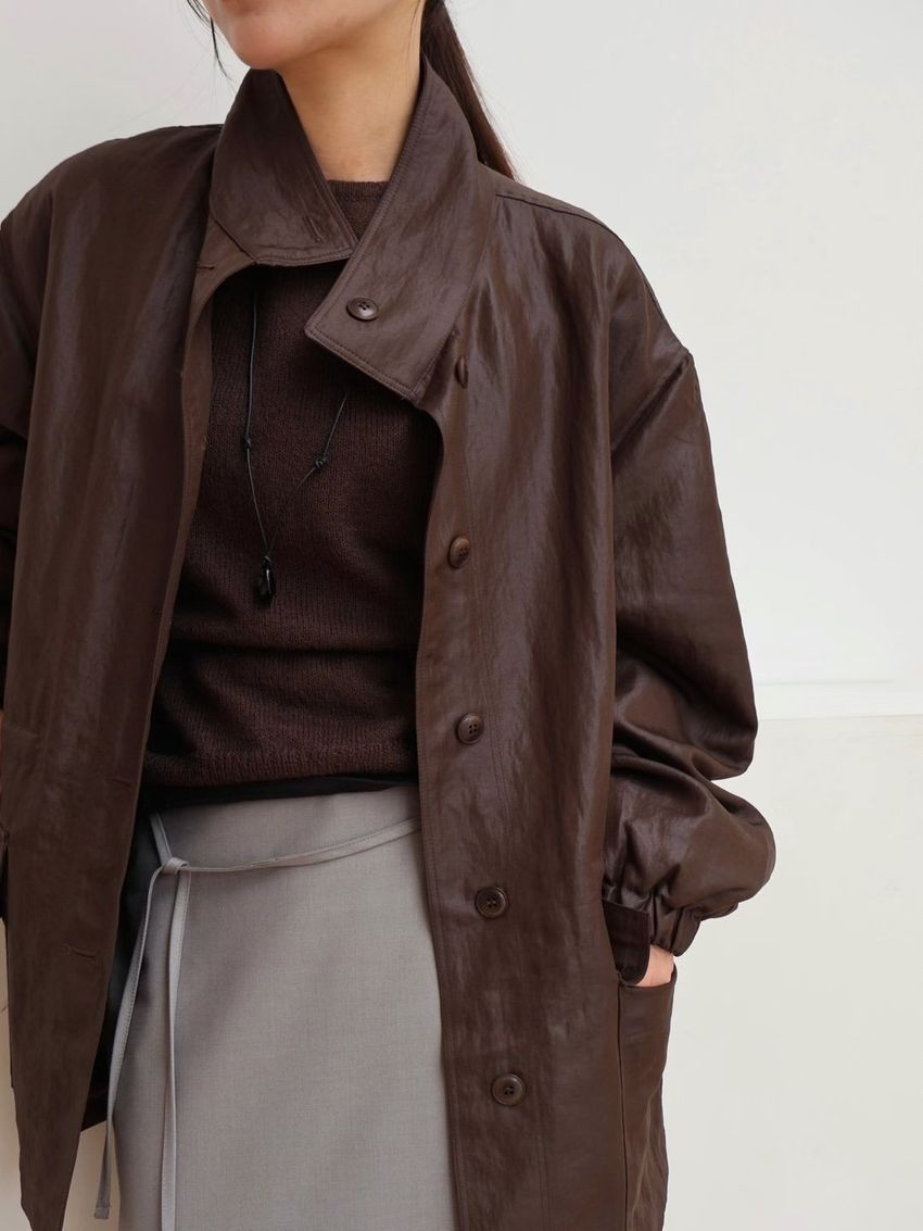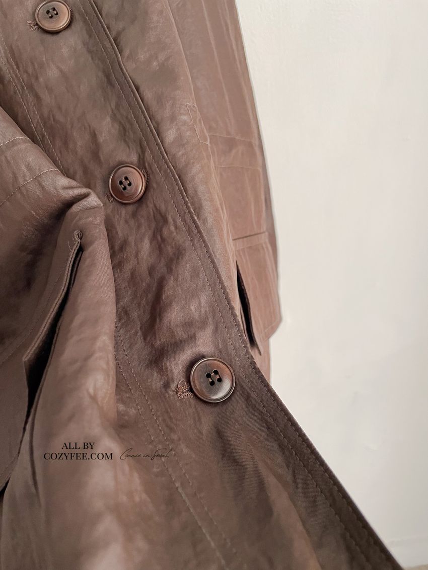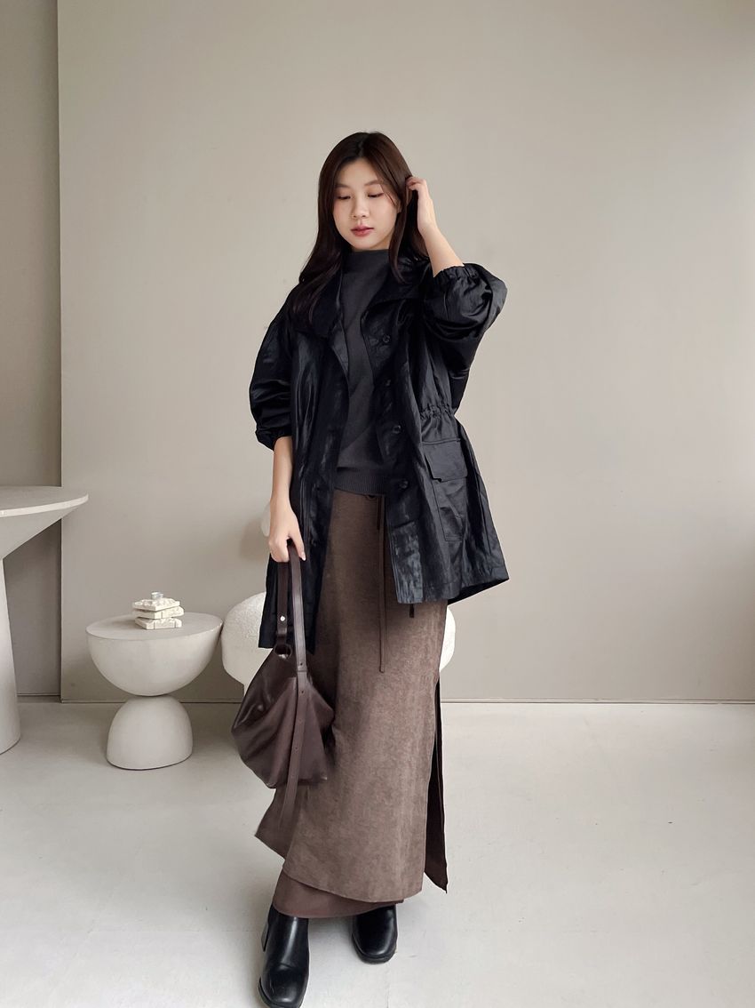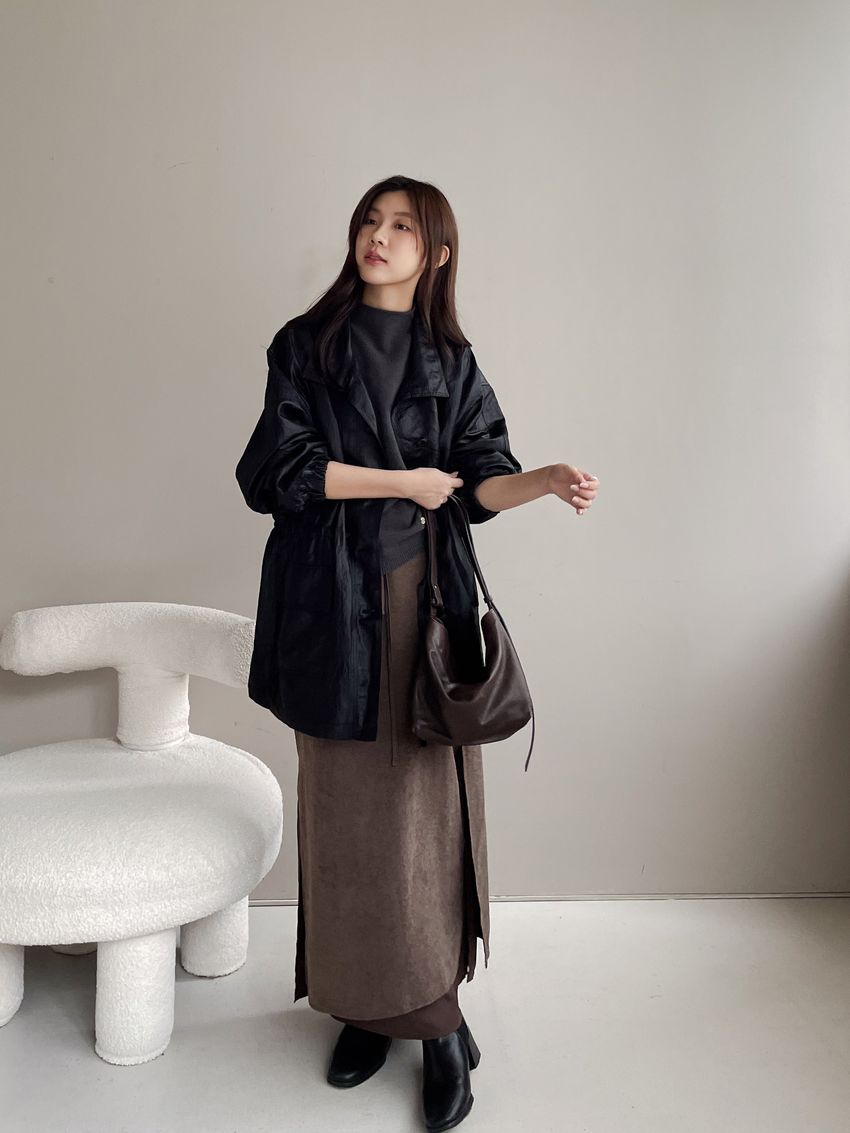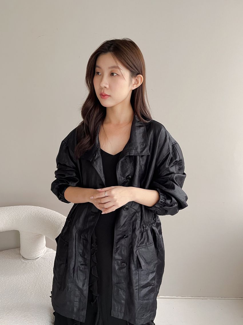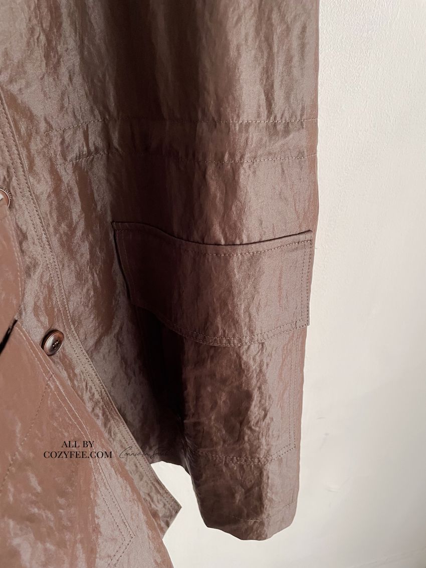 > 霧面皮質感光澤滑布抽繩風衣外套
