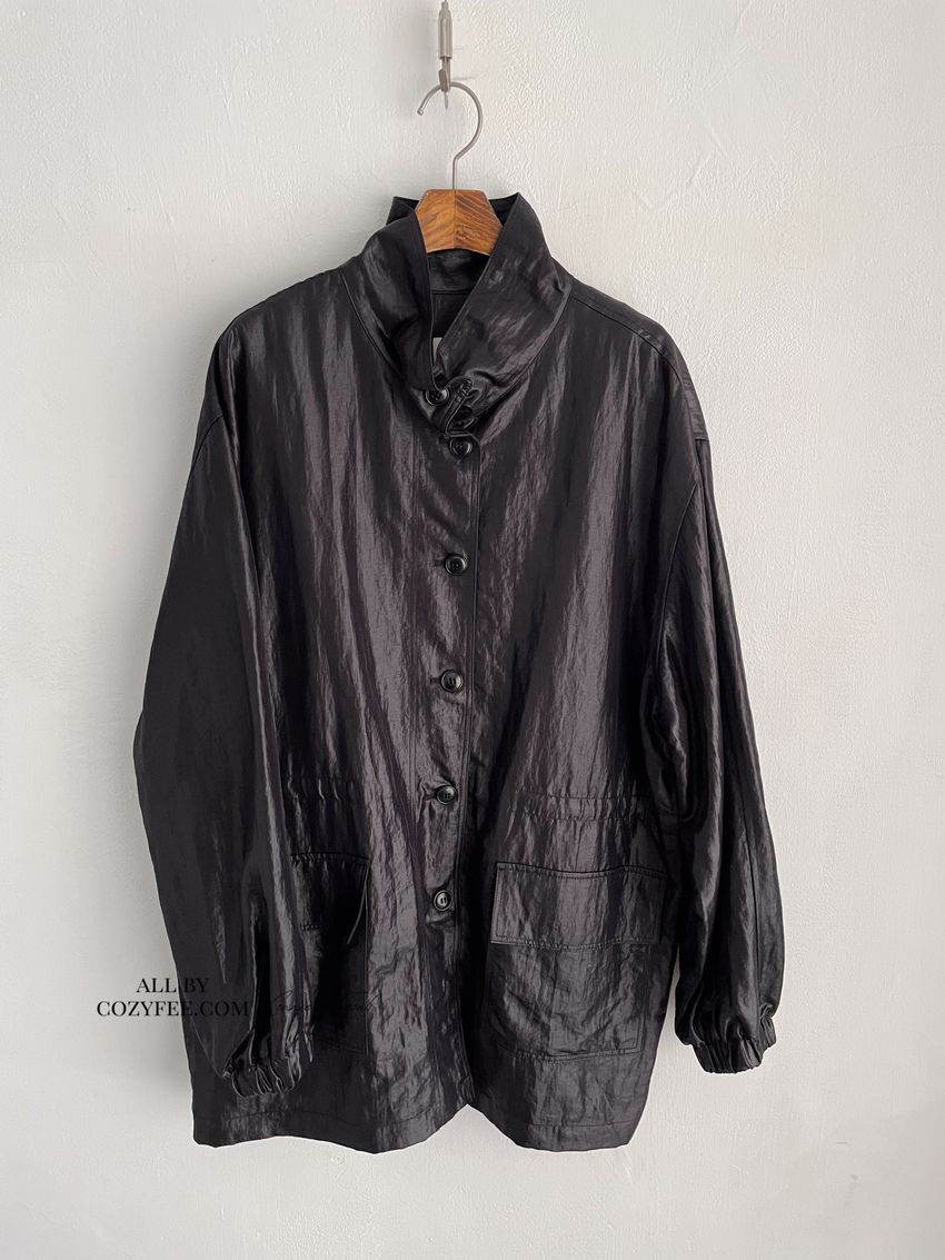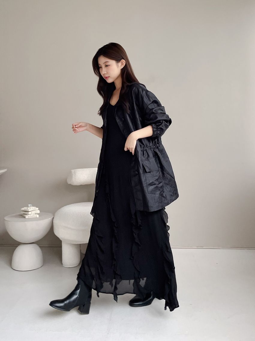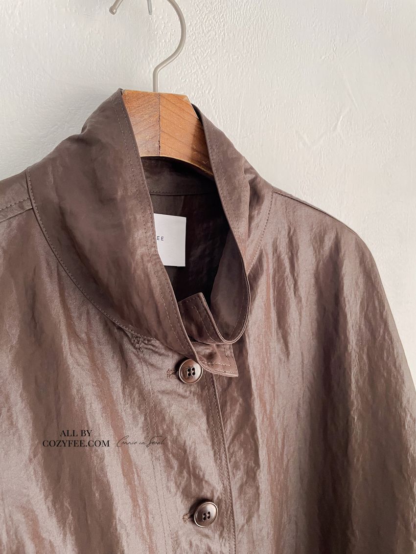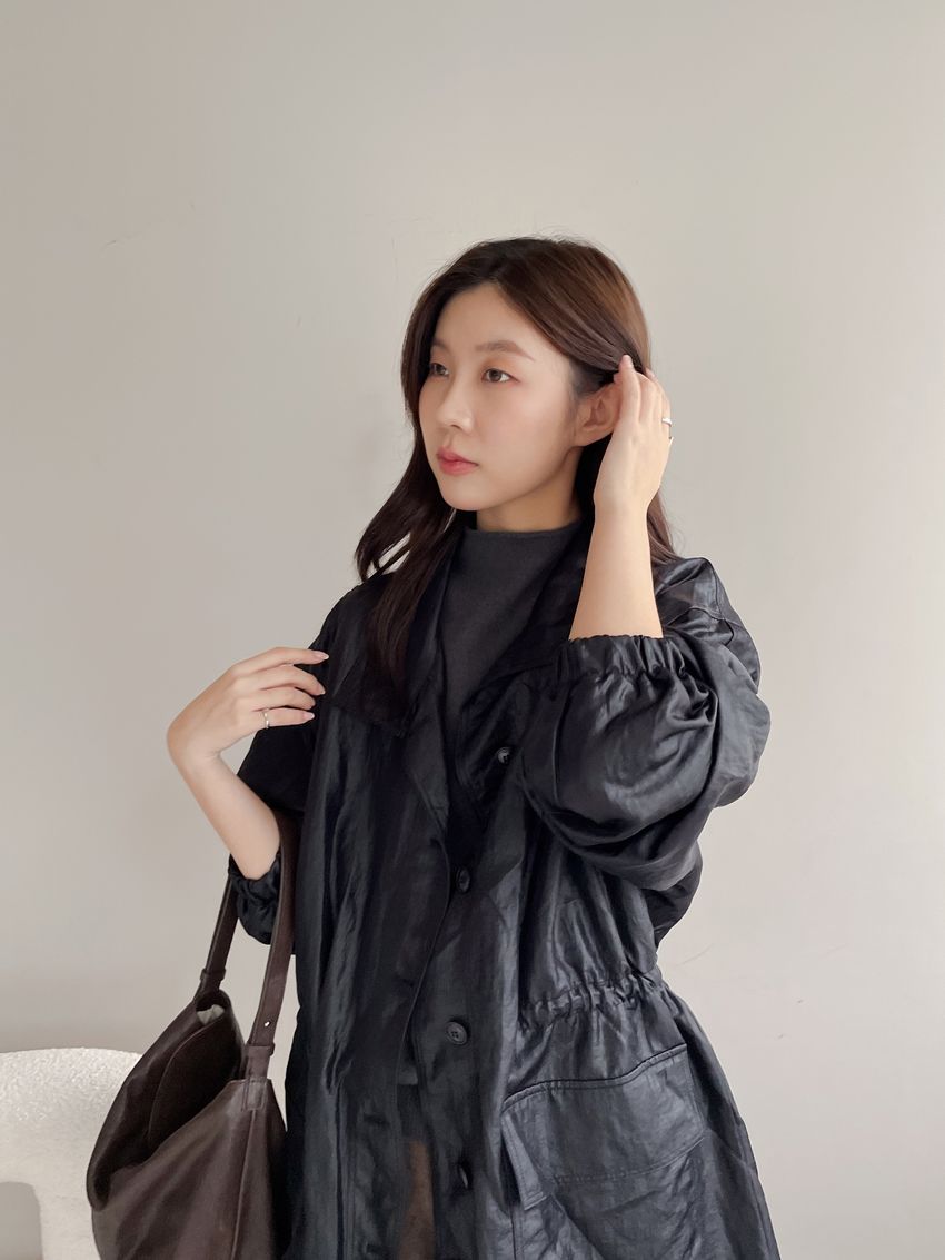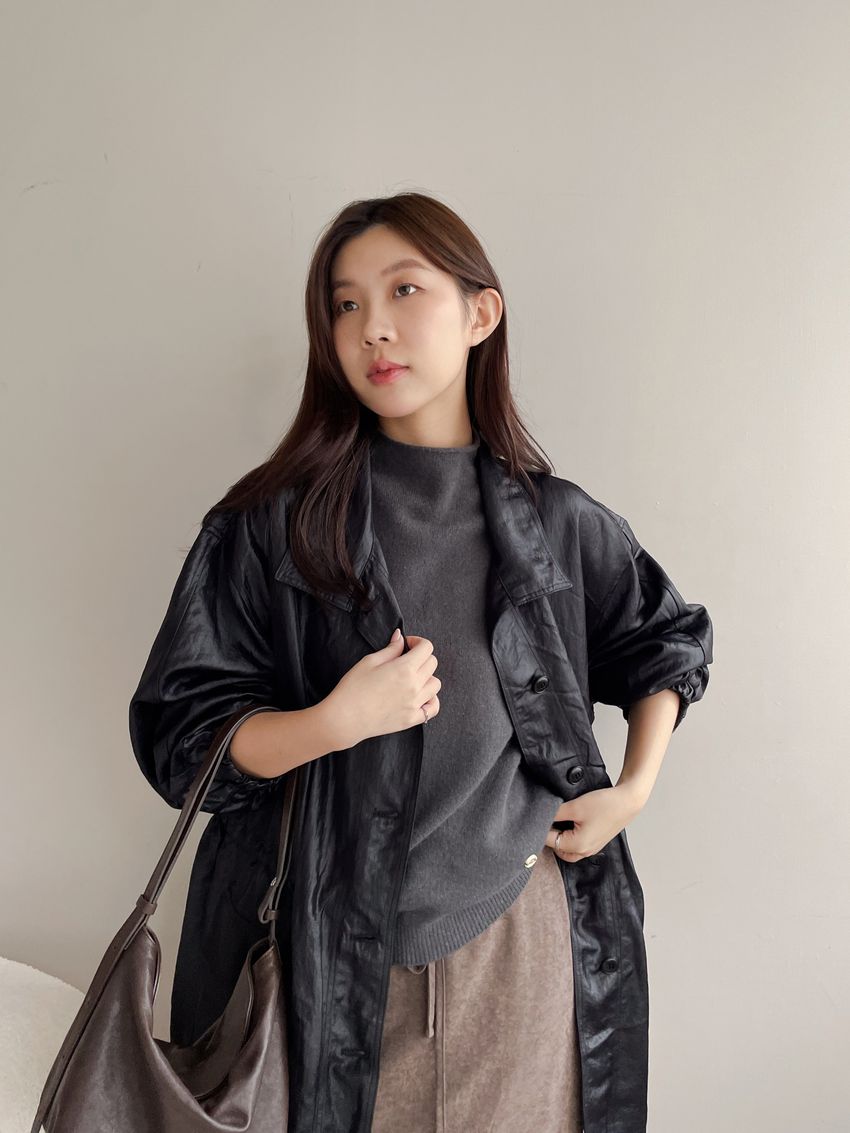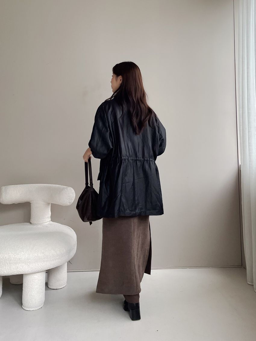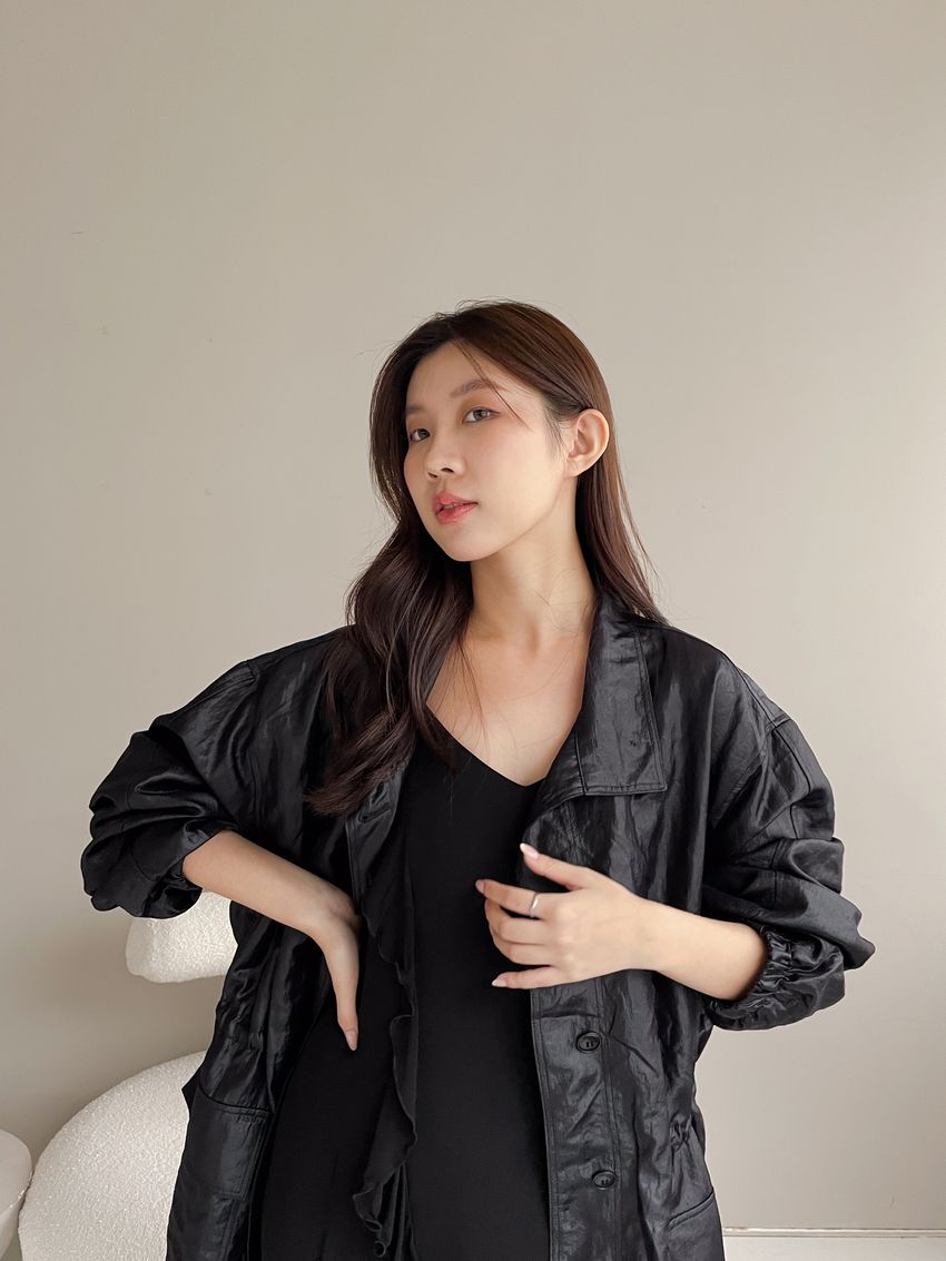 > 霧面皮質感光澤滑布抽繩風衣外套