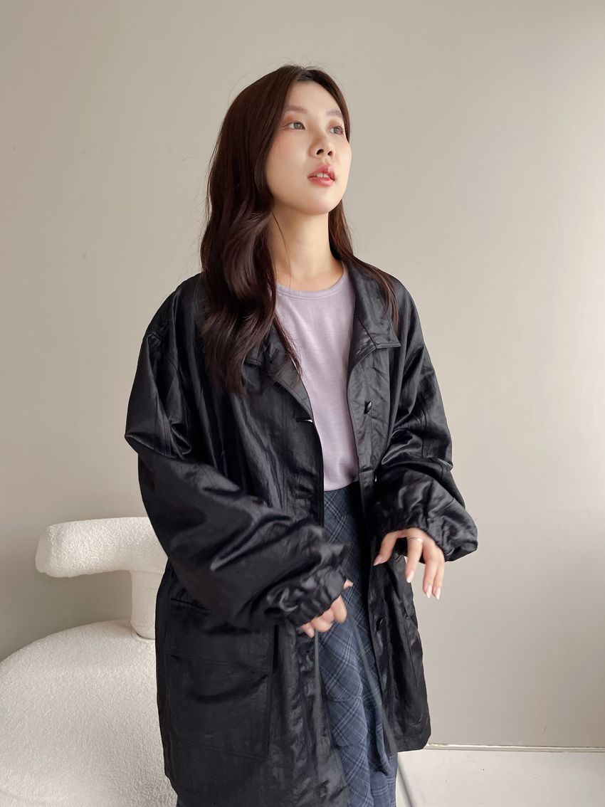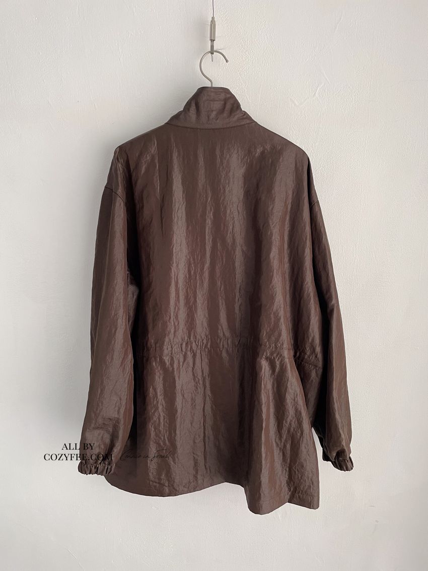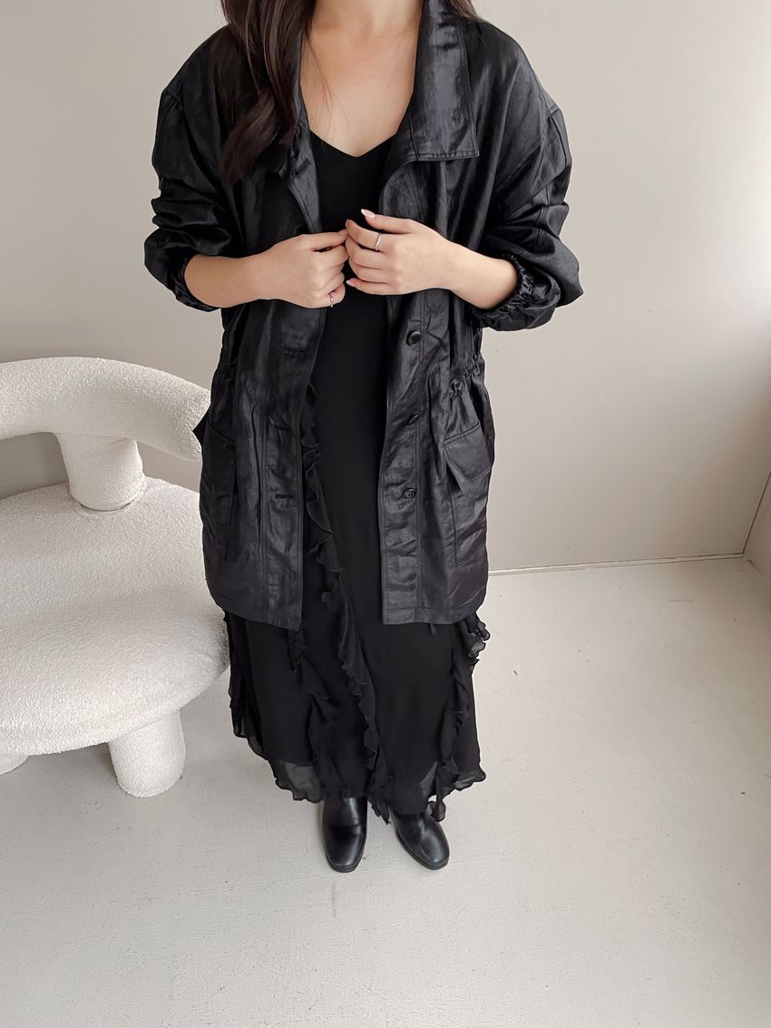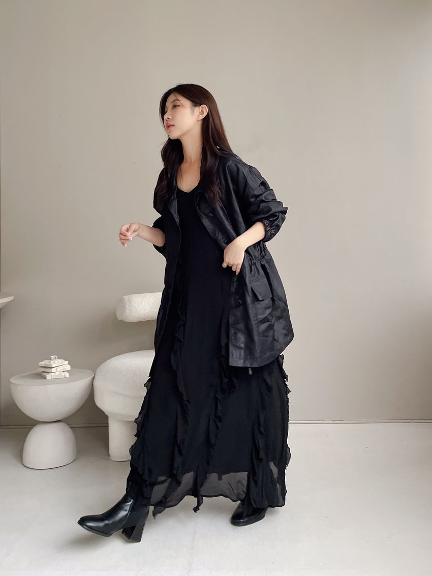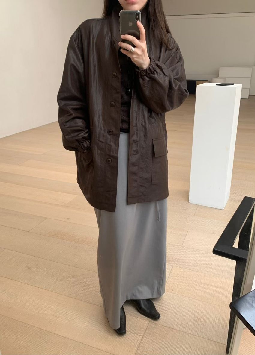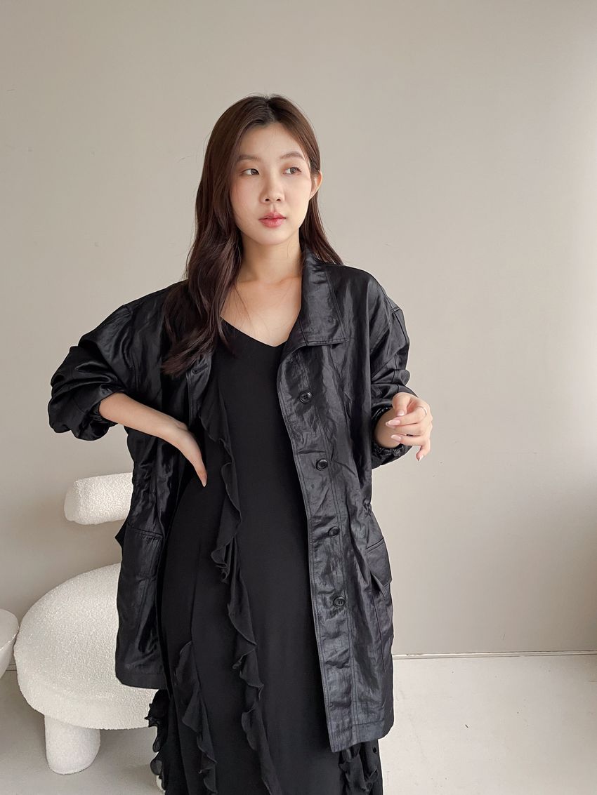 > 霧面皮質感光澤滑布抽繩風衣外套
