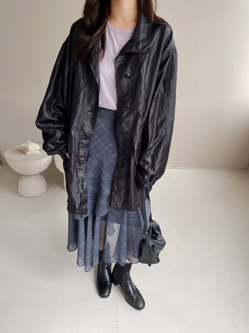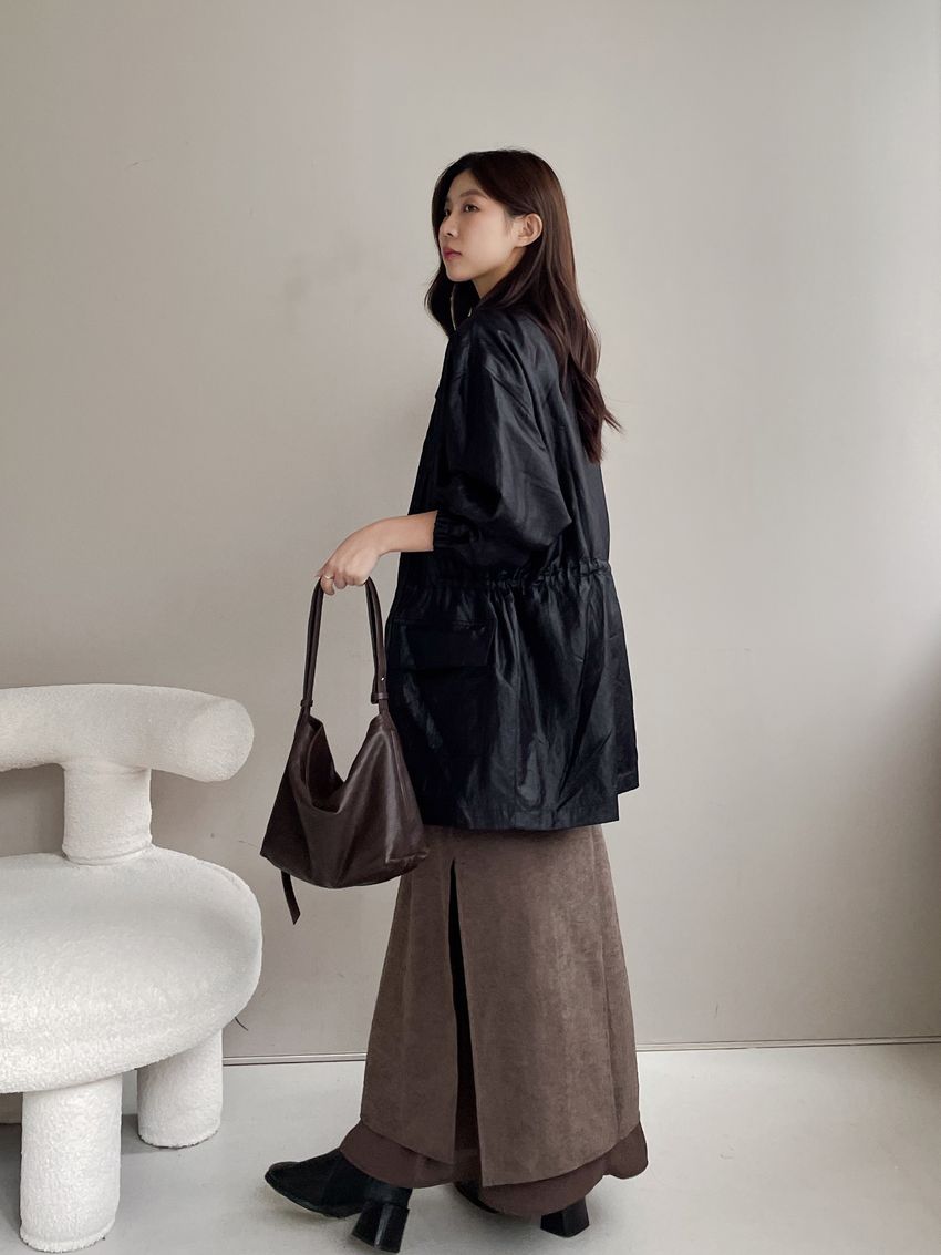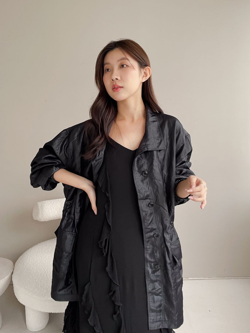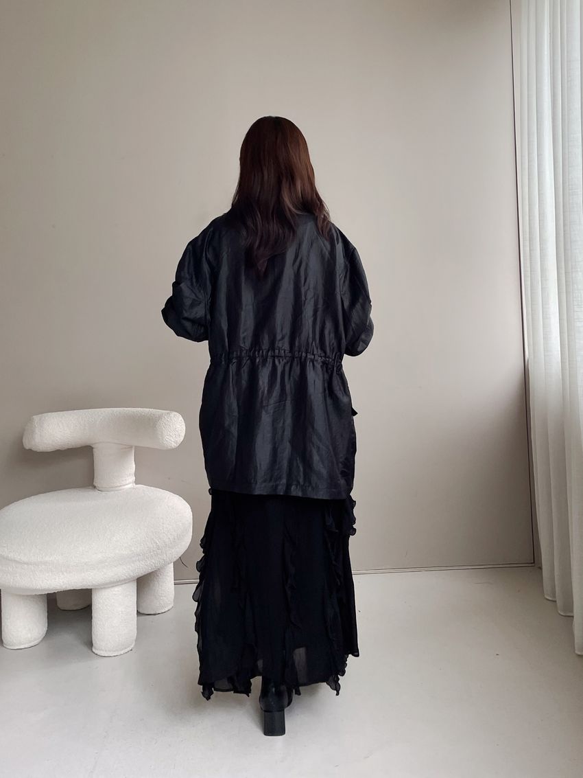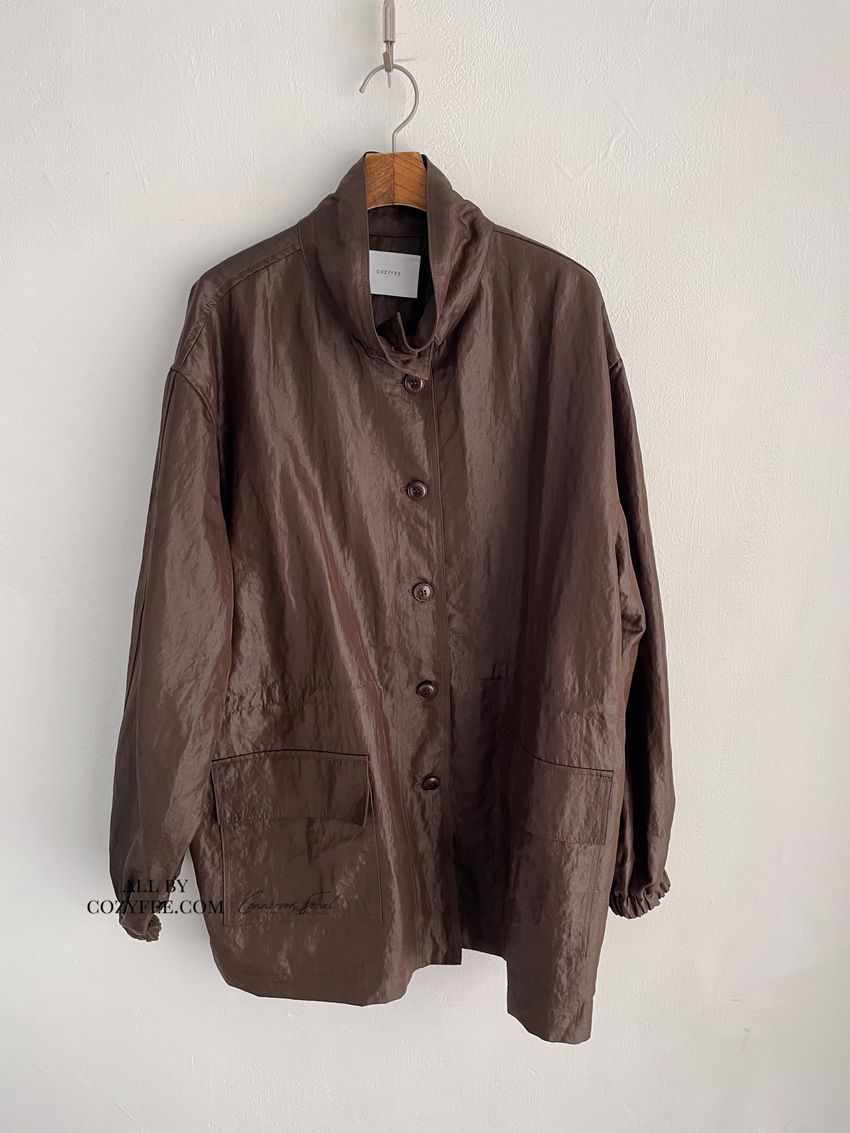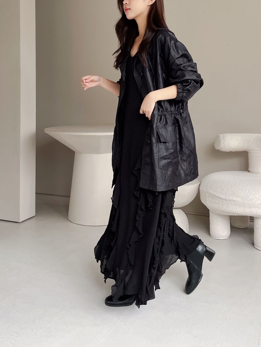 > 霧面皮質感光澤滑布抽繩風衣外套