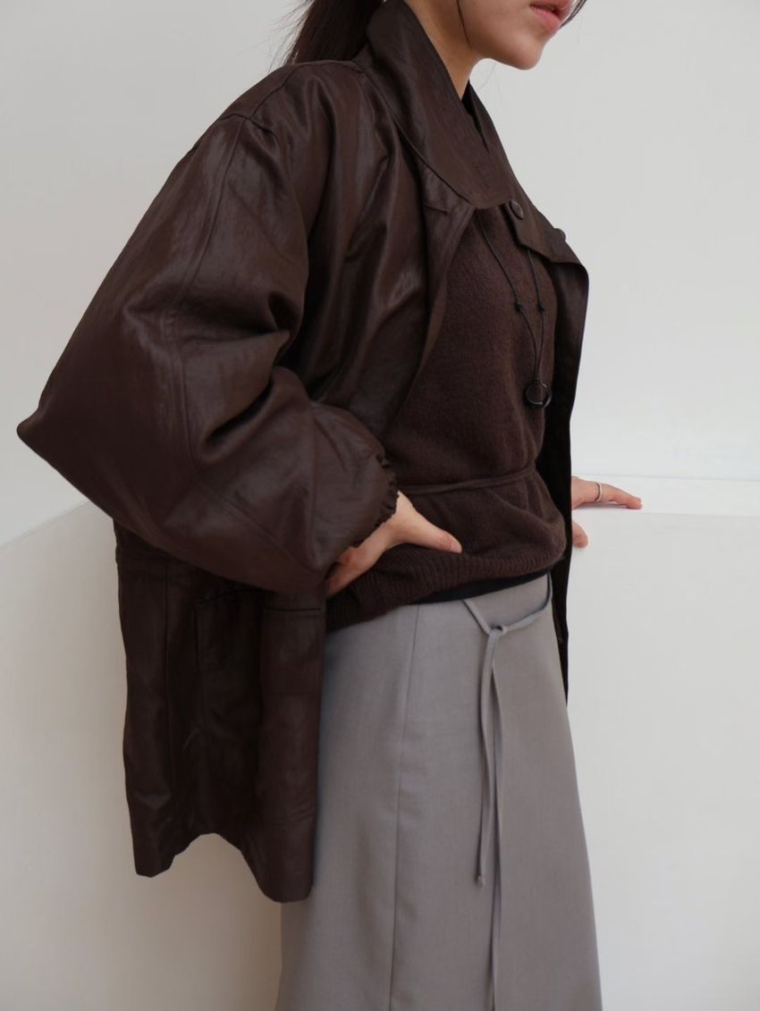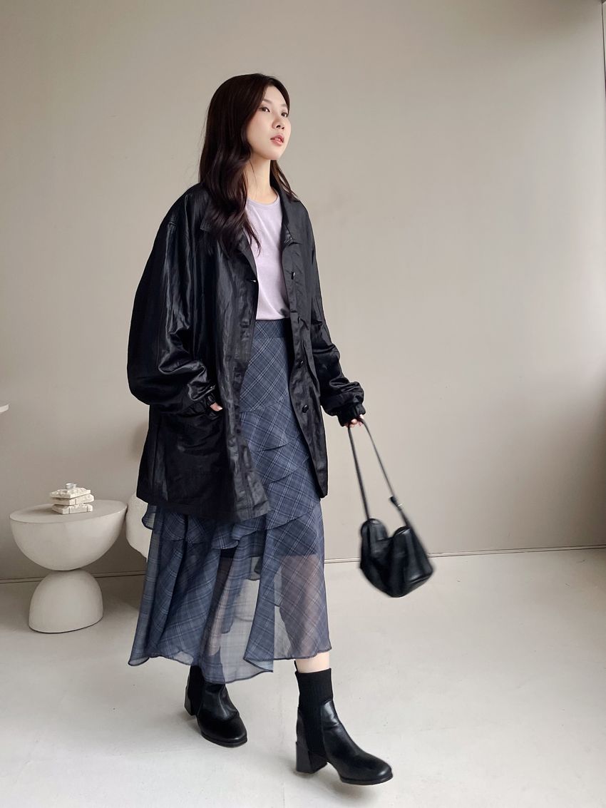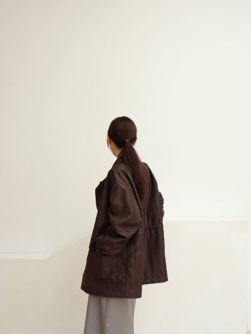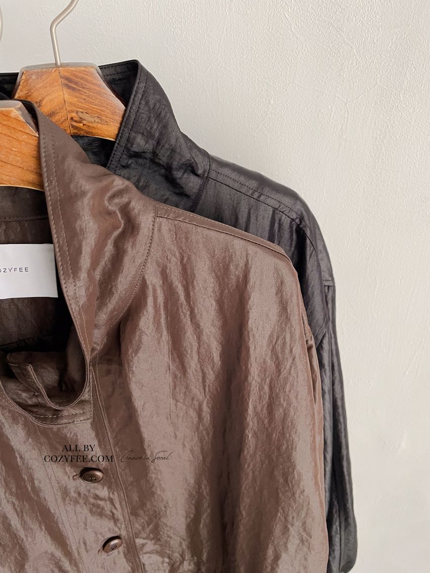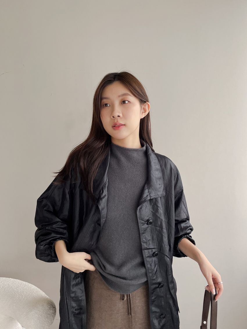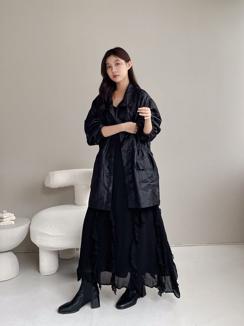 > 霧面皮質感光澤滑布抽繩風衣外套