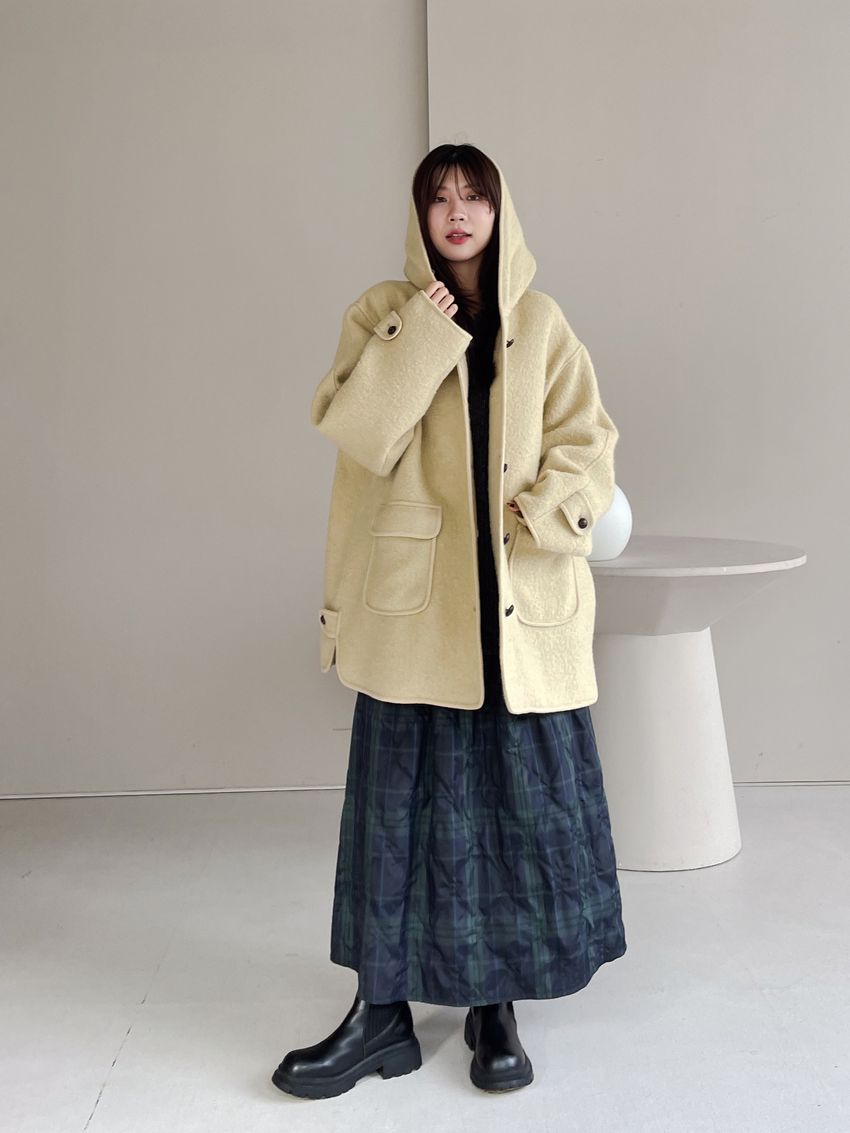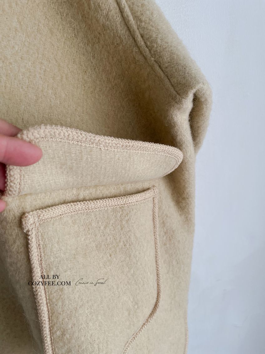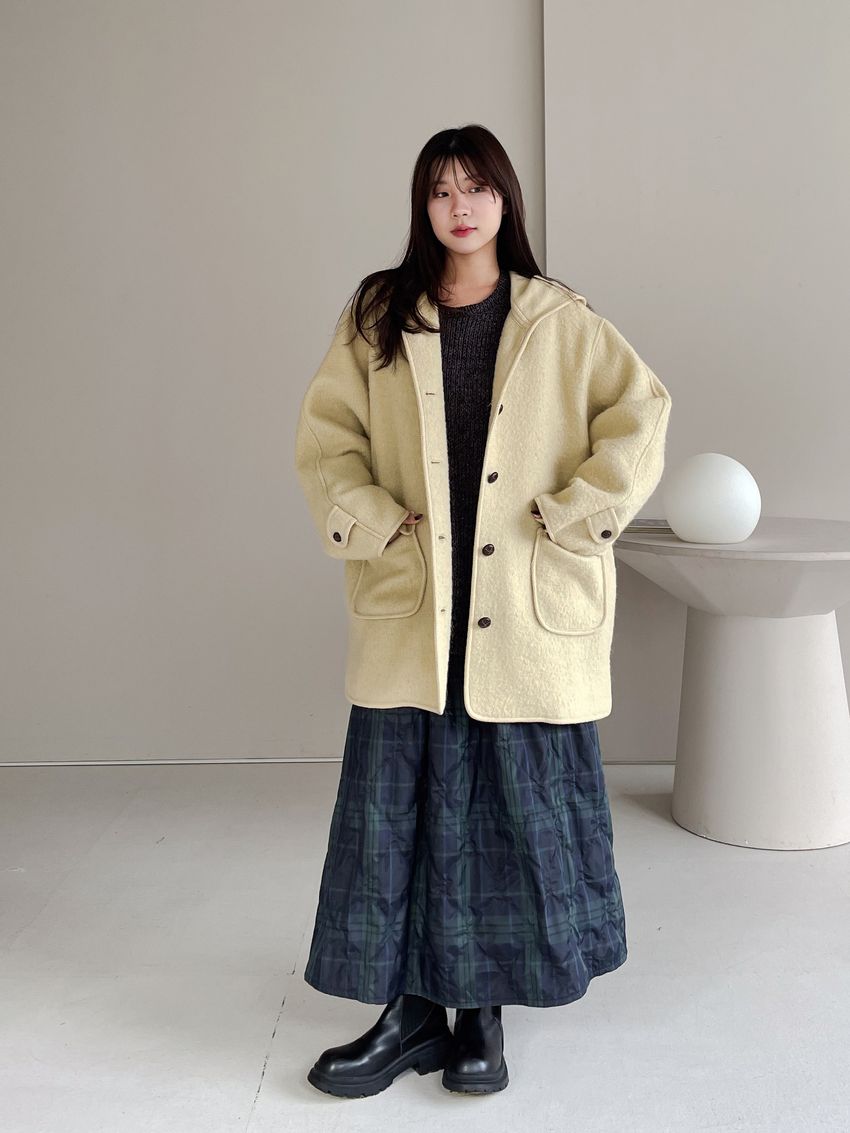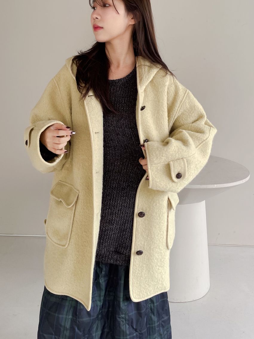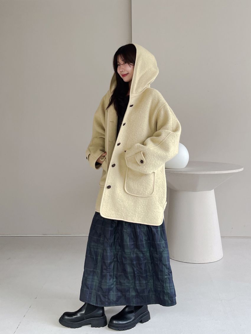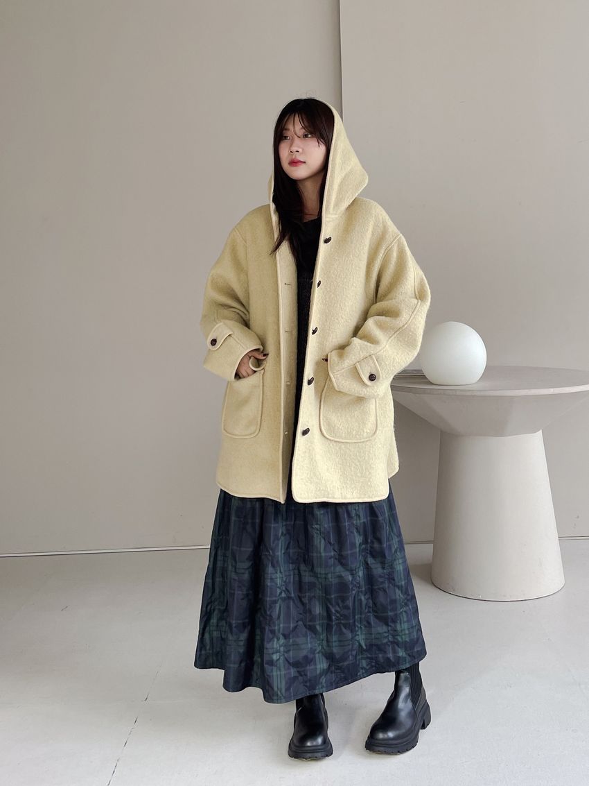 > 羊駝毛木釦連帽大衣(特)