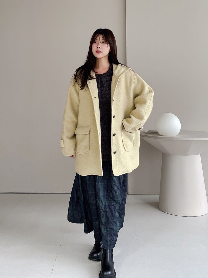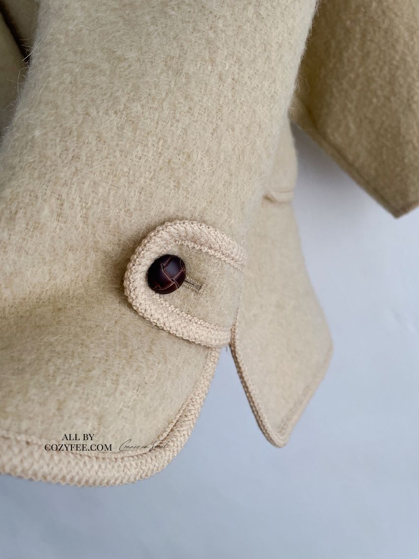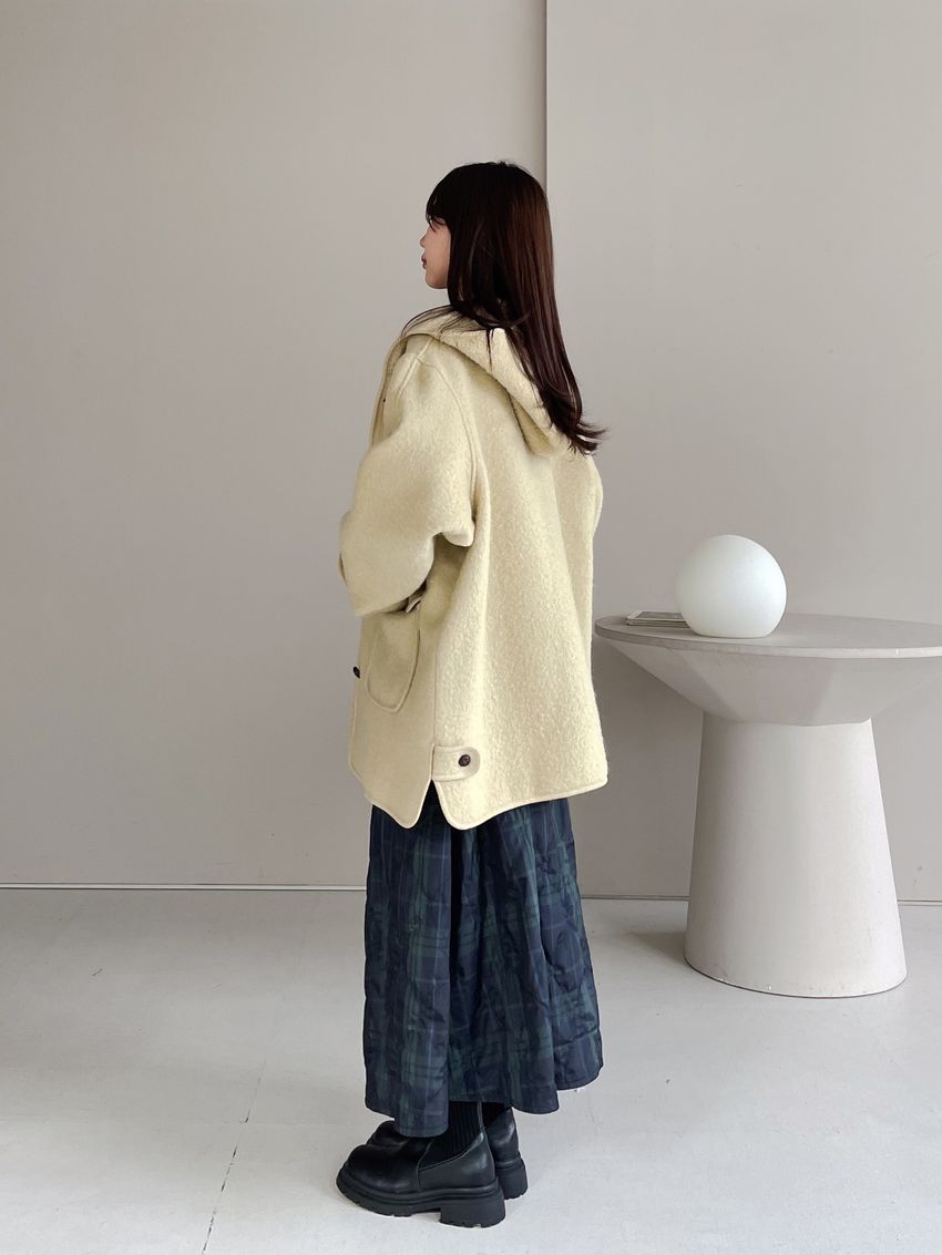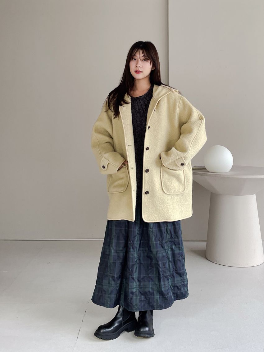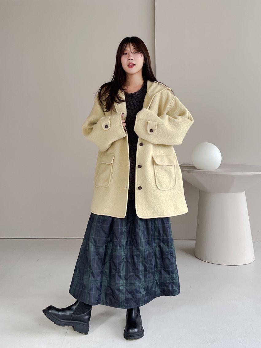 > 羊駝毛木釦連帽大衣(特)