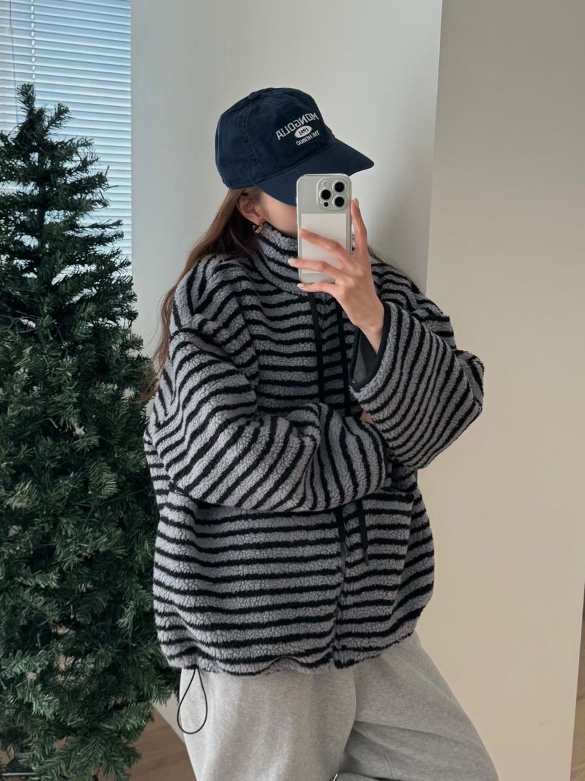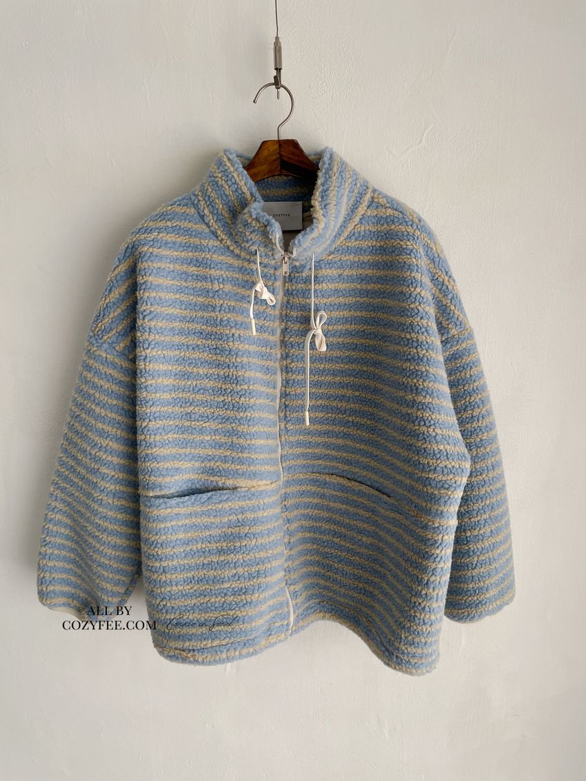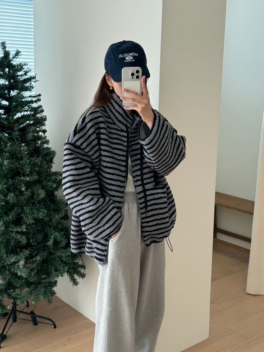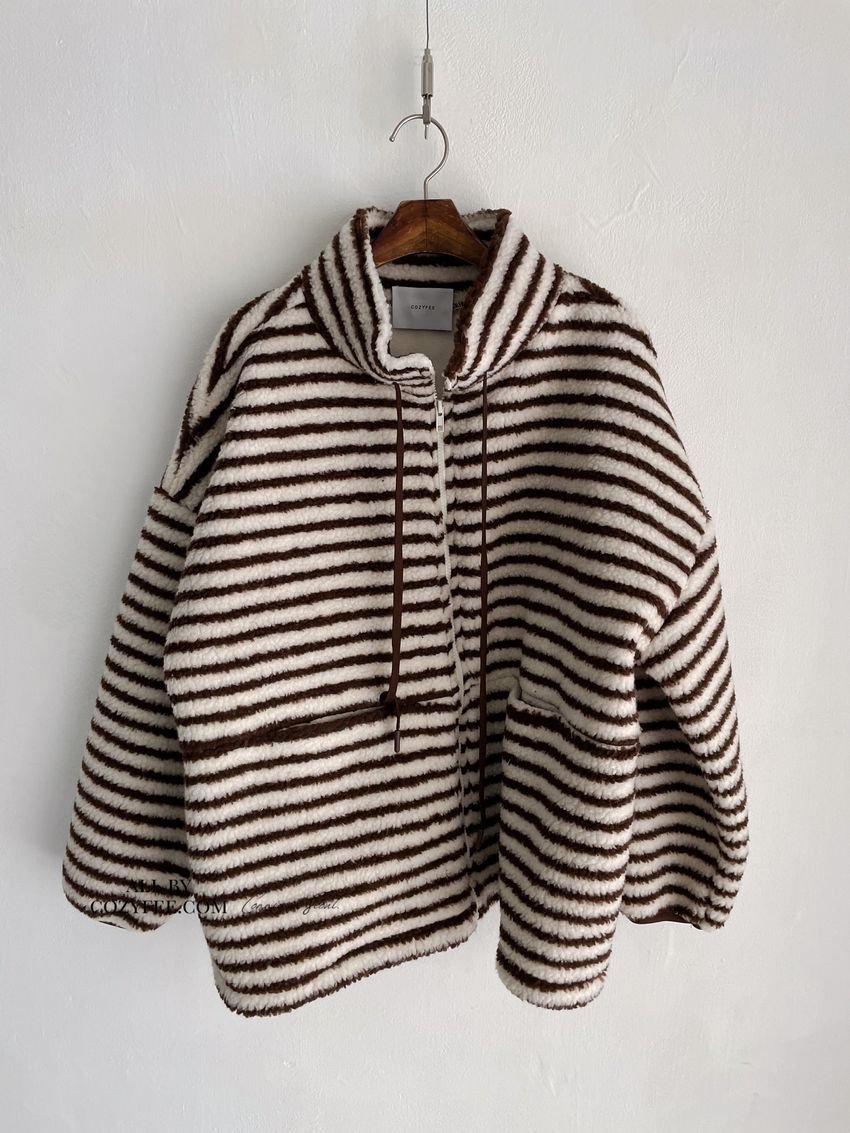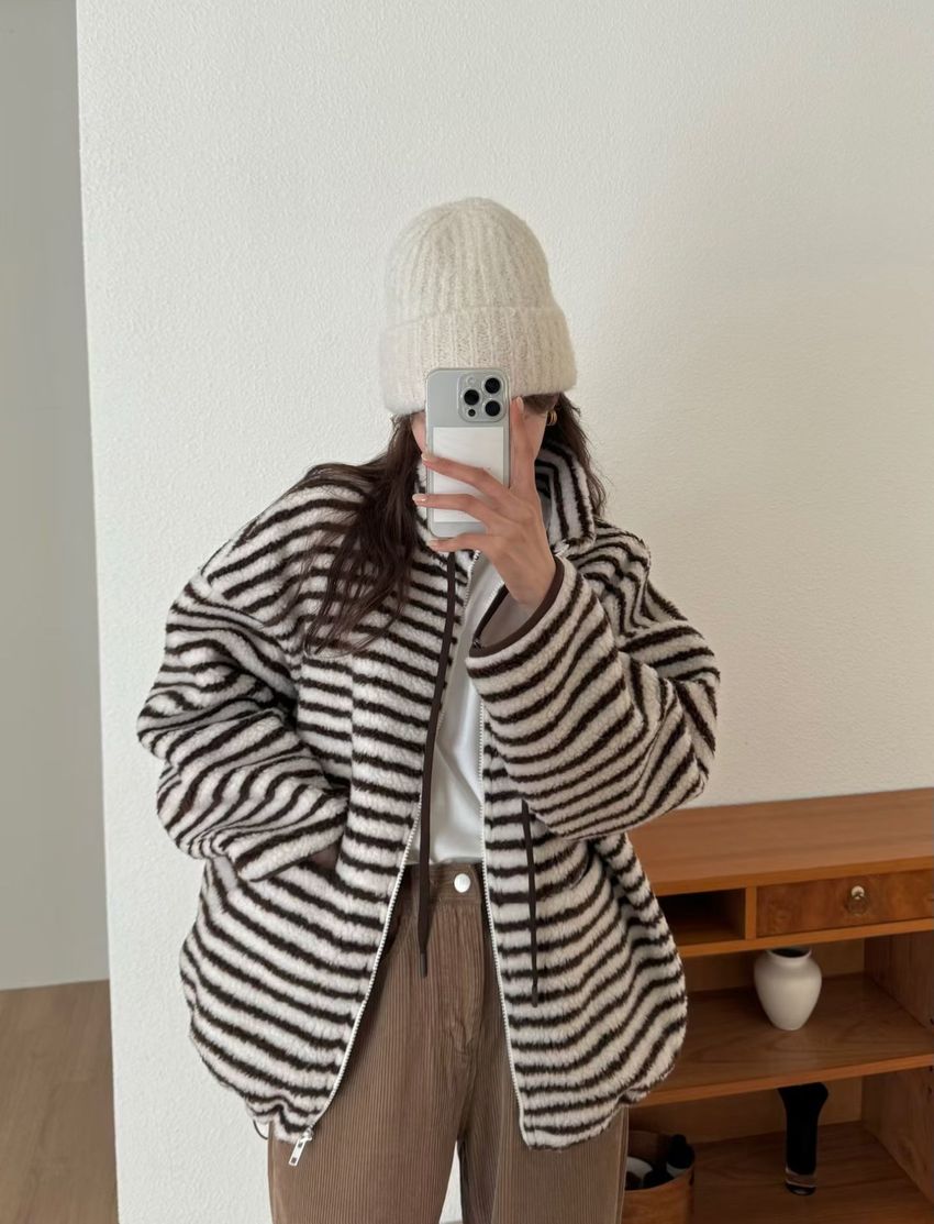 Connie推薦款!立領條紋羔羊毛拉鍊外套(特)(直播款)