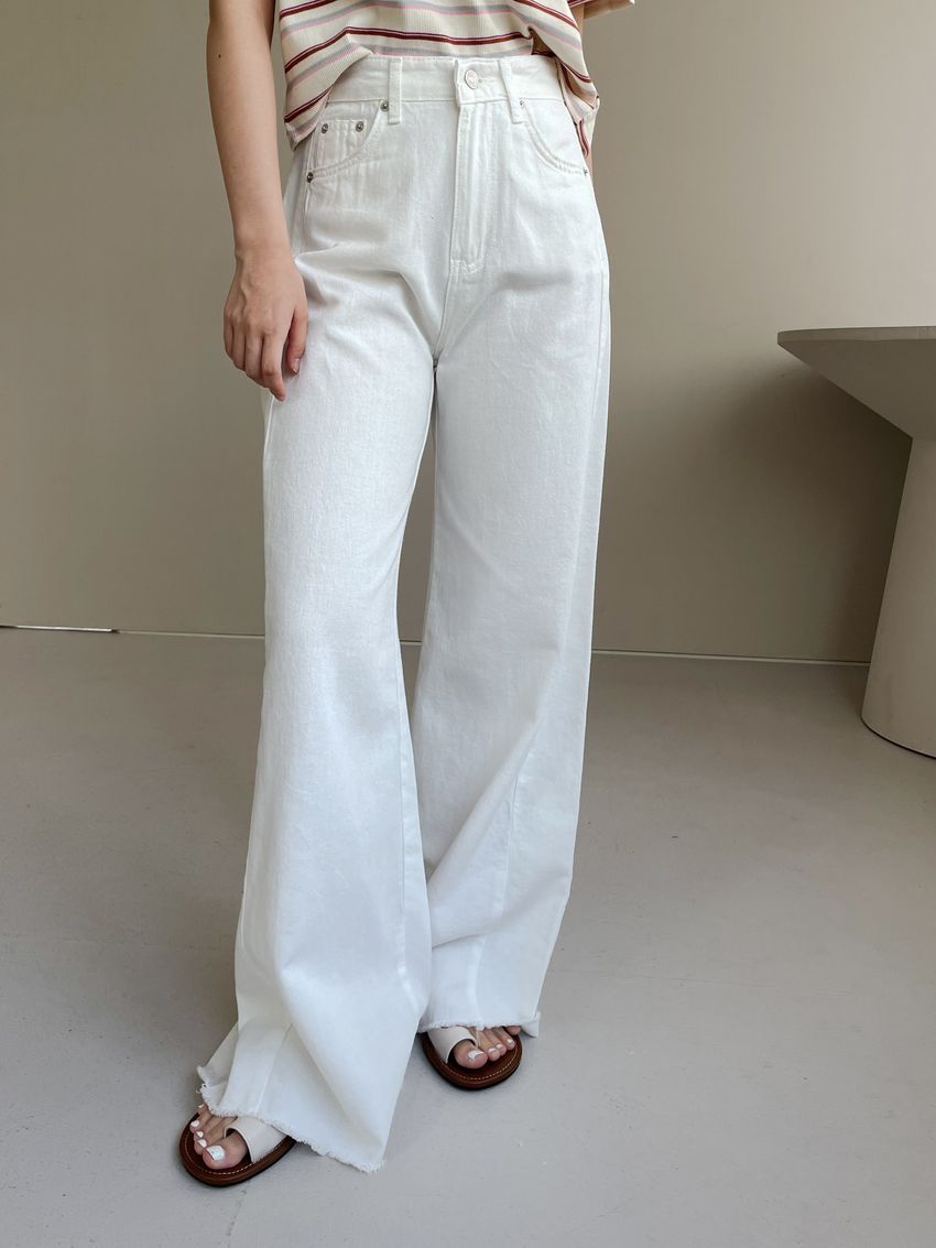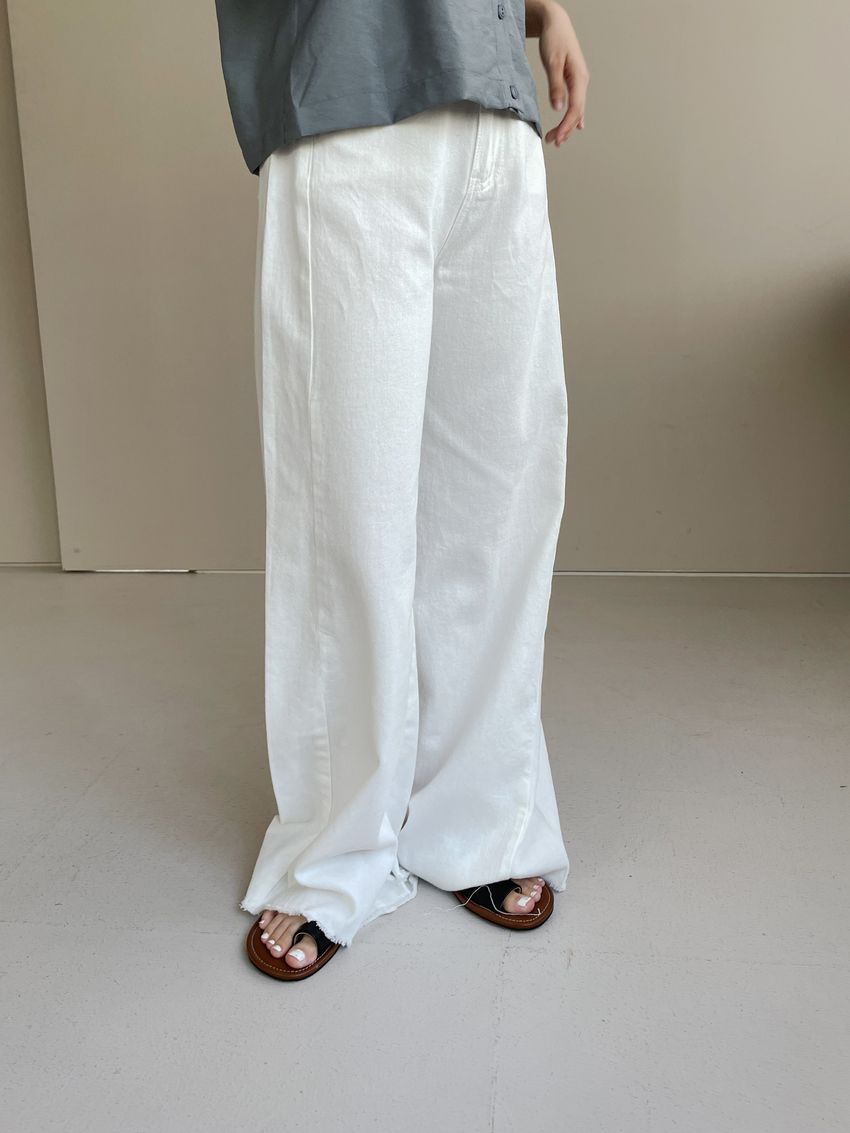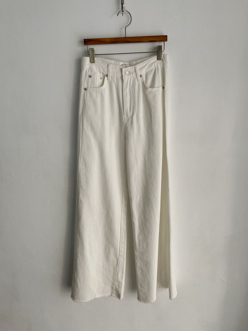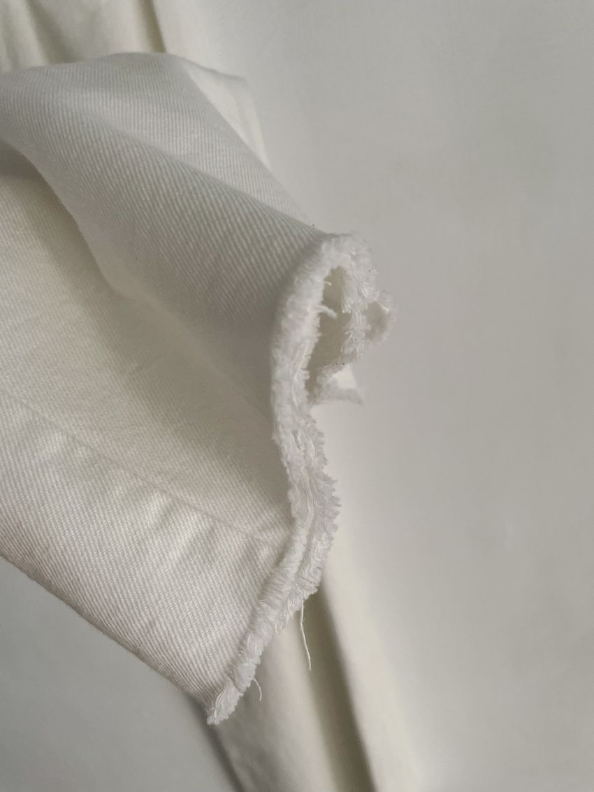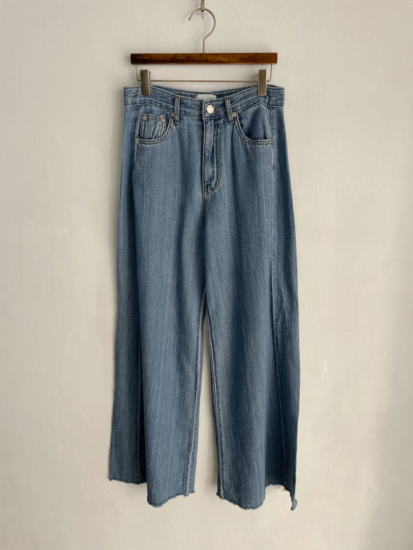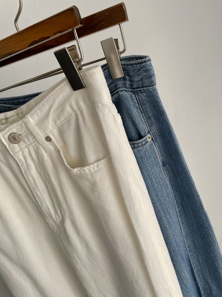 100%cotton跟P2407015相比 這款的褲管A字比較小一點中高腰 A版型的褲管視覺上腰線起始位置比較高 有拉長比例長腿效果夏季薄軟料的丹寧 很輕薄舒服褲腳抽鬚不收邊布料無彈性