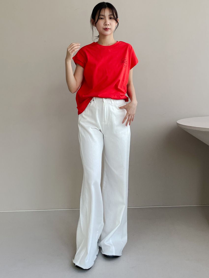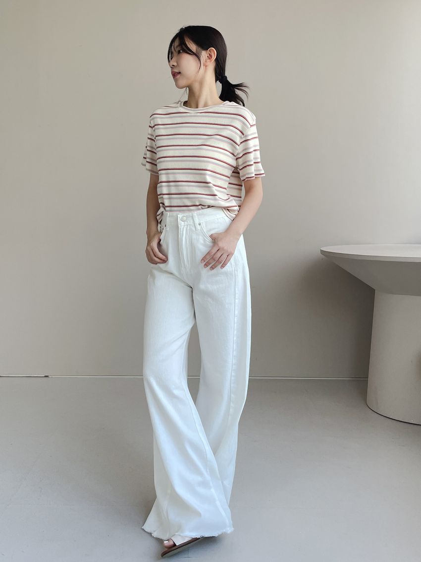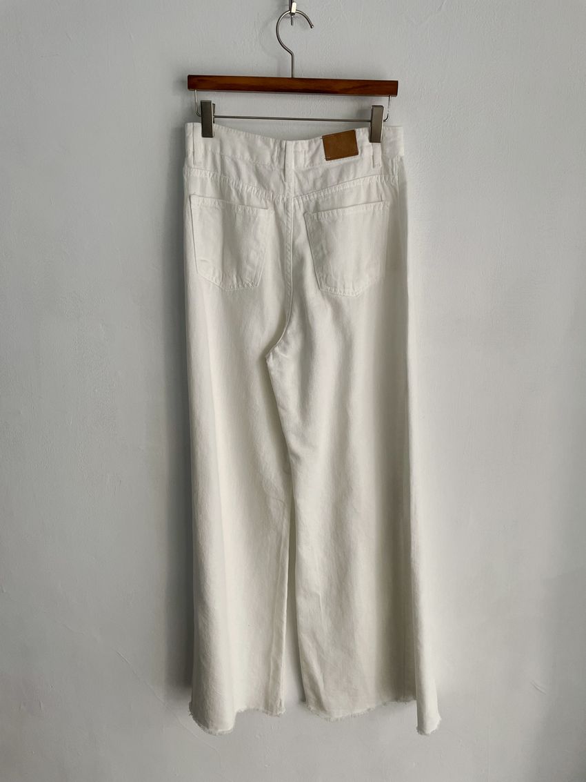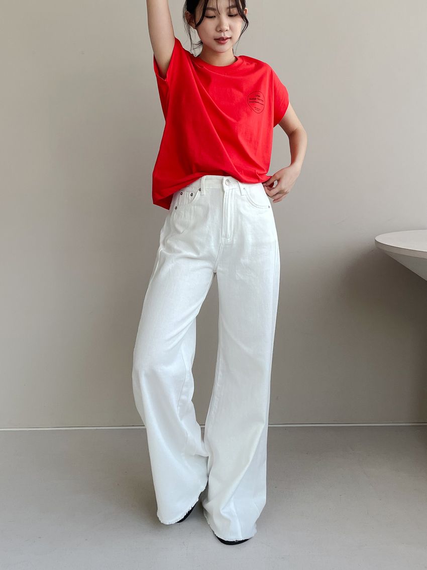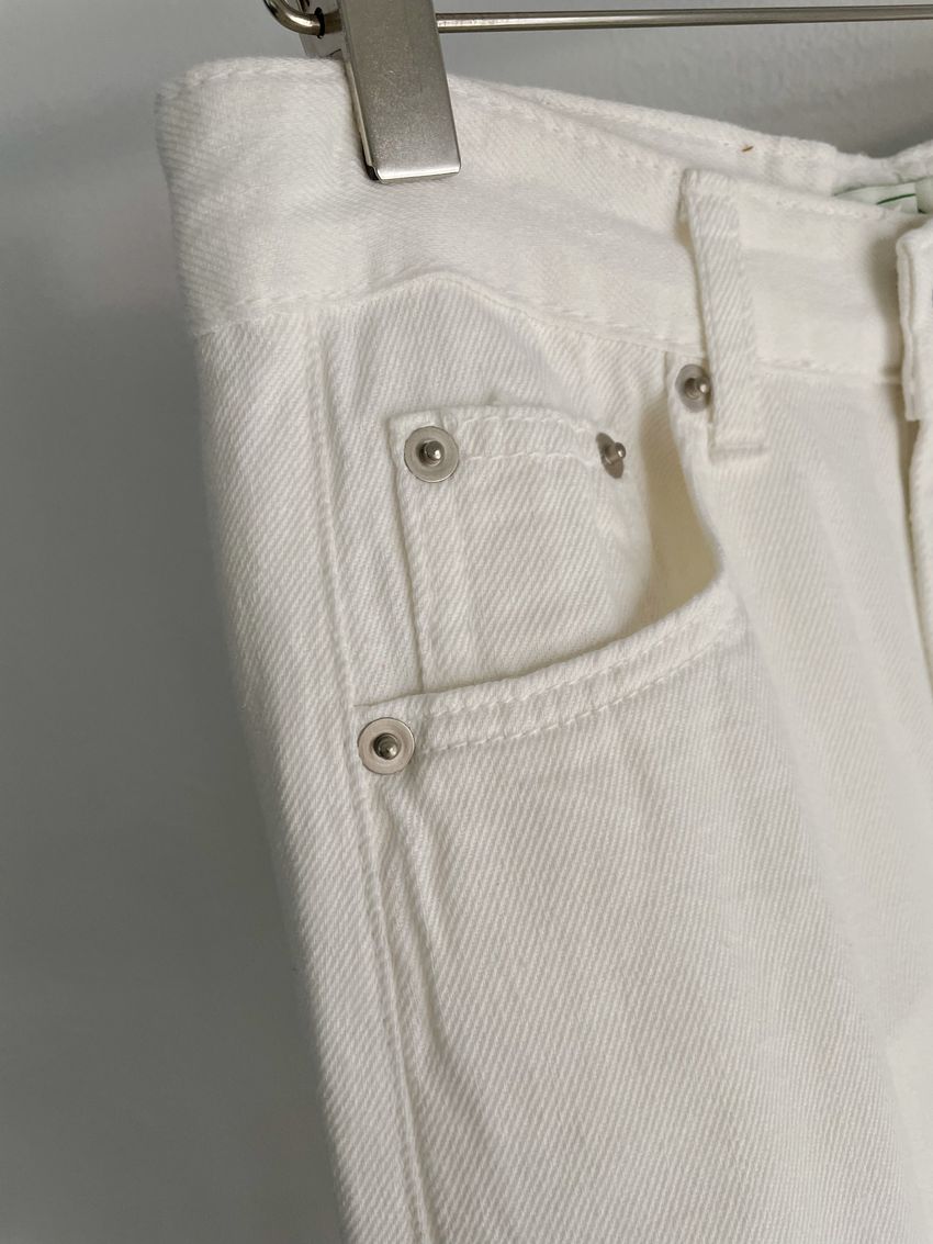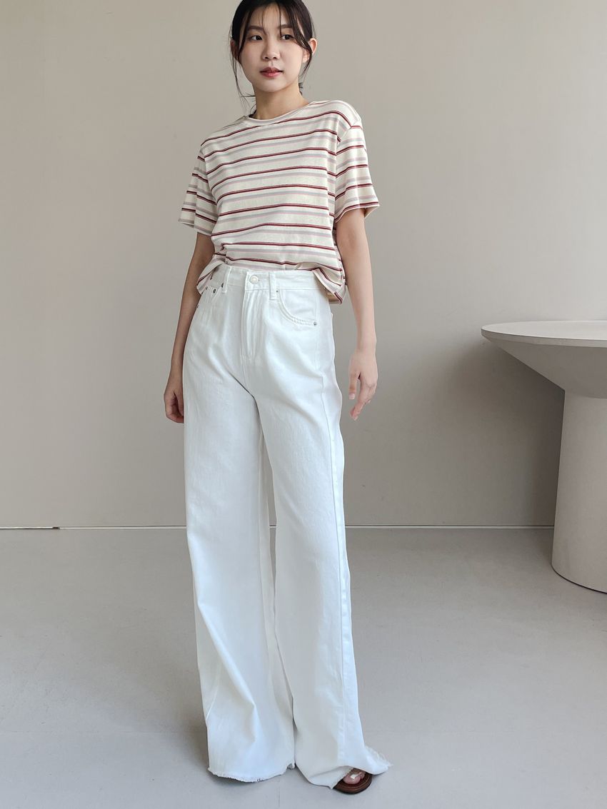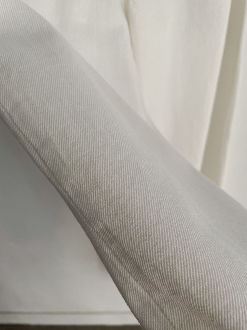 100%cotton跟P2407015相比 這款的褲管A字比較小一點中高腰 A版型的褲管視覺上腰線起始位置比較高 有拉長比例長腿效果夏季薄軟料的丹寧 很輕薄舒服褲腳抽鬚不收邊布料無彈性