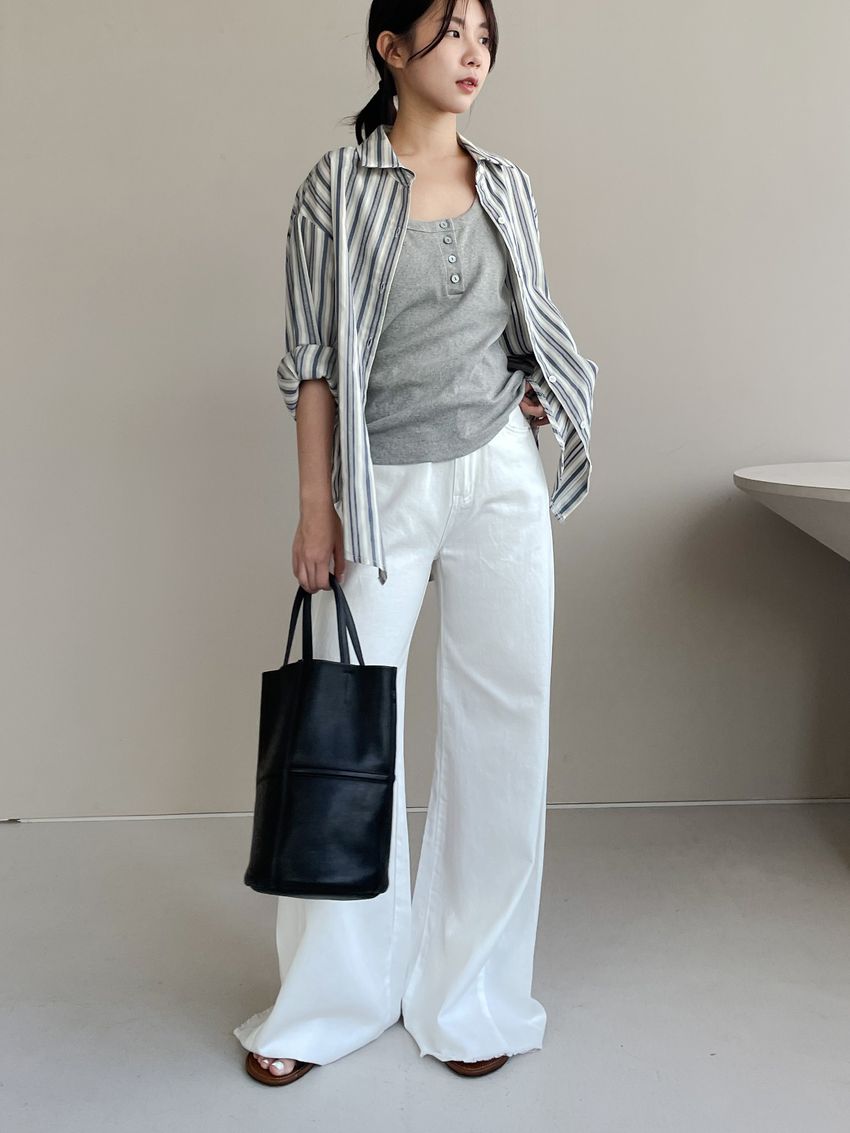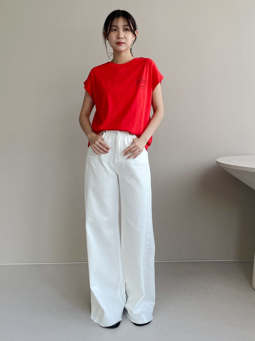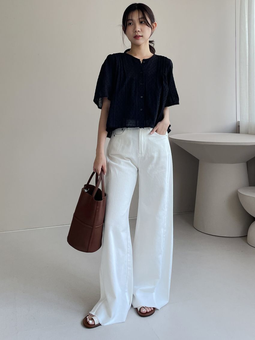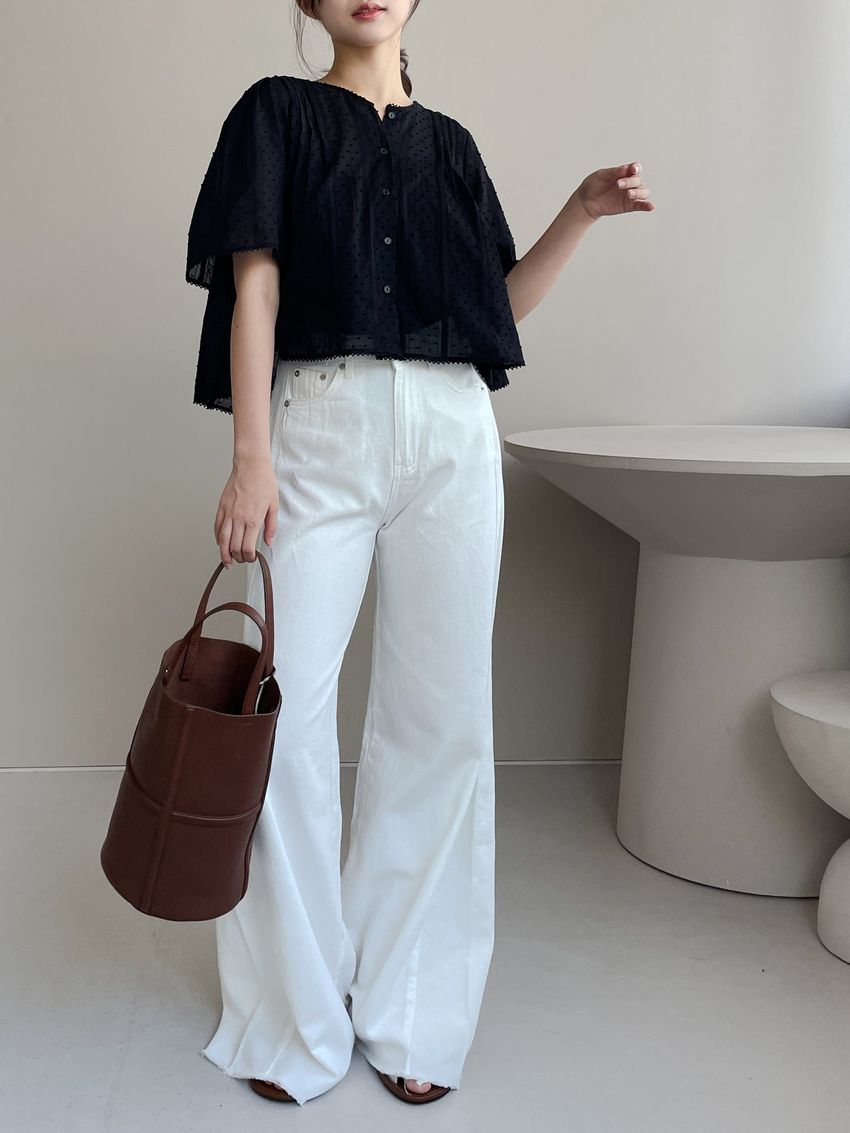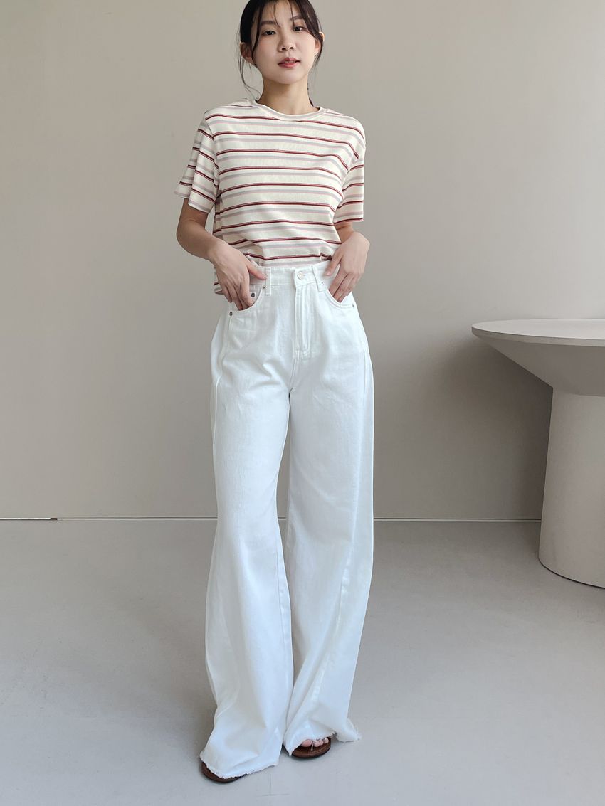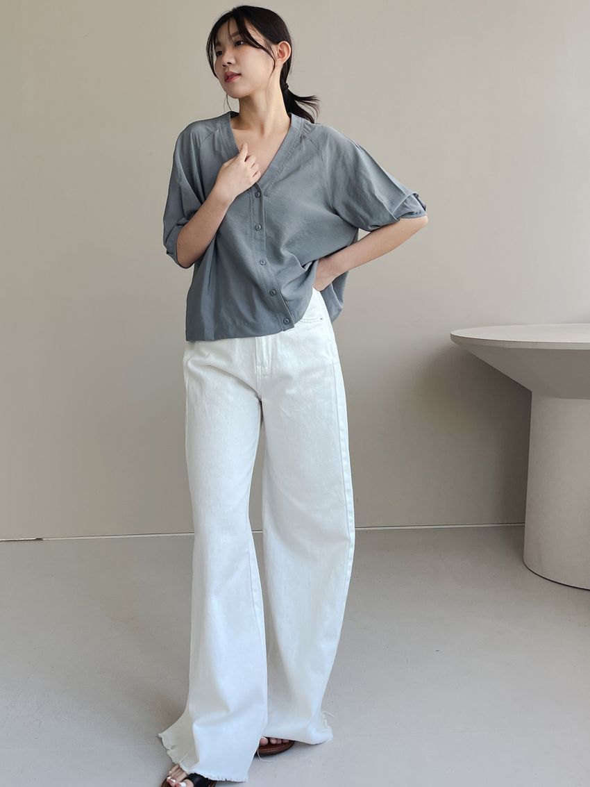 100%cotton跟P2407015相比 這款的褲管A字比較小一點中高腰 A版型的褲管視覺上腰線起始位置比較高 有拉長比例長腿效果夏季薄軟料的丹寧 很輕薄舒服褲腳抽鬚不收邊布料無彈性
