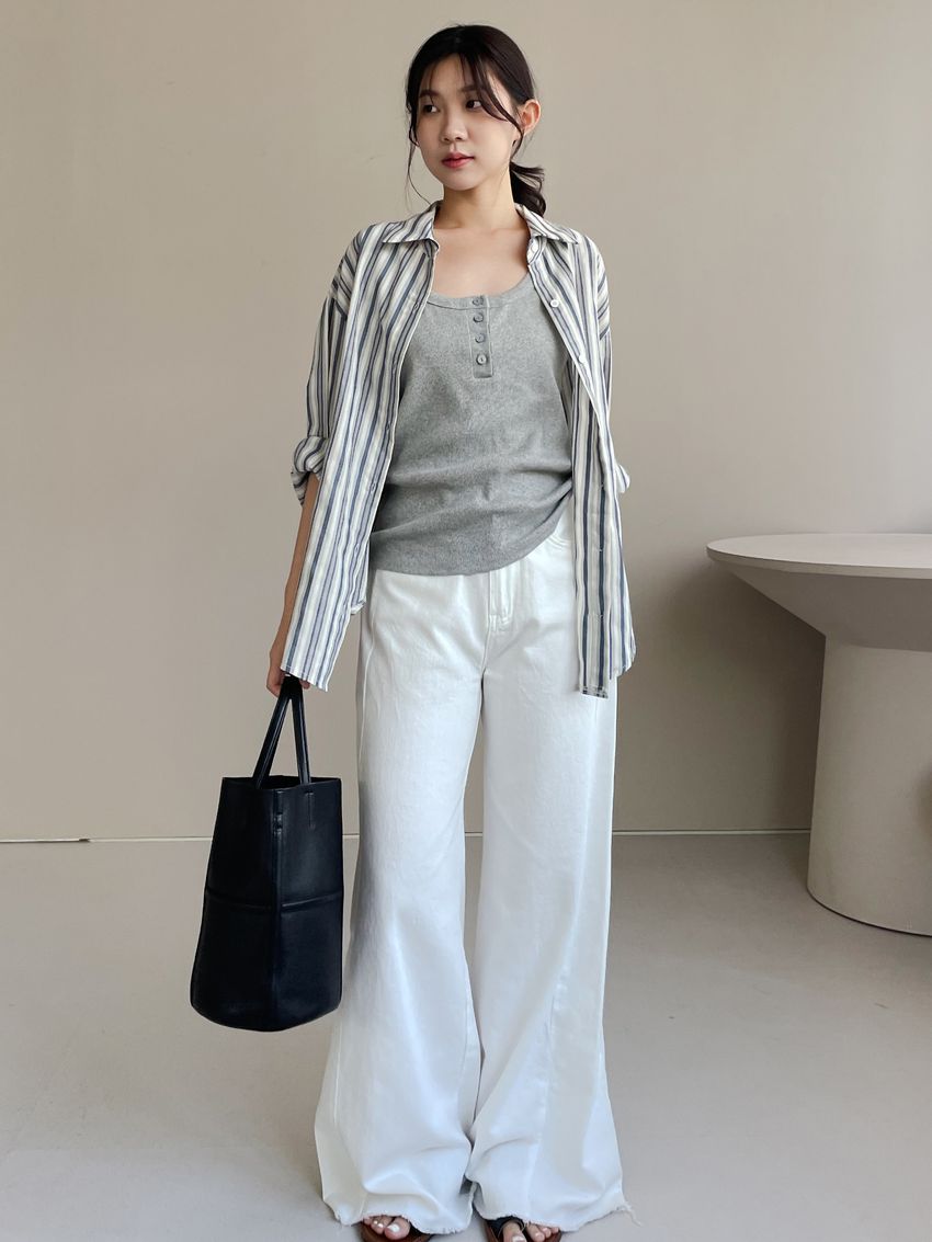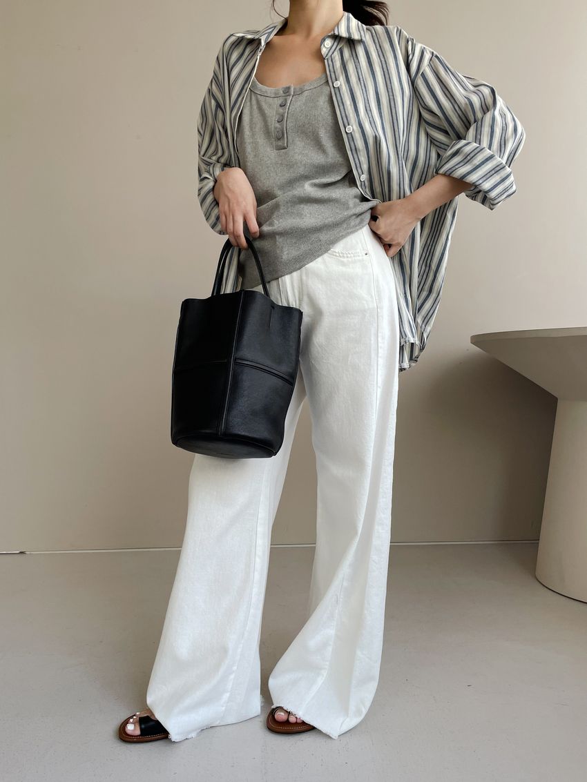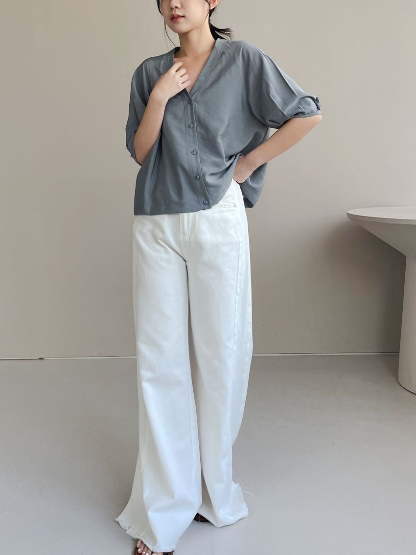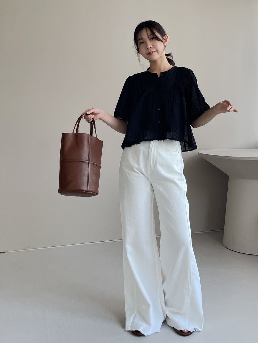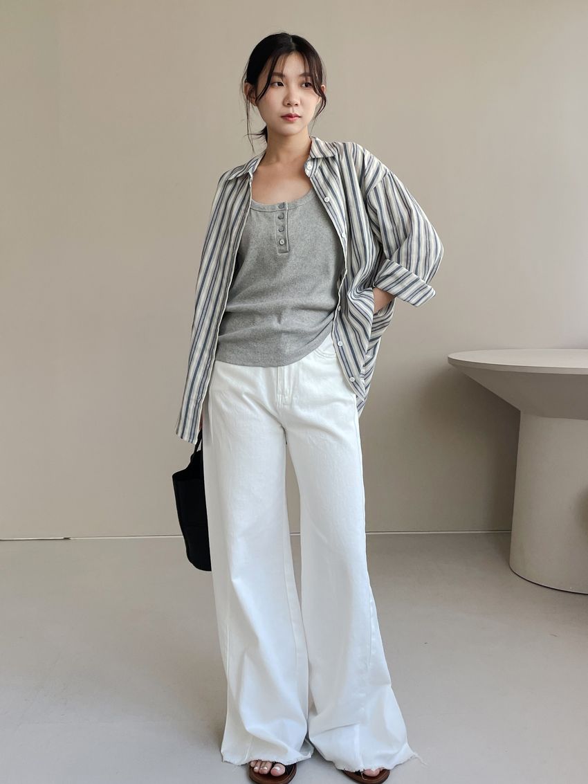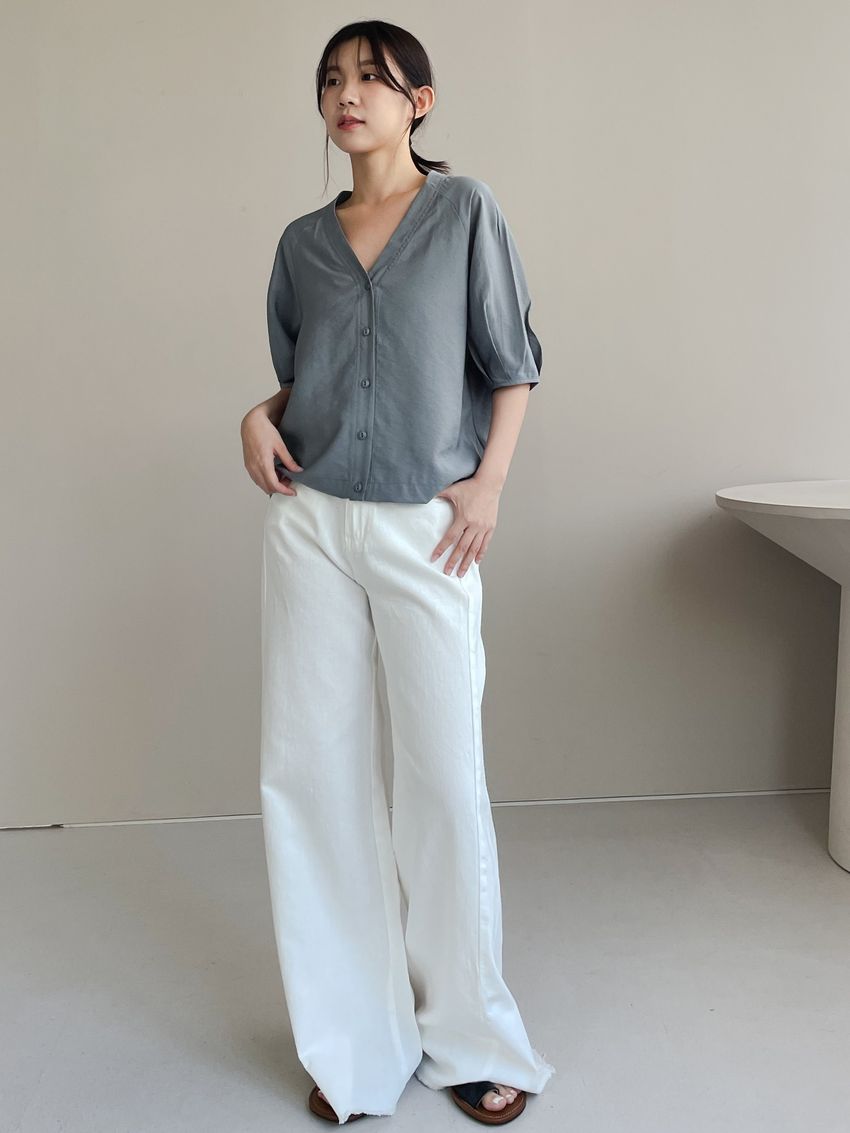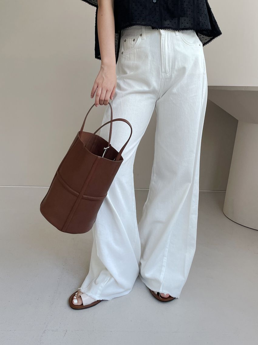 100%cotton跟P2407015相比 這款的褲管A字比較小一點中高腰 A版型的褲管視覺上腰線起始位置比較高 有拉長比例長腿效果夏季薄軟料的丹寧 很輕薄舒服褲腳抽鬚不收邊布料無彈性