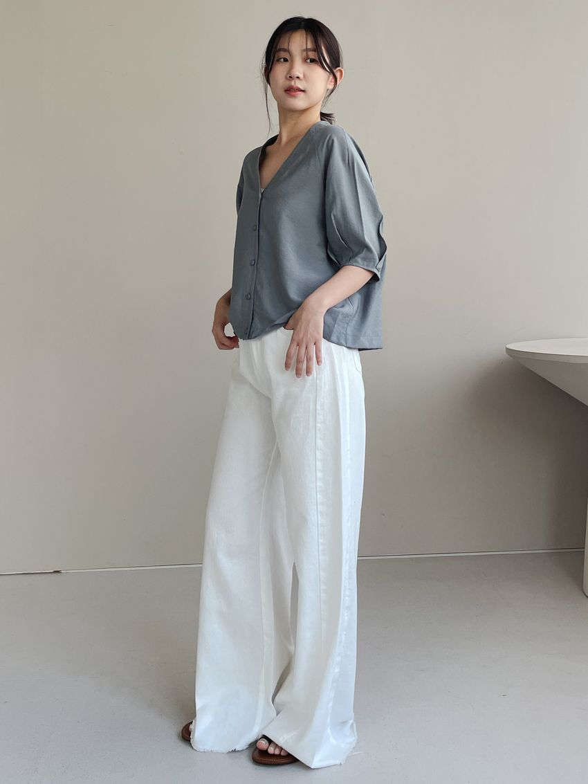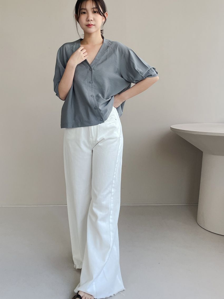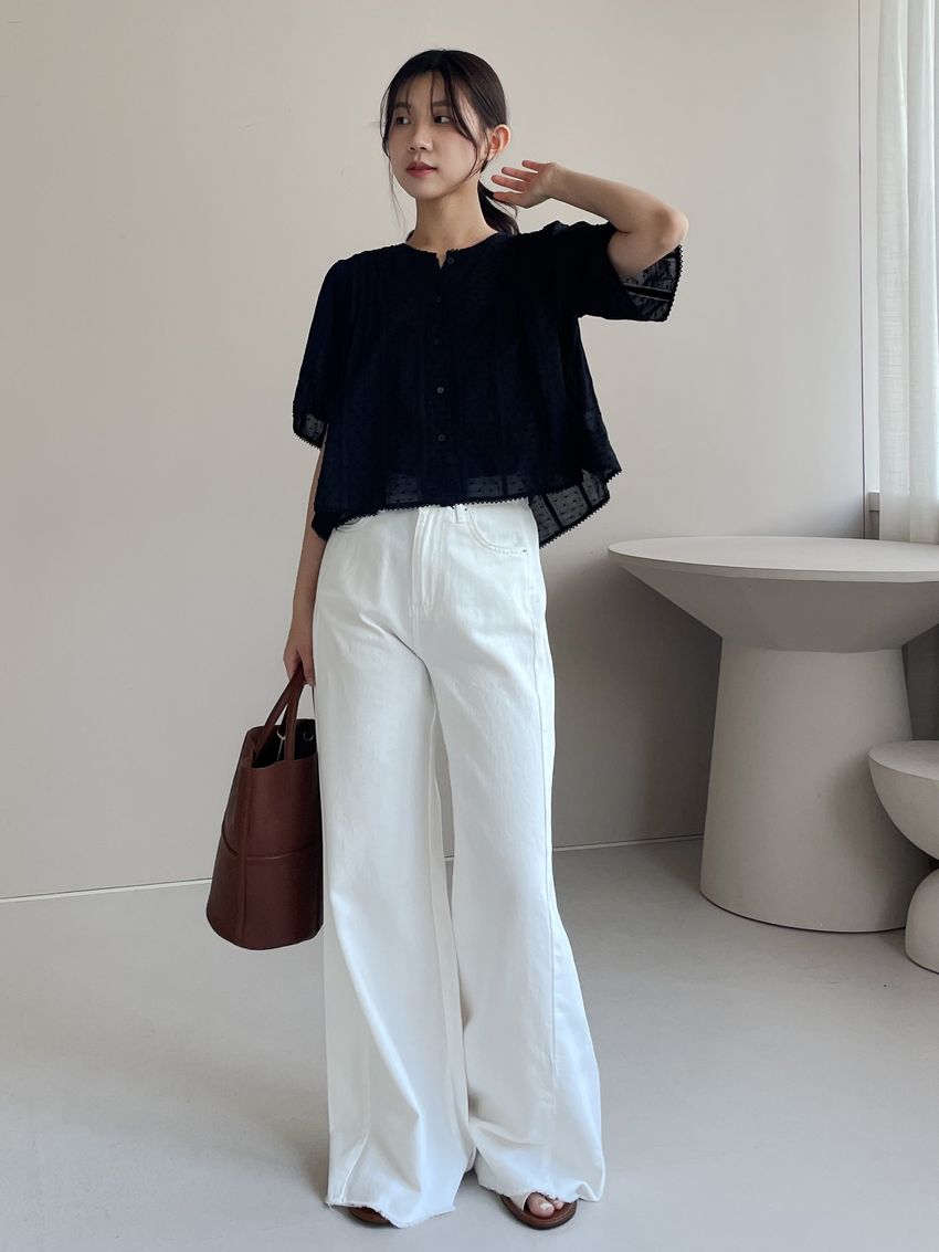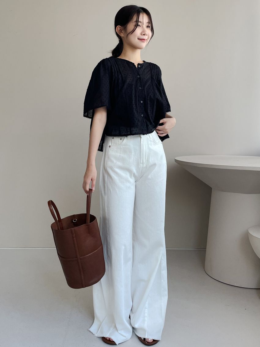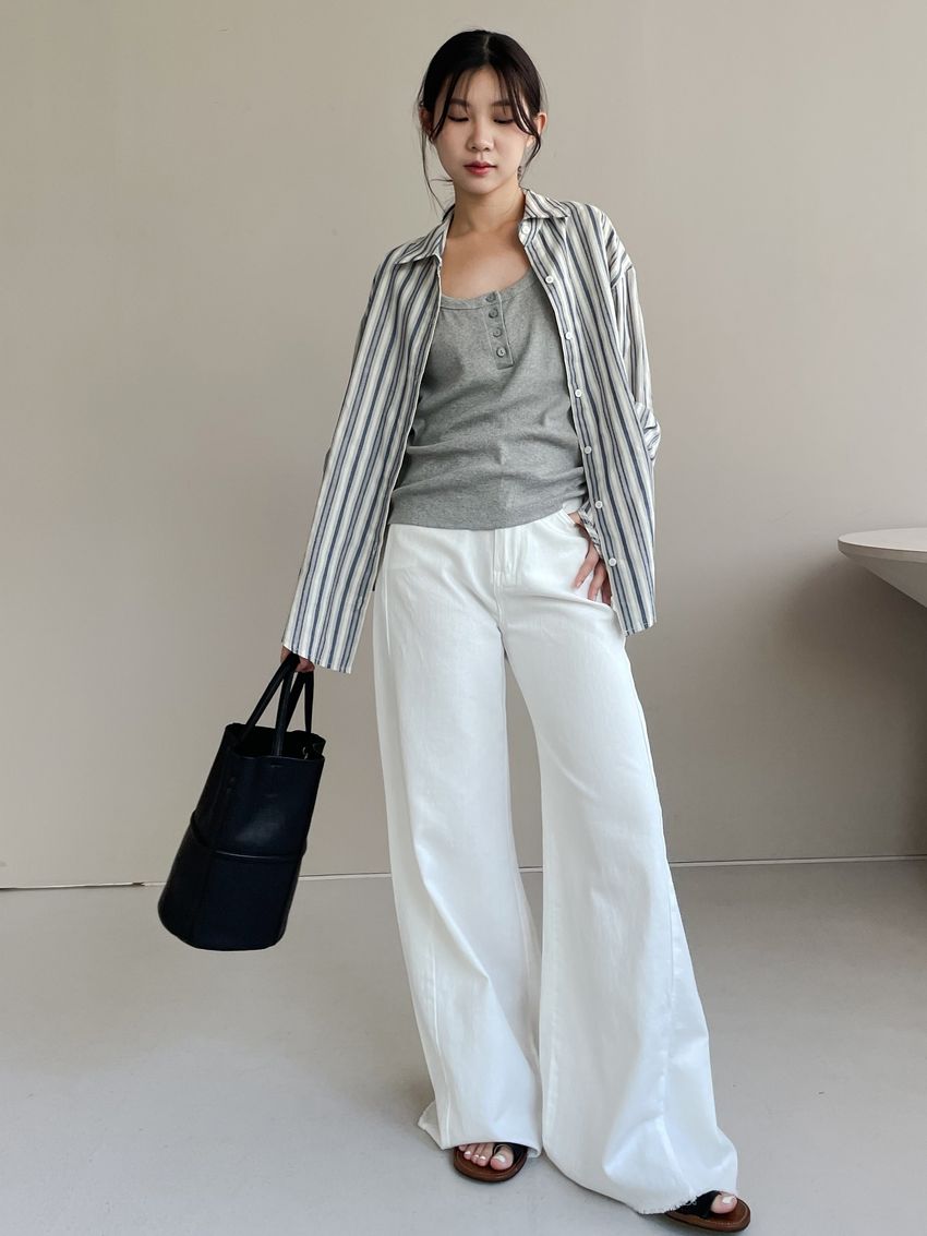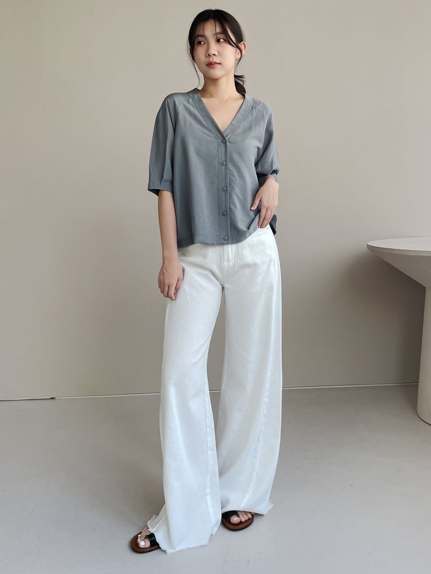 100%cotton跟P2407015相比 這款的褲管A字比較小一點中高腰 A版型的褲管視覺上腰線起始位置比較高 有拉長比例長腿效果夏季薄軟料的丹寧 很輕薄舒服褲腳抽鬚不收邊布料無彈性