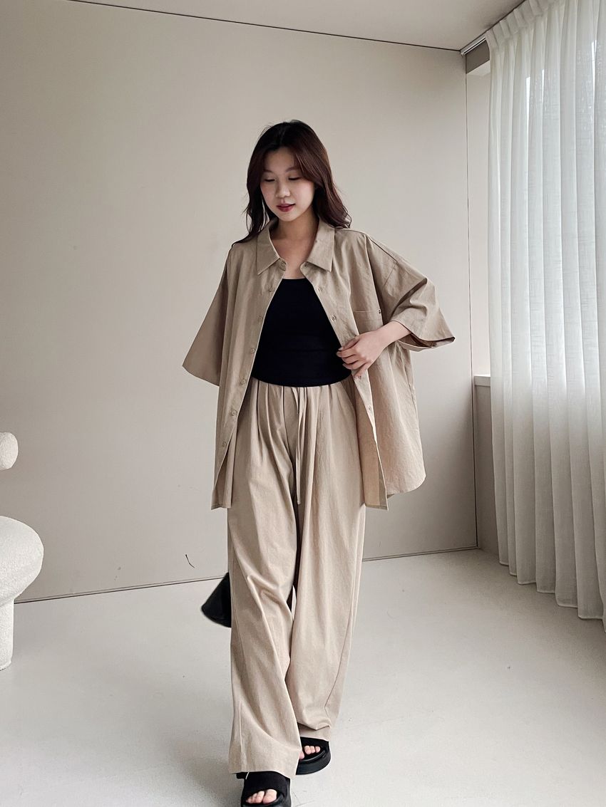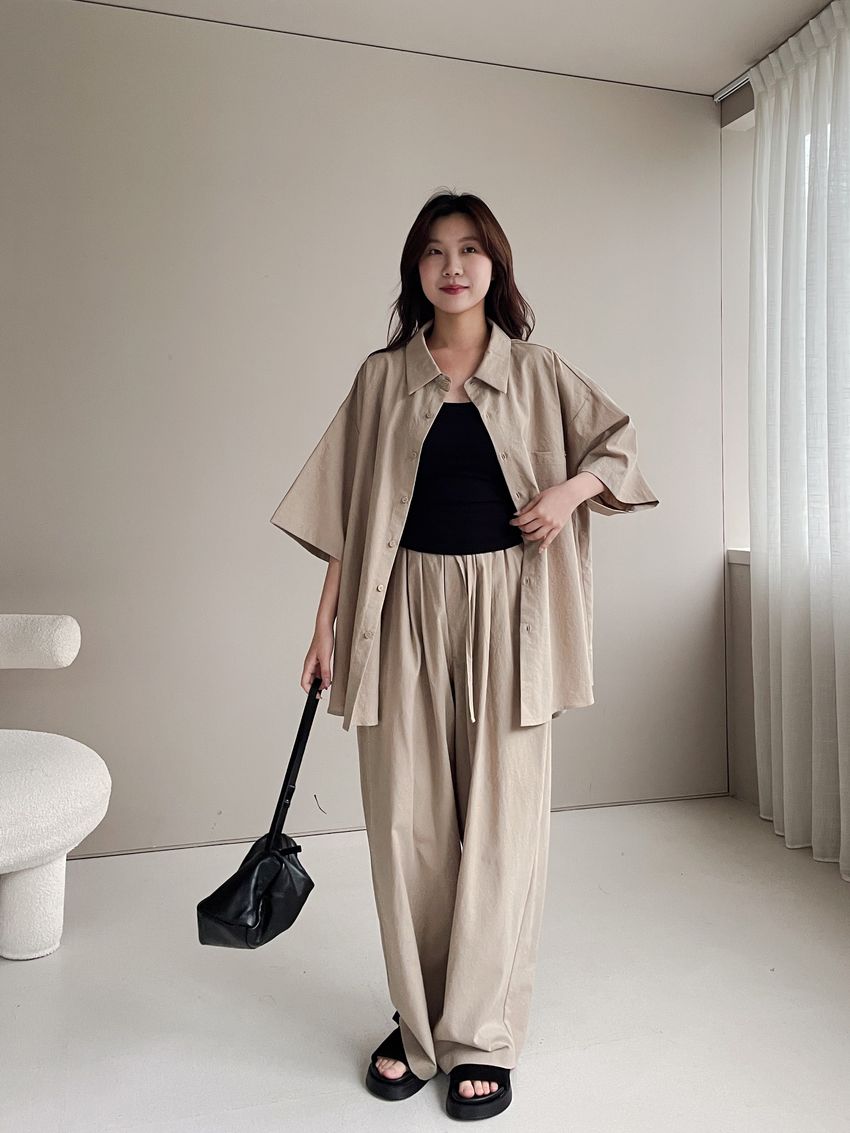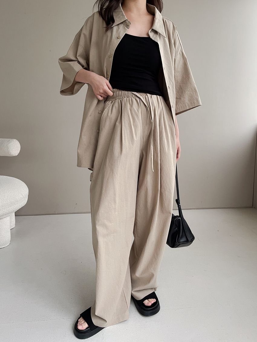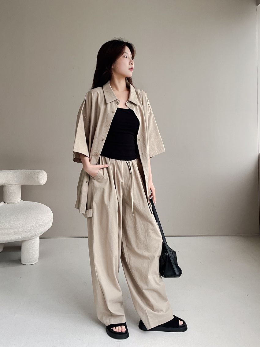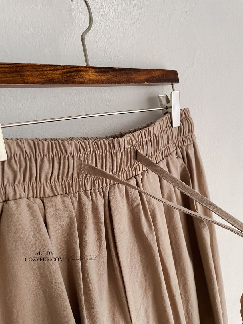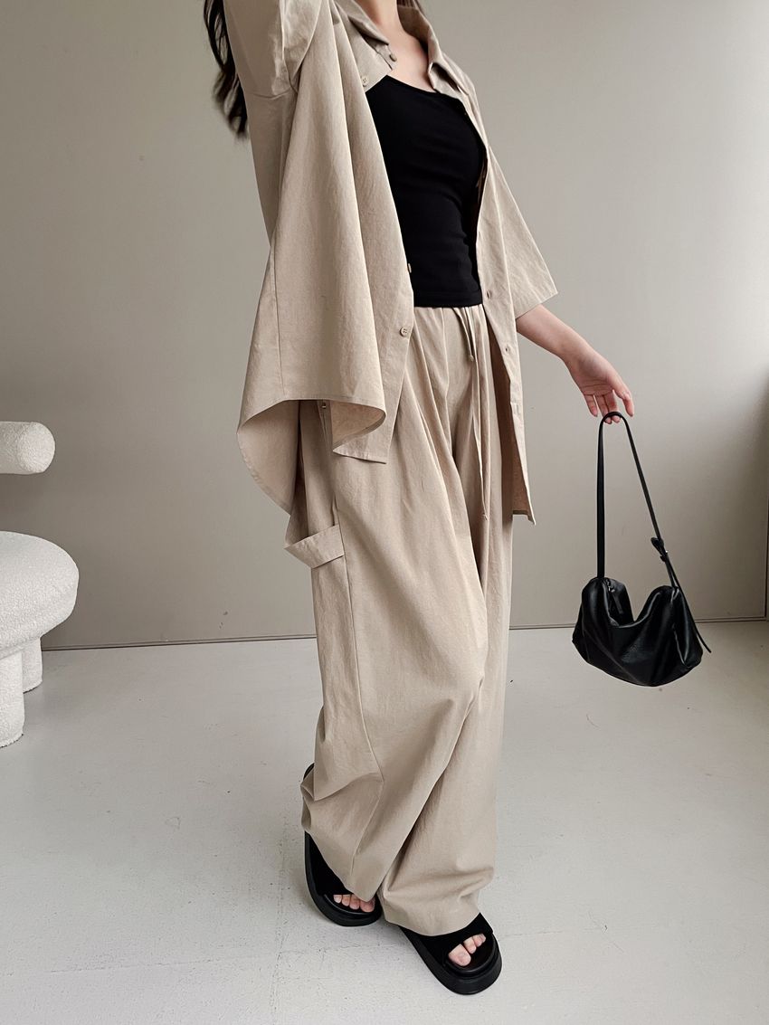 > 釘釦鬆緊腰落地寬褲(特)
