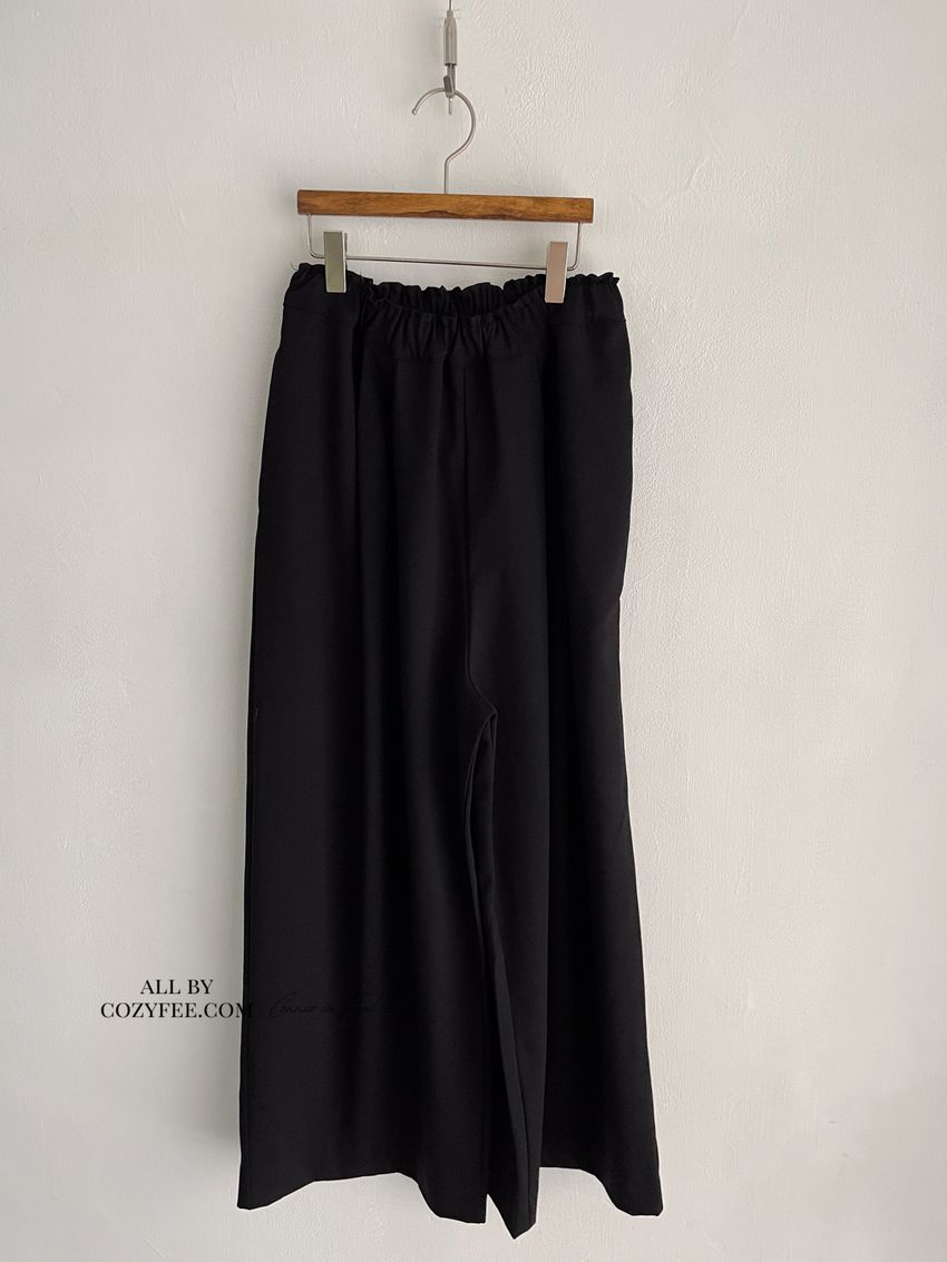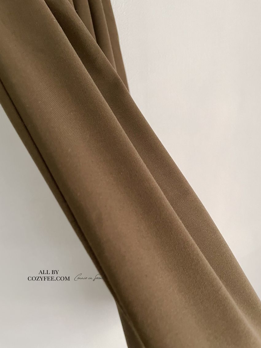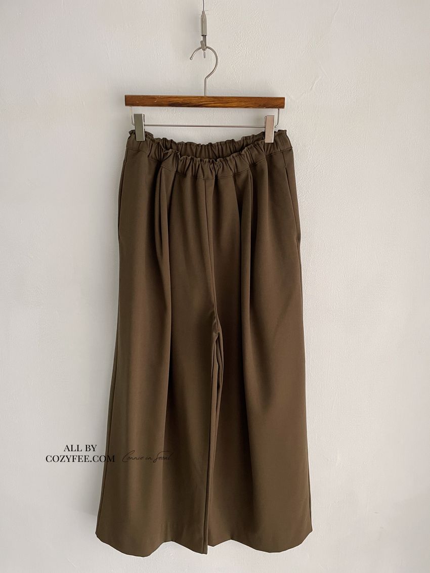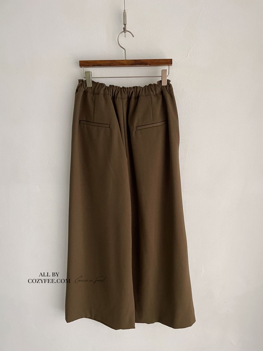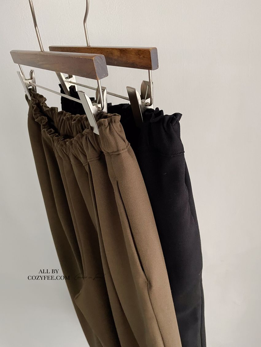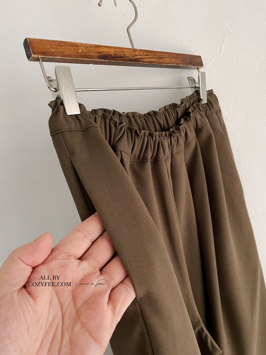 5%wool 20%rayon 5%tencel 65%poly 5%span遮肉修飾感很好基本老爺褲版型褲型線條簡單 搭配度非常好柔軟中帶挺度的厚雪紡腰圍整圈鬆緊彈性布料微微彈性 滿分5分約1分黑色 / 咖綠色單一尺寸 建議S號~L號 以內 身型適合model / Yen - 159cm / 44kg 腰24 臀34