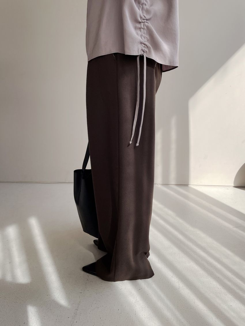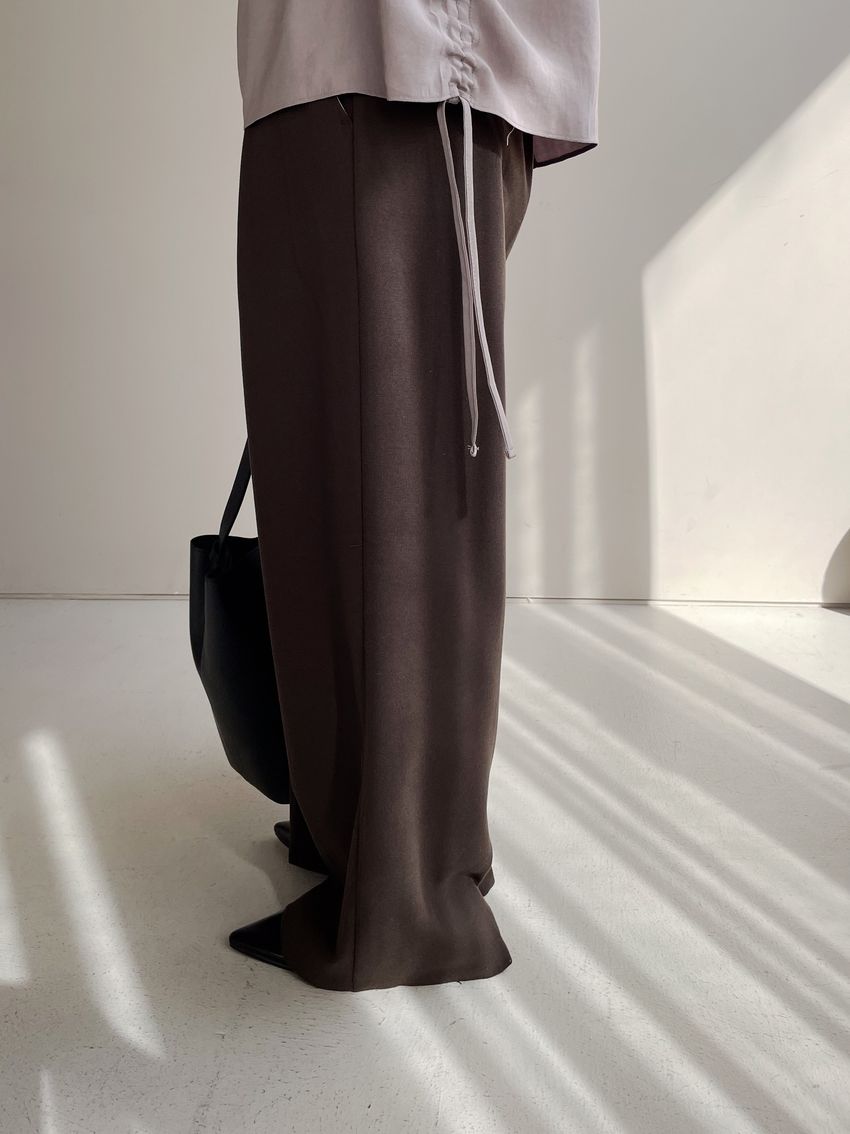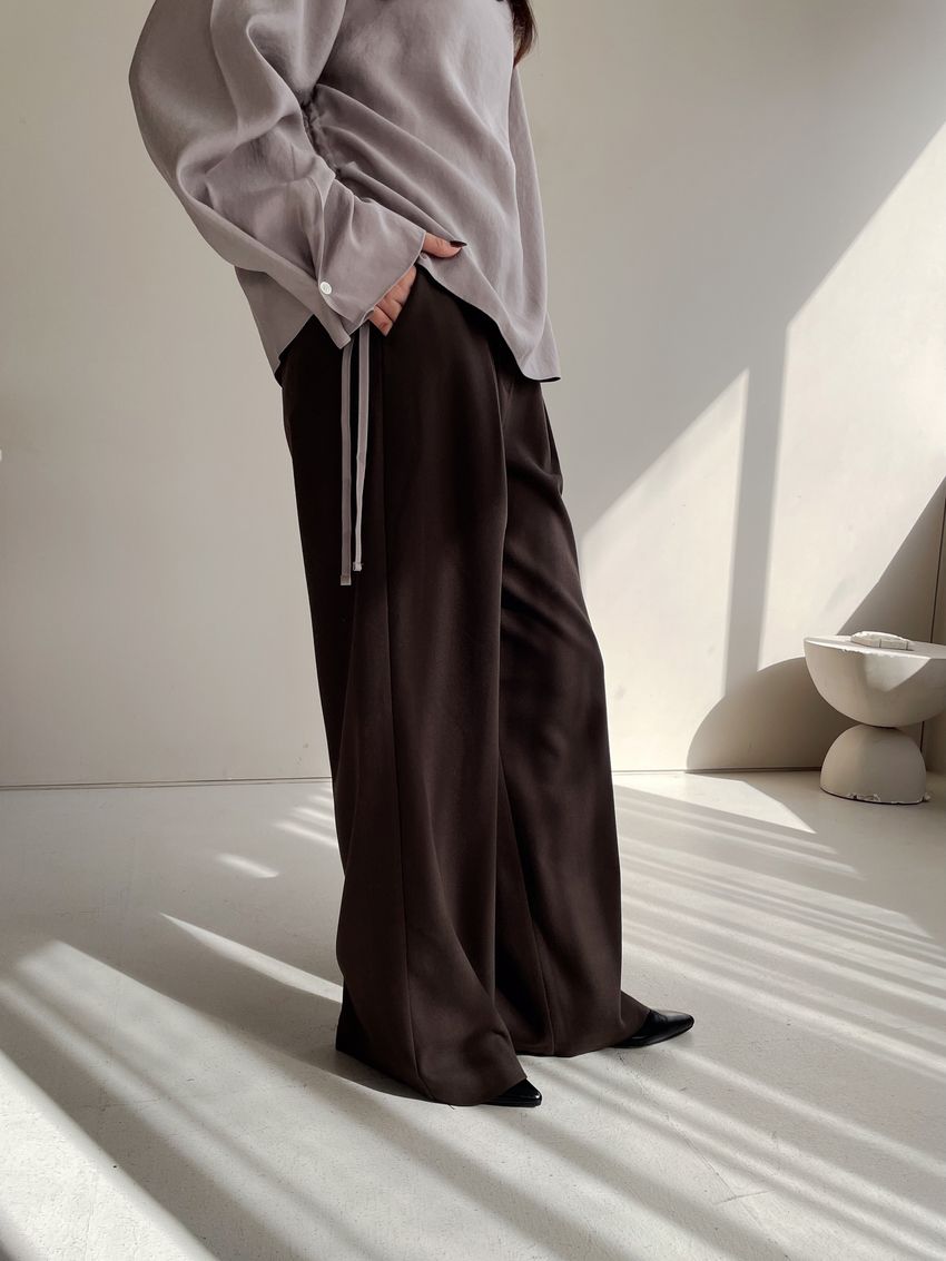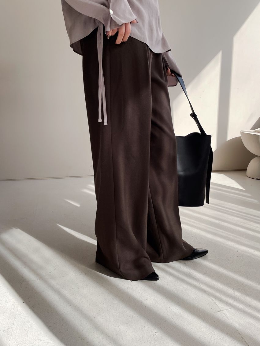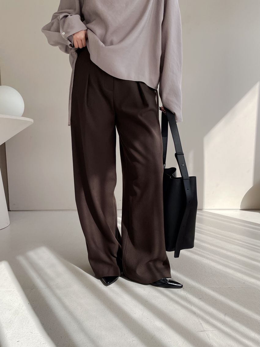 76%tencel 22%rayon 2%span隱藏無褲頭 褲頭為勾釦設計後腰鬆緊 落地西裝寬褲版型布料有微微彈性 滿分5分約1分奶茶棕色 / 深咖啡色單一尺寸 建議S號~M號 以內 身型適合model / Yen - 159cm / 44kg 腰24 臀34