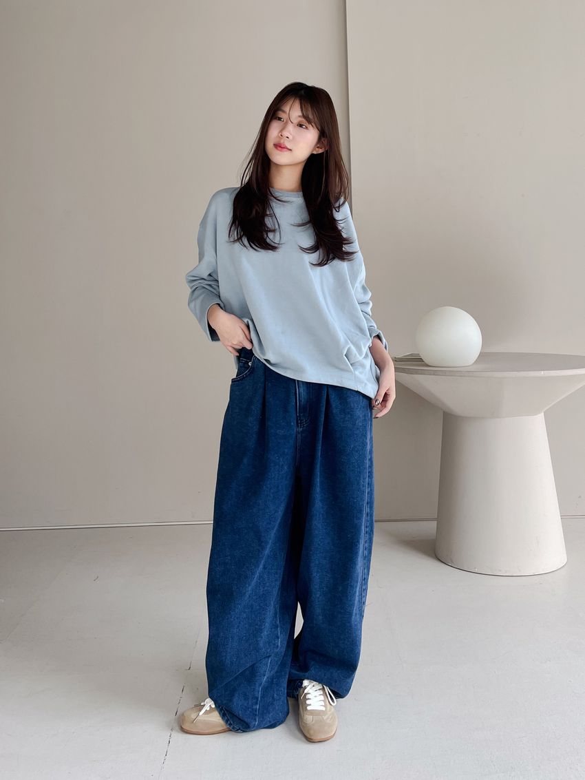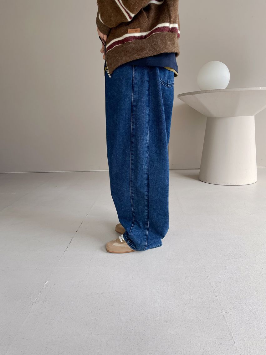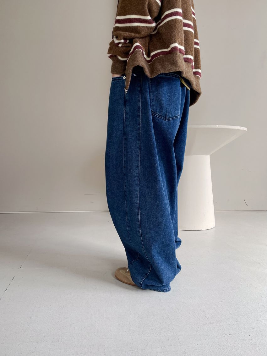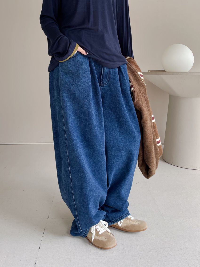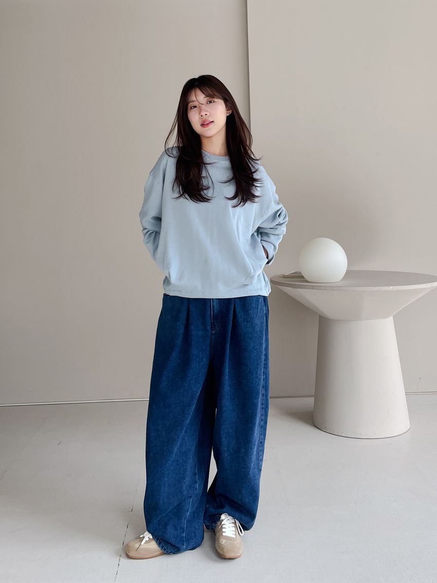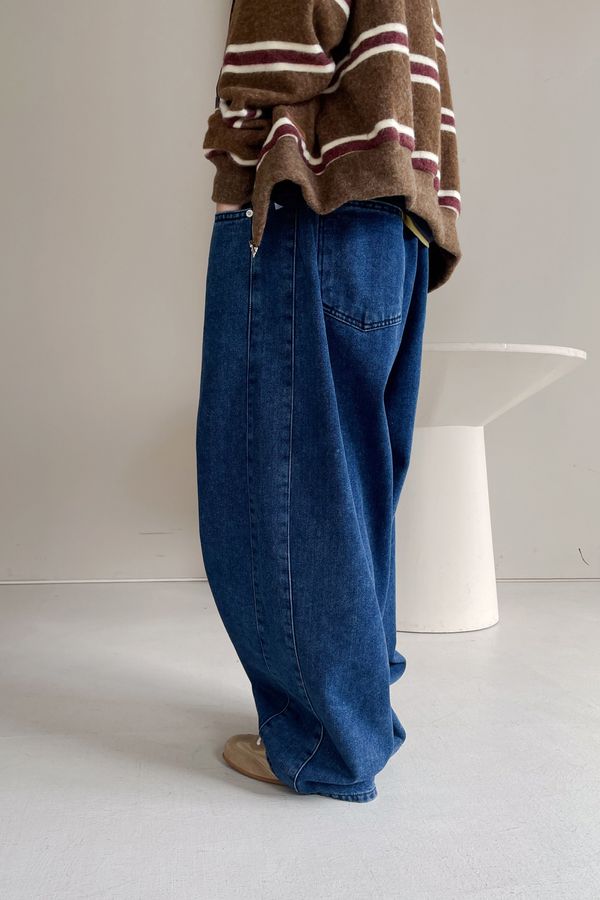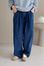 100%cotton寬鬆上寬下窄錐形褲型整體比較寬大鬆鬆的個性感後腰鬆緊 內層薄薄磨毛布料無彈性深藍色 / 淺藍色單一尺寸 建議S號~L號 以內 身型適合model / Yen - 159cm / 44kg 腰24 臀34