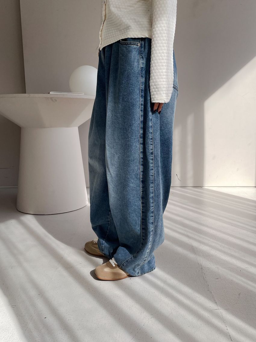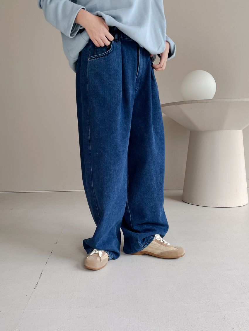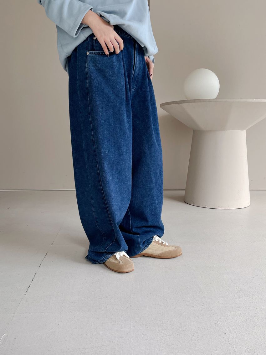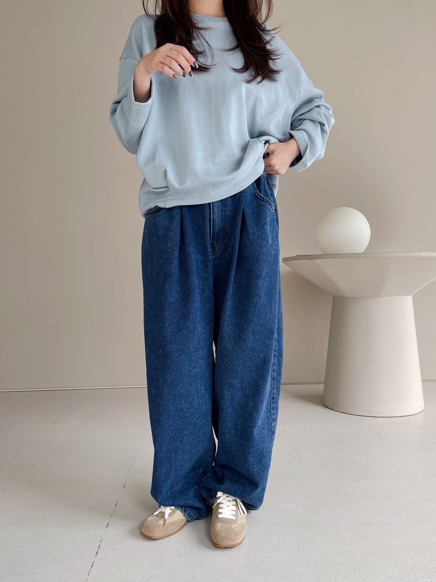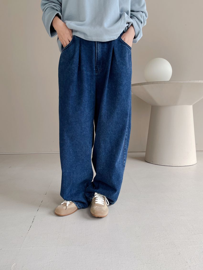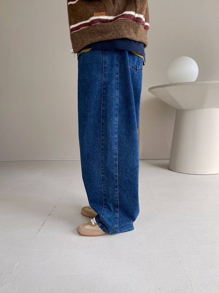 100%cotton寬鬆上寬下窄錐形褲型整體比較寬大鬆鬆的個性感後腰鬆緊 內層薄薄磨毛布料無彈性深藍色 / 淺藍色單一尺寸 建議S號~L號 以內 身型適合model / Yen - 159cm / 44kg 腰24 臀34