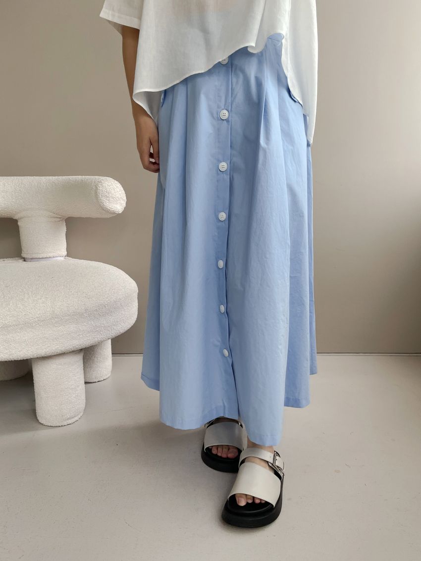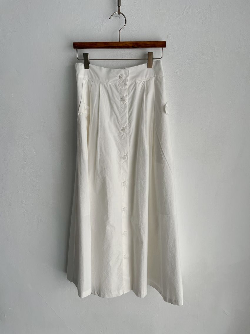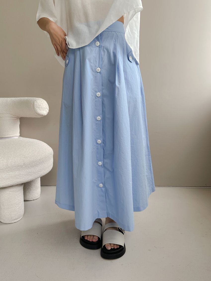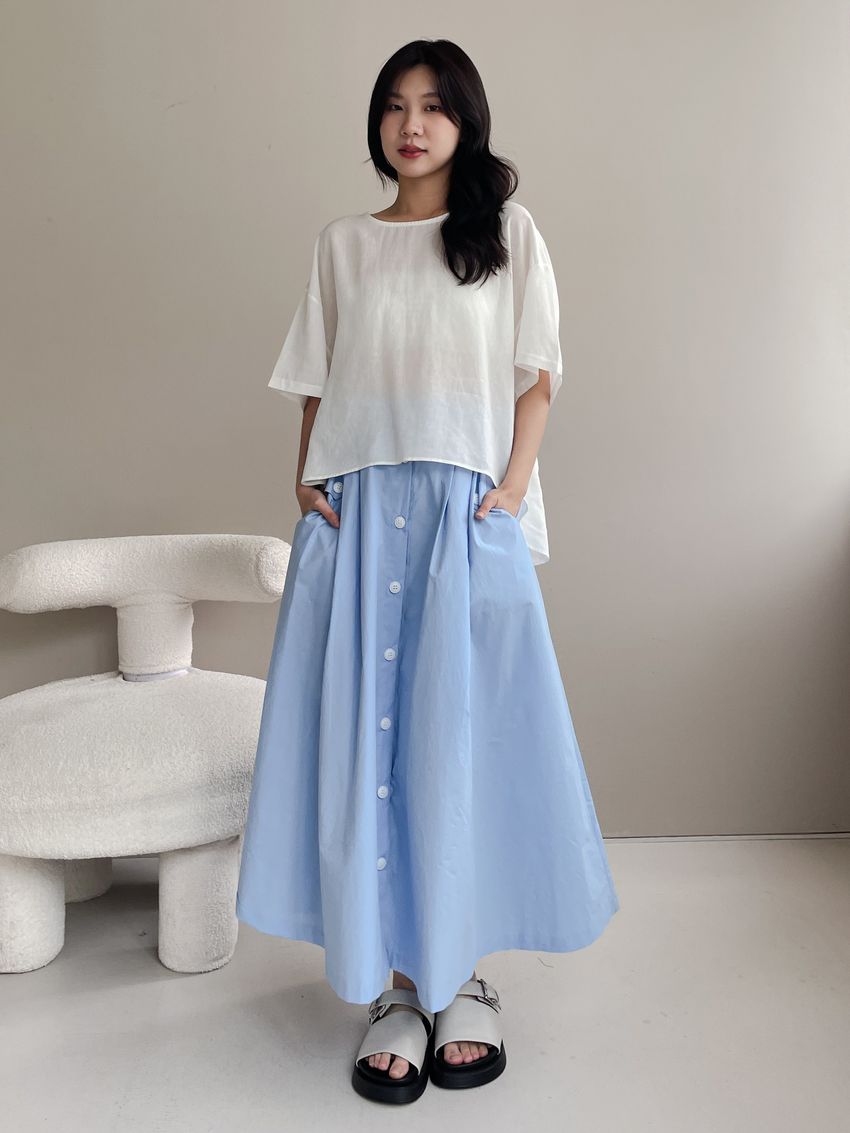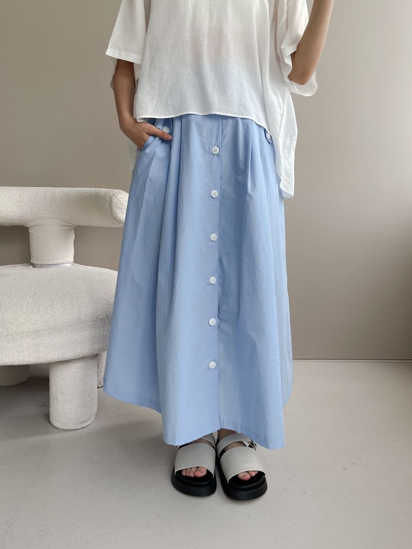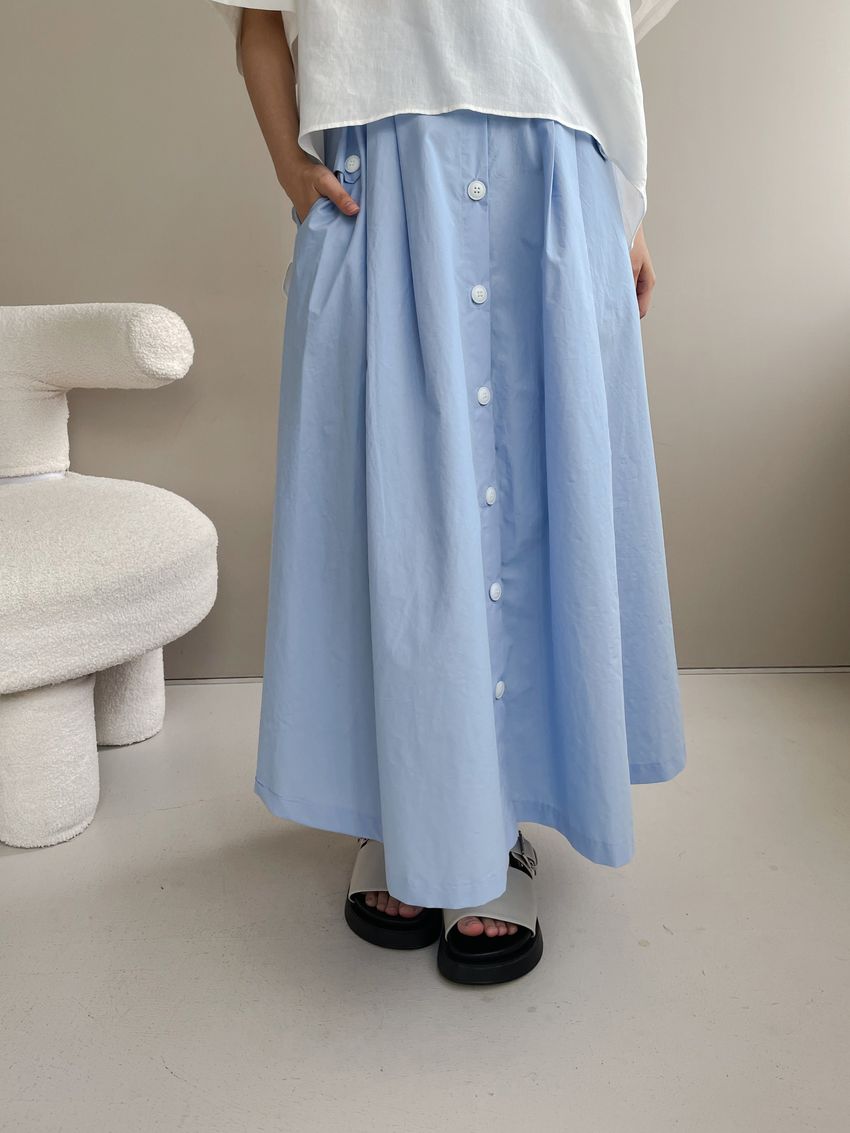 100%cotton裙襬夠圓帶點澎澎感的圓長裙搭配白釦帶出夏天的清爽感薄料棉質 帶有挺度兩側口袋 後腰鬆緊有內裡 前排釦穿脫白色建議搭配淺色或膚色內褲白色 / 水藍色單一尺寸適合S~L號 腰圍29吋以內身形model / Yen - 159cm / 44kg 腰24 臀34