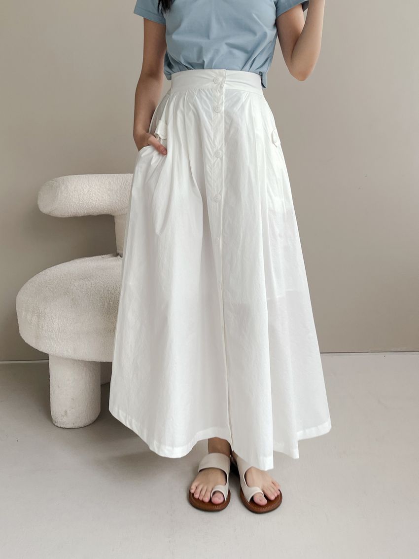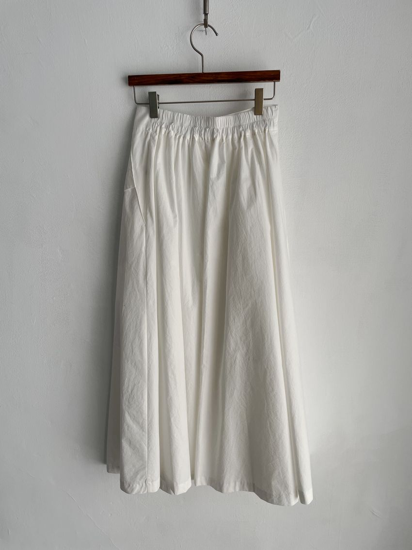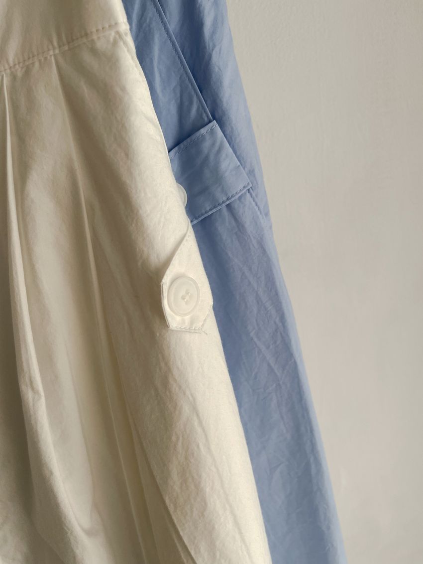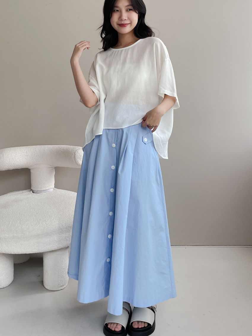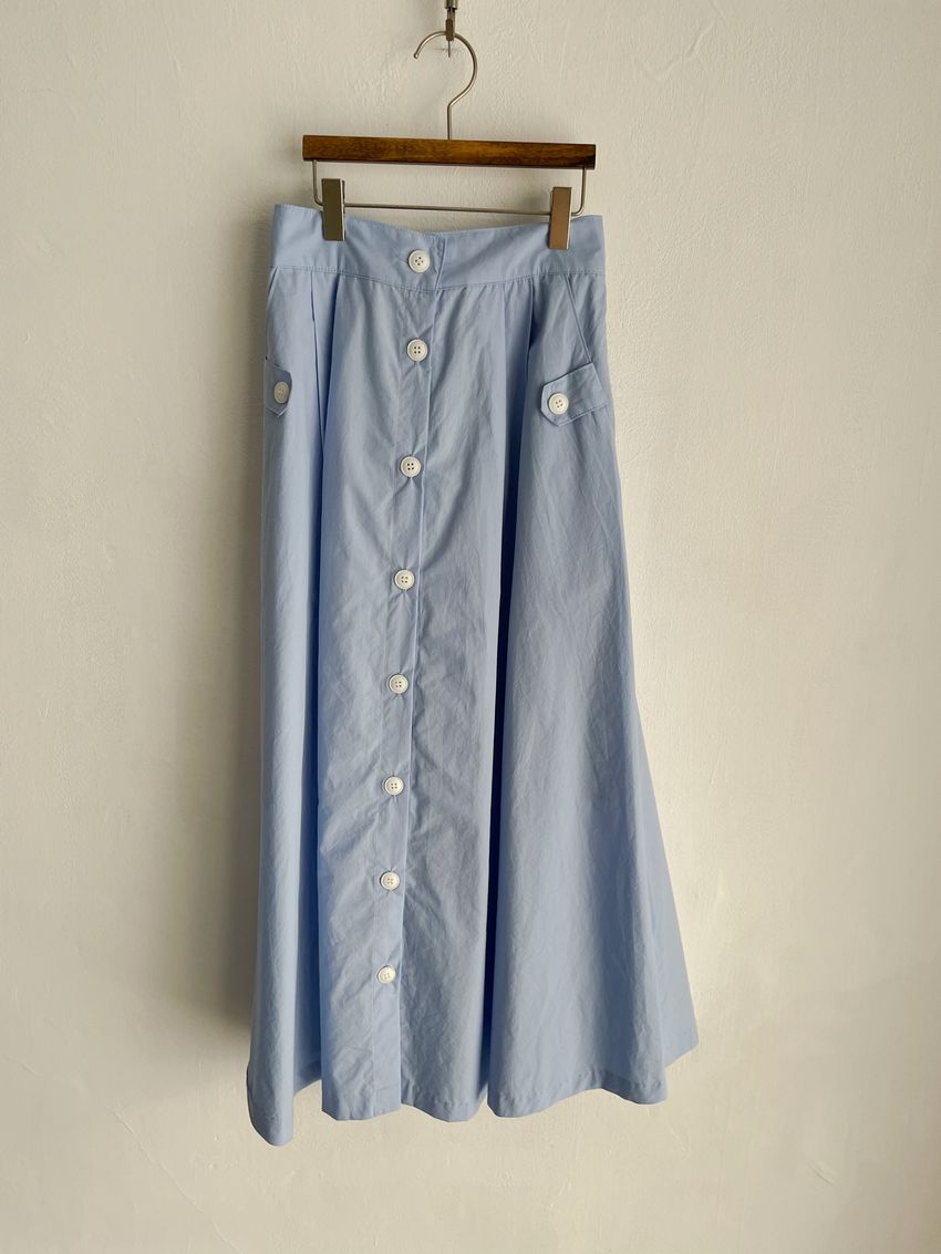 100%cotton裙襬夠圓帶點澎澎感的圓長裙搭配白釦帶出夏天的清爽感薄料棉質 帶有挺度兩側口袋 後腰鬆緊有內裡 前排釦穿脫白色建議搭配淺色或膚色內褲白色 / 水藍色單一尺寸適合S~L號 腰圍29吋以內身形model / Yen - 159cm / 44kg 腰24 臀34